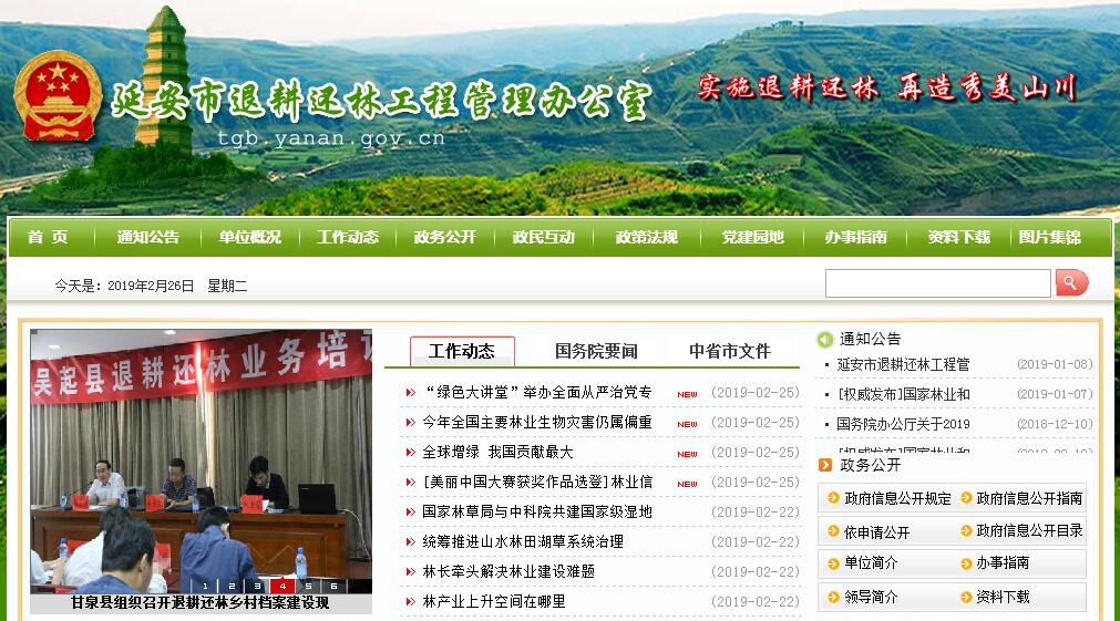 延安市退耕还林工程管理办公室成立于2003年1月,是市政府主管全市退耕还林工作的行政机构,县级建制,内设政秘科、综合科、规划计划科、工程管理科、督查检查科5个科室,编制32名。其主要职责:一是负责拟定全市退耕还林工程建设和成果巩固方面的地方性政策、规程、标准、办法,并负责监督实施;二是组织编制全市退耕还林总体规划、中长期规划和年度计划,指导县区编制退耕还林规划、实施方案、作业设计并监督实施;三是负责开展全市退耕还林年度综合考核,工程建设进度和质量的监督检查工作;四是完成退耕还林政策兑现的监督检查、矿产资源开发和基本建设等项目征占用退耕还林地的审核、审批、收费等工作,协助中省有关部门完成工程实绩复查和核查工作;五是负责退耕还林工程实施区域内的封山禁牧、人为破坏植被、复垦等违法案件的查处,退耕还林信访案件的调查处理等工作。成立8年来,全体干部在单位班子的带领下,团结一致、积极进取,出色的完成了上级交办的各项任务。2007年,国家林业局授予延安市退耕办“全国退耕还林先进单位”荣誉称号。2008年,延安市委、市政府授予市退耕办“延安市先进集体” 荣誉称号,单位记集体二等功。2009年延安市退耕办又被评为全市目标责任考核优秀单位。