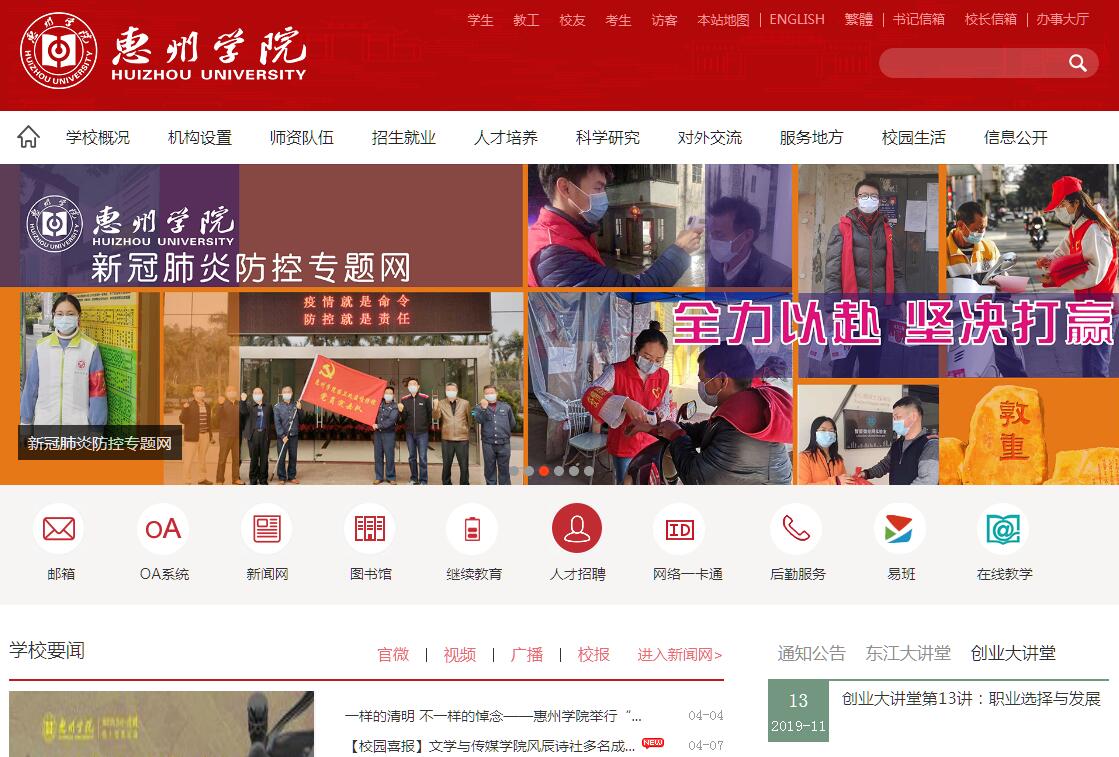 惠州学院是广东省属公办综合性本科大学、省首批普通本科转型试点高校、省市共建本科高校、省硕士学位授予立项建设单位、省第二批省级双创示范基地、省创建国家教师教育创新实验区立项建设院校。学校占地总面积2476.1亩,建筑面积39.21万平方米。面向全国23个省(市、自治区)招生,现有全日制在校生达1.6万人,成人高等学历教育学生达1万人。扎根地方,底蕴深厚成效突出。学校前身为1946年创办的广东省立惠州师范学校,1978年升格为惠阳师范专科学校,90年代与西北纺织工学院惠州分院、惠州教育学院合并成立专科层次的惠州大学,2000年升格为全日制普通本科院校。办学72年来,学校始终坚持服务国家需要、社会需求的,薪火相传,继往开来,形成了“阆苑储英 人竞向学”的校训和“敦重明辨 求真致用”的大学精神,为国家和社会培养和造就了近15万名毕业生,成为东江流域高级应用型人才的摇篮,为地方尤其是惠州经济社会发展提供了强劲的人才支撑、智力支持。育人为本,教育教学成果丰硕。学校目前设有18个二级学院、33个研究机构,开设54个本科专业,涵盖理学、工学、农学、文学、法学、经济学、历史学、管理学、教育学、艺术学等十大学科门类。有国家级特色专业、省级特色专业、省级综合改革试点专业14个。学校贯彻“共商专业规划、共议课程体系、共组师资队伍、共建学习环境、共搭实践平台”的“五共”合作理念,大力实施校政行企合作、产教融合育人的人才培养模式,不断完善实验教学、实习实训、毕业论文(设计)、创新创业教育、课外科技活动、社会实践全过程相互联系的实践教学体系。努力推进“一县(区)一特色产业学院”建设,围绕地方支柱产业筹建电子信息产业学院、精细化工产业学院、鞋包产业学院、旅游与健康产业学院等特色产业学院以及惠州学院大亚湾化工研究院,已成立旭日广东服装学院、惠州学院仲恺信息学院。学校拥有广东省首批协同育人平台——卓越法律人才协同育人平台,拥有广东省实验教学示范中心10个,国家级大学生校外实践教学基地、省级大学生校外实践教学基地、省级人才培养模式创新试验区17个,拥有光电产业关键技术协同创新中心、大数据协同创新中心、新一代IT协同创新中心等一批校政行企共建的协同创新中心,获得国家级教学成果奖、省级教学成果奖10项。近年来,学生在省级以上学科竞赛累计获奖千余项,在美国数学建模竞赛、全国电子设计大赛、全国大学生嵌入式设计大赛、全国师范院校师范生教学技能大赛、全国智能汽车总决赛等国内外大赛中荣获殊荣。毕业生素以“下得去、留得住、干得好”深受用人单位的青睐,2017年,我校毕业生就业率96.86%。特色鲜明,学科科研结构优化。学校瞄准惠州市创新驱动发展战略,紧密对接“2+2+N”现代产业体系的战略布局,建有省级优势重点学科、省级特色重点学科3个,建成或在建高层次科研创新平台51个,包括:广东省重离子加速器工程技术研究中心、惠州市非开挖工程检测与修复技术重点实验室等2个院士研究平台,广东省服装协同创新发展中心等11个省级科研平台,惠州学院-乌克兰国立技术大学联合研究院。拥有新型研发机构6个、新型智库4个。先后获“中国产学研合作促进奖”等省部级以上科研奖励5项。夏佳文院士领衔、依托学校“重离子加速器研发中心”组建的离子治疗癌症肿瘤装置研发团队,入选广东省“珠江人才计划”引进第六批创新创业团队。师资优良,国际合作日益深化。现有专任教师780名,其中教授(正高)102名,副教授(副高)253名,博士268名。现有双聘院士3名,柔性引进长江学者特聘教授1名、中组部国家“千人计划”人才1名,享受国务院特殊津贴教师2名,全国优秀教师1名,广东省“千百十人才工程”省级培养对象9名,广东省“教学名师”2名,南粤优秀教师10名,“天鹅计划”领军人才1名;广东省优秀教学团队、广东省高校创新团队10个;聘请59位国内著名专家学者为客座教授,聘请一批行业企业专家进校园协同培养人才。学校坚持国际化办学,同美国、英国、德国、澳大利亚、新西兰、俄罗斯、乌克兰、日本、韩国、新加坡、马来西亚和印度尼西亚等 12个国家以及港澳台地区40多所高校建立合作关系;与乌克兰国立技术大学共建联合研究院,与马来西亚理工大学开展年度双边联合研讨会,与香港旭日集团、香港制衣业训练局深度协同办学;引进国(境)外科研团队、管理团队4个,聘请来自美国、英国、加拿大、爱尔兰、意大利、日本、韩国等国家的外籍教师以及香港和台湾地区的教师近30名。近三年,共派出500多名学生赴国(境)外参加交流学习、实习、社会调研、培训、国际会议、学科竞赛、汉语支教和文艺演出等活动,派出200多名教师赴国(境)外开展访学、研修、培训、联合研究、国际会议、汉语国际教育等活动。强化应用,服务能力稳步增强。学校主动对接行业和主导产业链的应用研究体系,拓宽应用研究信息交流与共享渠道,提升服务地方创新驱动发展能力和水平。近两年,遴选64项科研成果参加中国高校科技成果交易会,成功签约136项次。与哈尔滨工业大学、华中科技大学分别签约“空间环境地面模拟装置低能区冷却水系统”“HUST-PTF束线磁铁样机研制”等高层次重大项目,并与北京大学联合申报国家科技部重大仪