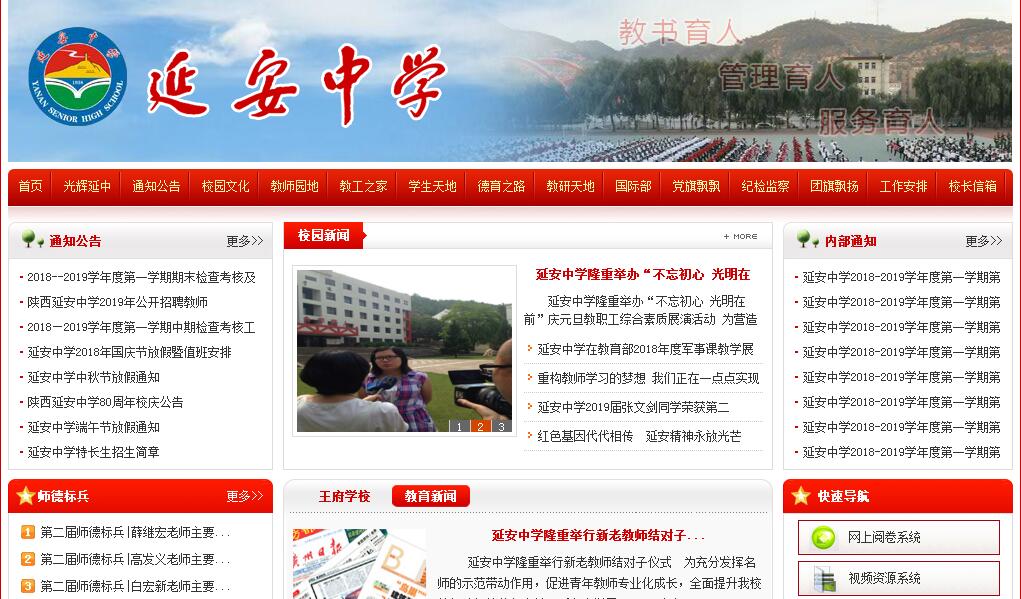 | 网站简介: 延安中学创建于1938年8月,1978年被列为全国首批办好的重点中学,现为市直省级示范高中。学校有两个校区,学校占地329亩(校本部98亩,枣园校区231亩),总建筑面积13.45万平方米(校本部3万平方米,枣园校区10.45万平方米)。现有113个教学班,7300余名学生,447名教职工,其中特别教师8名,高级教师176名,具有研究生学历的49名,获省部级以上荣誉称号的15名。 |