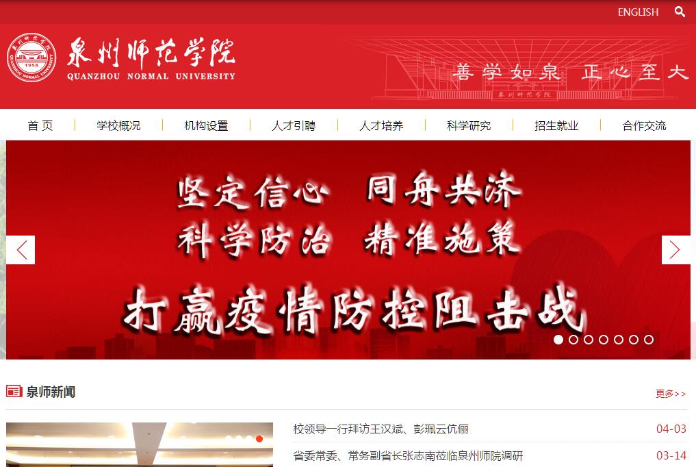 泉州师范学院坐落在福建省泉州市。泉州是福建省三大中心城市之一、首批中国历史文化名城、首届东亚文化之都、古代海上丝绸之路起点、经济总量连续19年位居全省首位。现有三个校区:东海校区、诗山校区和江南校区,占地1815亩。学校是省级“平安校园”,荣获省级“五一劳动奖状”,连续六届荣获省级“文明学校”称号。学校的建设发展得到党和国家领导人、各级领导和海内外侨亲的关心支持。1999年10月18日和2001年4月20日,中共中央总书记、国家主席、时任福建省省长习近平两次莅校视察指导工作。泉州社会各界和海内外泉州籍乡贤为学校建设捐资逾1亿元。学校前身为创办于1958年的泉州大学师范学院,历经多次更名、合并、停办。1998年,泉州师专、泉州教育学院、泉州师范学校合并组建新泉州师专。2000年,经教育部批准建立泉州师范学院,系福建省第一所新建地方性省属本科高校。2001年,南安师范学校并入泉州师范学院。2004年,通过教育部本科教学工作水平评估。2011年,获批培养硕士专业学位研究生试点工作单位。2013年,获批福建省硕士学位授予培育单位立项建设高校、福建省研究生教育创新基地、福建省首批“2011协同创新中心”。2016年,通过教育部本科教学工作审核评估。泉州市人民政府与省教育厅、发改委、财政厅共建泉州师范学院。获批福建省普通本科高校向应用型转变试点高校。2017年以来,先后获批福建省示范性应用型本科高校、福建省硕士学位授予培育单位、福建省“双一流”建设高校。学校更名大学列入福建省高等学校设置“十三五”规划中期调整计划。学校下设二级学院18个,设置全日制本科专业66个,涵盖经济学、法学、教育学、文学、历史学、理学、工学、管理学、艺术学等9大学科门类。拥有省级学科14个,其中音乐与舞蹈学入选福建省一流学科;化学工程与技术、食品科学与工程、纺织科学与工程、教育学、光学工程、工商管理等6个学科获批福建省应用型学科;中国语言文学、音乐与舞蹈学、生物学等7个学科获批福建省重点学科。面向全国31个省、自治区、直辖市招生,全日制在校本科生、研究生约18000人。学校现有教职工1442人,其中专任教师1045人。国家“千人计划”特聘专家3人、享受国务院特殊津贴专家4人、国家教育指导委员会委员2人、教育部新世纪优秀人才支持计划1人;福建省特殊支持高层次人才“双百计划”1人、福建省闽江学者特聘(讲座)教授36人、省级百千万人才工程人选3人,福建省教学名师3人、福建省高校新世纪优秀人才支持计划22人、福建省高校杰出青年科研人才培育计划12人。现有教育部“卓越教师”培养计划改革项目1个、教育部教师队伍建设示范项目“专业和课程改革”1个、国家级特色专业2个、国家级专业综合改革试点项目1个、国家级人才培养模式创新实验区1个、国家级大学生校外实践基地1个,以及省级教育教学改革项目120余项;1个专业通过IEET专业认证;入选福建省本科优秀特色教材5部;获评福建省高等教育教学成果奖特等奖5项、一等奖7项、二等奖14项。近三年学生在各级各类学科专业赛事中累计获得省级以上奖励1000余项。入选“国家级大学生创新创业训练计划学校”,是福建省首批10所高校毕业生创业培训基地之一,涌现出一批产值超千万的优秀创业大学生。近三年本科毕业生就业率均保持在97%以上。现有省级科研创新平台29个,其中省级2011协同创新中心1个、省级人文社科基地10个、省级重点实验室8个、省级工程(技术)研究中心3个、省级行业技术开发基地1个、数字福建大数据研究院(所)1个、省级服务型制造公共服务平台1个、省级院士工作站1个、省高校特色新型智库1个、省高校中华优秀传统文化教育示范基地1个。省级“2011协同创新中心”—“南音文化传承与发展协同创新中心”主创的南音新作《凤求凰》展演获得国务院副总理刘延东的高度评价,并在第六届福建艺术节展演中荣获一等奖(第一名)。学校与英国、捷克、美国、新西兰、巴西、韩国、日本、新加坡等国家和港澳台地区的几十所高校开展交流合作。与台湾辅仁大学、元智大学、龙华科技大学、屏东大学等知名高校联合培养应用型人才。设立近20个国(境)外学生交流项目,每年选派500多名学生境外交流学习。为服务“一带一路”,实施密克罗尼西亚学历留学生项目、国际船员培训项目。致力汉语国际推广,2005年成为福建省最早选派国际汉语教师中国志愿者的两所高校之一,2014年加入国侨办外派教师项目,每年承办华裔学生学中文及各类型语言文化推广活动,获批福建省海外华文教育基地。与巴西驻广州总领事馆合作设立“泉州师范学院中国巴西友谊中心暨巴西艺术交流中心”。承办“一带一路”文化遗产国际学术研讨会和联合国教科文组织青年创意与遗产论坛开幕式,接待60余国家和地区的学者和代表来校交流。