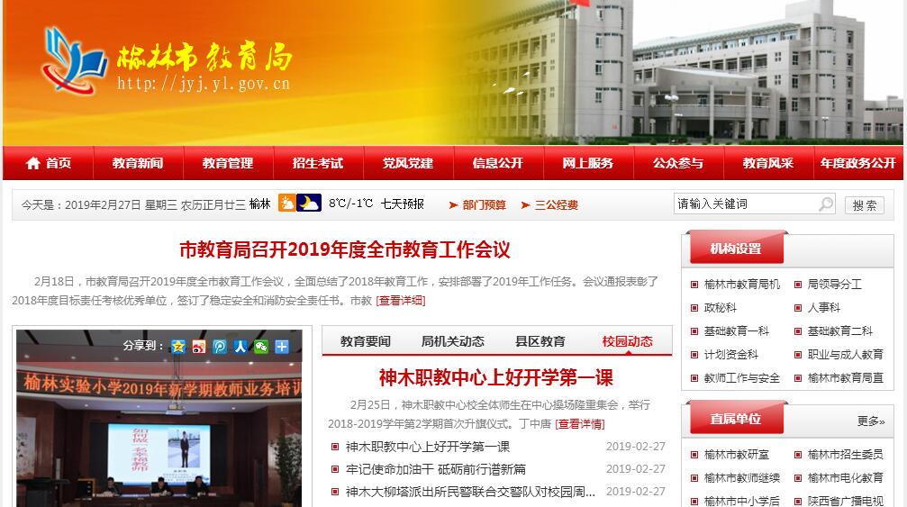 榆林市教育局主要职责:(一)贯彻执行中、省关于教育工作的法律、法规、规章和方针政策,拟订全市教育改革与发展规划及政策并组织实施。(二)负责全市各级各类教育的统筹规划和协调管理,按照中、省有关学校的设置标准,会同有关部门制订实施细则;开展标准化、规范化学校创建活动;负责教育基本信息的统计、分析和发布。(三)综合管理全市基础教育、职业教育、成人教育,制定有关管理办法并组织实施。(四)负责全市教育督导工作,指导全市教育教学研究和教育信息技术工作。(五)指导以就业为导向的职业教育发展与改革。(六)编制下达部门教育经费预算并监督执行;参与拟订筹措教育经费、教育拨款、教育基建投资的政策和管理办法;监督全市教育经费的筹措和使用,统筹管理本部门教育经费,按有关规定管理国内外对我市的教育援助、教育贷款;实施家庭困难学生的资助工作。(七)指导各级各类学校的德育、体育、卫生、艺术教育及国防教育、法制教育、健康教育、劳动技术教育工作;负责语言文字工作,指导推广普通话工作。(八)主管全市教师工作,执行中省关于各级各类教师资格标准;负责教育系统人才队伍建设工作。(九)负责组织高考、自考、成考、中考等教育招生考试;负责普通高中、职业高中学籍管理工作;负责大学、中专后继续教育、职工教育、农民教育和扫除青壮年文盲的巩固提高工作。(十)指导和监督全市教育系统基建工作,并参与局属单位基建项目的审批和竣工验收工作。(十一)负责全市民办教育的综合管理工作,规范民办学校办学行为;负责民办普通高级中学、初级中学、职业高级中学、初等职业学校的审批、调整、撤销及检查评估工作。(十二)负责全市教育系统安全稳定工作。(十三)指导全市中小学后勤管理服务工作。(十四)承办市政府交办的其他事项。