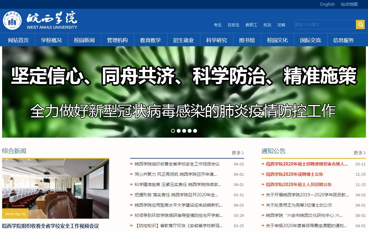 皖西学院坐落在荣膺有“国家级园林城市”、“国家级生态示范区”、“中国水环境治理优秀城市”、“中国人居环境范例奖”、“中国特色魅力城市200强”等称号的安徽省历史文化名城-六安市。六安市是国家级交通枢纽城市,东距省会合肥仅60公里,距新桥国际机场30公里。多条高速铁路和公路穿境而过,目前动车组(含高速动车)直达列车从六安到合肥需40分钟,到南京、武汉需1个多小时,到长沙、济南、上海、杭州需3个多小时,到北京需5个多小时、青岛需6个小时,交通十分便捷。学校主校区位于四面环水、风景秀丽的月亮岛上,校园内建筑设施、自然景观、人文气息相映成趣,构成了全国高校中独具特色的“湖中学府”、“岛上高校”的滨水生态校园。学校现设有15个二级学院,64个本科专业,校园占地1581亩,总建筑面积逾46万平方米。图书馆总藏量170多万册,教学科研仪器设备总值2.64亿元。学校现有全日制在校生20159人,教职工1217人,专任教师974人,其中专、兼职教授94人,副高职称人员223人,硕、博士教师680人,省级高层次人才27人。皖西学院成立后,加快改革发展步伐,2009年被确定为省级硕士学位授权规划立项建设单位和安徽省示范应用型本科高校立项建设单位,进入全省首批重点建设的高校行列;2011年荣获“安徽省普通高等学校毕业生就业工作标兵单位”称号;2012年获批为“安徽省普通高校大学生创新创业教育示范校”;2013年4月首批通过教育部本科教学审核评估(试点);2014年7月获批安徽省地方应用型高水平大学立项建设单位,同年获国家科技进步二等奖、国家教学成果二等奖;2017年,中药学学科被遴选为国内一流学科,大别山特色中药资源保育和开发科研团队被遴选为安徽省高校领军人才团队,获批设立“安徽省博士后科研工作站”;2015、2016、2017连续三年获省委综合考核优秀等次。获批为“安徽省第十一届文明单位”。学校重视科学研究与实践应用,坚持以应用型研究为科研方向,注重产学研合作,以科研促教学,以科研强教学。2006年以来,在各类学术期刊上公开发表学术论文5500余篇,其中被SCI、EI等检索系统收录438篇,出版学术专著、编著84部,编写教材118部。获得厅级以上各类科研项目701项,其中国家级项目27项,省部级项目304项。学术成果获国家科技进步二等奖1项,省部级奖13项。通过省级成果鉴定30项。获专利483项,其中国家发明专利33项。现有科技创新平台42个,其中植物细胞工程安徽省工程技术中心、仿生传感与检测技术省级实验室、安徽省农林废弃物综合利用工程技术研究中心、安徽省羽毛及其制品工程技术研究中心为省级科技创新平台,安徽省石斛产业化开发协同创新中心为省级2011协同创新中心,廉政文化研究中心为省级高校人文社科重点研究基地。《皖西学院学报》被评为全国高校优秀社科期刊、中国高校优秀科技期刊。学校积极开展对外交流,先后与美国、英国、法国、芬兰、乌克兰、新加坡、韩国、香港等国家和地区的高等院校、科研院所建立协作和文化交流关系。学校秉承“厚德尚能 博学创新”的校训,以转变教育思想观念为先导,以学科专业建设为龙头,以教学为中心,努力培养面向基层,服务一线,德智体美全面发展,地方用得上、留得住,具有创新精神和实践能力的应用性高级专门人才。学校坚持以育人为本,注重加强学生思想政治教育,尤其重视利用本地区红色文化对学生进行革命传统教育。筚路蓝缕弦歌不辍,风雨传薪惠播八方。朝气蓬勃的皖西学院人将沿着学校第三次党代会和“十三五”规划绘就的蓝图锐意进取,开拓创新,为把学校建设成为应用型人才培养质量高、办学特色鲜明、服务地方发展能力突出,省内同类院校一流、部分学科专业在全国有一定影响的新型地方应用型高水平大学而努力奋斗!