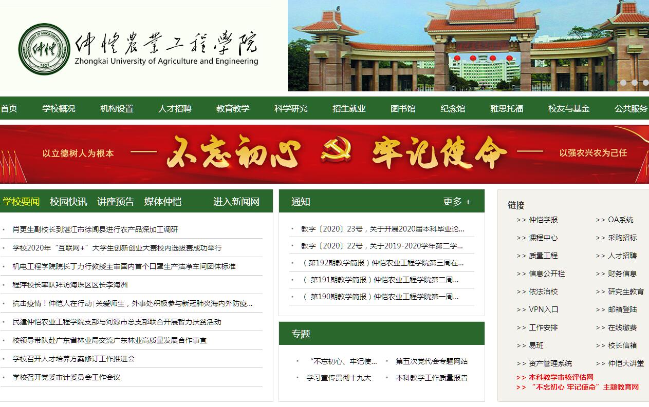 仲恺农业工程学院是一所以农学、工学和管理学学科为优势,农学、工学、理学、经济学、管理学、文学、艺术学和法学等多学科协调发展的省属本科大学。学校坐落在历史文化名城——广州,校园集云山之神秀,汇珠水之灵气,是读书治学的理想园地。学校前身为仲恺农工学校,是第一次国共合作时期,近代民主革命先驱何香凝先生等提议、国民党中央为纪念廖仲恺先生爱护农工的意愿而决定创办的。学校于1927年招生,何香凝先生首任校长15年。1984年,经教育部、农牧渔业部批准,学校升格为本科院校,定名"仲恺农业技术学院",国家副主席王震同志题写校名。2008年3月,经教育部批准,更名"仲恺农业工程学院"。为争取社会各界支持办学,促进学校发展,1987年4月,根据国家副主席王震提议,经中共广东省委同意,成立了学校董事会,王震任名誉董事长,广东省省长叶选平任第一届董事会董事长。1997年,广东省省长卢瑞华任第二届董事会董事长。2008年,广东省省长黄华华任第三届董事会董事长。2015年,广东省省长朱小丹任第四届董事会董事长。董事会成员由国家领导人、省部级领导以及港澳知名人士担任。学校的建设和发展备受各级领导和社会各界的高度重视与关心。党和国家领导人叶剑英、邓小平、杨尚昆、王震先后为校园内的廖仲恺何香凝纪念馆、廖仲恺铜像、何香凝汉白玉塑像和廖仲恺纪念碑题字。国家主席杨尚昆,全国人大常委会副委员长廖承志、何鲁丽、周铁农,全国政协副主席廖晖、霍英东、马万祺等多次亲临学校视察指导工作。广东省委、省政府及省教育厅一贯关心、支持学校建设,有力地推动着学校健康快速发展。海内外各界人士深怀对廖仲恺、何香凝及其开创事业的崇敬和景仰,不断给予精神和物质上的大力支持,霍英东、马万祺、何厚铧、崔世安、曾宪梓、何鸿燊、杨钊、刘宇新等一批港澳社会名流为学校捐款兴建实验楼、图书馆、体育馆、教学楼等,添置教学科研和医疗卫生设备,设立奖教奖学金,为学校办出特色、办出水平不遗余力。目前,学校有白云校区、海珠校区和钟村实习农场。学校具有高级专业技术职务专任教师421人,具有硕士学位以上专任教师的858人;现有十百千万人才工程第二层次人选1人,973首席科学家1人,广东省教学名师2人,广东省高校"千百十工程"省级培养对象12人,广东省高校优秀青年教师15人,珠江科技新星4人,省级科技创新团队2个,校级科技创新团队14个。学校图书馆藏书117万册,电子图书108万册,各种类型数字资源库33个。建有完善的现代电子图书系统和计算机网络服务体系。学校于2006年获得硕士学位授予权,2009年1月被教育部评为本科教学工作水平评估优秀学校。学校现设有18个二级学院(部)和华南地区最大的雅思考点;拥有博士后科研工作站1个、一级学科硕士学位授权点9个、二级学科硕士学位授权点20个、5个类别硕士专业学位授权点(其中农业硕士下设8个专业学位培养领域)、54个本科专业(其中16个名牌、特色专业,含2个国家级特色专业、7个省级特色专业)。学校面向全国12个省市招生,现有全日制本科生、研究生2万余人。学校拥有省级重点学科4个,珠江学者设岗学科5个,省级重点实验室1个,省级科研平台14个,省级精品课程13门。近五年,获国家自然科学基金33项,其中面上项目14项,青年基金项目16项,数学天元基金1项,应急项目1项;国家社会科学基金项目4项,其中一般项目2项,青年基金2项;国家星火计划项目重点项目1项;国家星火面上项目9项;获得广东省科学技术奖二等奖3项、三等奖4项,广州市科学技术奖三等奖1项,广东省农业技术推广奖一等奖1项、二等奖6项、三等奖1项;通过国家级品种审定2个,通过省级品种审定20个。获得授权专利 341项;被SCI、EI、ISTP三大索引收录论文300篇,出版学术专著30多部。九十多年来,学校为经济社会发展培养了一批批优秀人才,其中包括基层农业技术干部、专家、学者以及省部级领导干部,他们中的杰出代表有中国工程院院士曾溢滔、原农业部部长陈耀邦等。学校先后与英国利物浦大学、诺丁汉大学、布鲁内尔大学、布莱顿大学、爱丁堡龙比亚大学,美国夏威夷大学、威斯康星大学、圣道大学、密苏里大学,加拿大圭尔夫大学,澳洲中央昆士兰大学,新西兰林肯大学、梅西大学,日本创价大学,白俄罗斯国立工业大学,德国富克旺根艺术大学,意大利佛罗伦萨大学,台湾地区静宜大学、铭传大学、屏东科技大学等建立了友好互访和学术合作关系。近年来,学校被评为广东省依法治校示范校、广东省高等学校创建"平安校园"优秀学校、全国暑期"三下乡"社会实践先进单位、全国无偿献血贡献奖金奖单位、广东省大中专学生志愿者暑期"三下乡"社会实践活动先进单位、广东省回乡大学生开展农业科技下乡活动先进单位、广东省青年志愿服务优秀集体,在管理和社会服务方面得到了社会广泛认可。