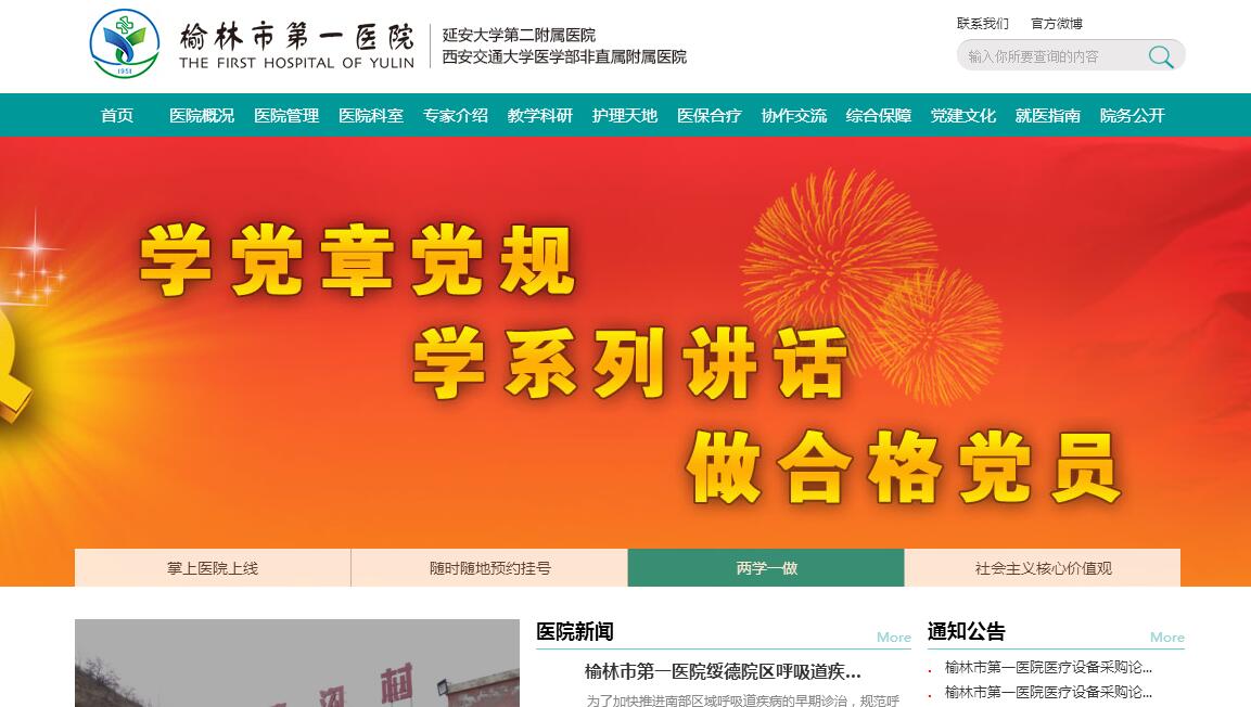 榆林市第一医院暨延安大学第二附属医院、西安交通大学医学部非直属附属医院、陕西中医药大学教学医院,前身为1951年创建于宝鸡的陕西省第二康复医院;1970年为支援陕北老区建设,整体迁址绥德;1989年通过国家教委验收,成为延安大学第二附属医院;1995年通过卫生部验收,成为陕北地区第一所三级甲等综合医院;2010年、2015年两度顺利通过等级医院复审;2016年建成西安交通大学医学部非直属附属医院、陕西中医药大学教学医院。作为陕北地区医疗技术中心和人才培养基地,我院一直承担着陕晋宁蒙接壤地区危急重症抢救和技术指导任务,为保障人民生命健康和带动区域卫生事业发展做出了杰出的贡献,被誉为“陕北医院的一面旗帜”。我院现由绥德、榆林两院区组成,推行“一院两区”协调发展战略,实行文化、资源、体制、目标的四统一管理。近年来,医院高度重视继承和发扬“二康”特色文化传统,制定实施以建设陕晋宁蒙接壤区域医教研中心为目标的“十三五”发展规划,紧抓“两个重点”(顺应国家城市公立医院改革要求,全面、稳步推进公立医院改革;加强“一院两区”建设,明确定位、协调发展、全面提高)、确立“三大指标”(医疗技术、教学能力、科研创新)、力求“四个突破”(以岗位管理为基础,推动绩效管理突破;以成本控制为抓手,推动精细化管理突破;以文化建设为保障,促进医院管理突破;以医教研协同发展为导向,促进综合实力突破),按年度工作主题(2016年优化服务建设年、2017年医院文化建设年、2018年精细化管理建设年、2019年医疗质量管理建设年、2020年医教研能力建设年)稳步推进医院全面发展。目前两院区总占地面积172.51亩,拥有业务建筑面积17.9万㎡,固定资产18亿元,编制床位2500张,开放病床2000张;现有在职职工2292人,其中专业技术人员1980人(副高以上289人,博士5人,硕士207人);配备PET-CT、三光子直线加速器、回旋加速器、3.0/1.5T核磁共振、ECT、256排螺旋CT、全数字血管造影系统、彩色多普勒超声诊断仪、全自动生化分析流水线等各类业务设备4082台/套;设置临床、医技科室102个,附设国家级住院医师规范化培训基地、国家胸痛中心、陕西省危重孕产妇救治转运中心、榆林市体检中心、榆林市远程会诊中心、榆林市突发公共事件应急救治中心及肿瘤、腔镜、神经内外科、检验等13个市级诊疗中心,拥有全市首家医疗专家工作站与全市唯一的医学专业在职硕士、博士研究生教学基地,初步建成涵盖8所县级医院、95所社区医院的区域医疗联合体,已成为陕晋宁蒙接壤区域设置诊疗科目齐全、设备先进、技术力量雄厚的现代化综合医院。