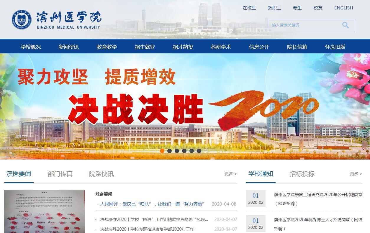 滨州医学院是山东省应用型人才培养特色名校,前身是始建于1946年的原国立山东大学医学院,1956年3月独立建制为青岛医学院,1970年10月整体搬迁至山东省惠民地区行署驻地北镇办学,1974年11月设立青岛医学院北镇分院,1981年9月改称北镇医学院,1983年3月随驻地更名为滨州医学院,2002年烟台校区投入使用。目前,学校已发展成为一所以医学学科为优势,康复医学、特殊教育为特色,医、理、工、管、教等多学科门类渗透融合、协调发展的省属本科医学院校。学校有全日制在校生16100余人,其中本专科生15300余人、硕士研究生600余人,面向29个省、自治区、直辖市招生;有留学生200余人。现设有临床医学院、基础医学院、特殊教育学院、口腔医学院、护理学院、人文与社会科学学院、马克思主义学院、药学院、中西医结合学院、公共卫生与管理学院、外国语与国际交流学院、葡萄酒学院、康复医学院、老年医学院、继续教育学院等15个院(系)。学校始终以立德树人为根本任务、以人才培养为中心、以提高质量为核心,始终坚持“育人为本,德育为先”“教学第一,质量至上”的办学传统,秉承“仁心、妙术”的校训精神,弘扬“团结、严谨、求实、创新”的校风,践行“教书育人、为人师表、严谨治学、敬业奉献”教风和“崇尚科学、追求真理、勤奋学习、诚实守信”的学风,始终坚持“基础理论知识与实践创新能力、全面发展与个性发展、科学精神与人文精神”相统一的育人理念,独立办学40多年来,为社会培养了113000多名各类医学及医学相关人才,学生培养质量得到了用人单位的充分肯定和社会各界的广泛赞誉,打造了“作风朴实、基础扎实、工作踏实”的毕业生品牌,为区域和国家经济社会的发展特别是医疗卫生事业的发展做出了积极贡献。2006年,在教育部本科教学工作水平评估中获得优秀成绩;2013年,在山东省高校中率先以“6年完全认证”的优异成绩通过教育部临床医学专业认证;2016年,通过教育部本科教学工作审核评估。学校现为国家临床、中医执业医师资格分阶段考试改革试点单位,教育部“本科教学工程”地方高校第一批本科专业综合改革试点单位,卓越医生教育培养计划“5+3”临床医学教育综合改革试点单位,卓越医生中医教育培养计划改革试点高校;为国家级住院医师规范化培训基地、万名护理人才培训基地、临床药师培训基地、全科医师培养基地。1985年,学校创办了我国第一个专门招收残疾青年的大学本科专业(医学二系),开创了我国残疾人高等医学教育的先河,成为我国残疾人教育发展史上的标志性事件。2012年招收首批视障学生,填补了我国医学院校和山东省开展本科层次视障生教育的空白。30多年来,探索形成了“残健融合、教育与康复相结合”的残疾人人才培养“滨州医学院模式”,为社会培养了1105名残疾人医学人才,基本形成了“残疾人人才培养和服务残疾人事业专业人才培养”协调发展的格局,为促进国家进步文明事业作出了积极贡献。学校现为国家残疾人高等教育基地、中国盲人医疗按摩规范化实训基地和山东省残疾人大学生就业指导服务中心。学科专业 设有临床医学、口腔医学、护理学、中医学、医学影像学、麻醉学、预防医学、生物技术、药学、应用心理学、医学检验、眼视光学、康复治疗学、特殊教育、听力与言语康复学、生物制药、制药工程、假肢矫形工程、中药学等30个本科专业。是山东省博士学位授予立项建设单位,拥有硕士学位授权一级学科6个、二级学科39个,硕士专业学位授权点5个。有国家特色专业4个,山东省高水平应用型立项建设专业群4个、省级特色专业8个;省部级重点学科8个,其中临床医学学科进入ESI全球排名前1%,护理学、基础医学进入“软科中国最好学科排名”前50%。有国家中医药管理局重点研究室1个,省级重点实验室5个、省级人文社科基地1个、省级高校协同创新中心2个、省级医药卫生重点实验室9个,直属附属医院有省级临床重点专科21个。有省级精品课程(双语教学示范课程)32门,省级实验教学示范中心3个,省级人才培养模式创新实验区1个。科学研究 近5年,承担科研课题1536项,其中国家自然科学基金课题102项(含重点项目2项),省部级课题251项;科技成果获省部级奖励17项,其中一等奖3项、二等奖8项;承担省级教学改革项目31项,获省级教学成果奖9项、研究生教育省级教学成果奖4项、省级优秀教材奖4项;出版专著275部、教材488部;发表论文2447篇,其中被SCI等收录和转载601篇,核心期刊929篇;获专利188项,其中发明专利85项。主办《中国医院统计》和中国学术期刊综合评价数据库来源期刊《滨州医学院学报》,均向国内外公开发行。师资队伍 现有教职医护员工6686人(含2所直属附属医院),其中专任教师1098人;教授(含具有正高级专业技术职务人员)203人,副教授(含具有副高级专业技术职务人员)492人;博士352人,硕士1649人;聘有院士5人;有国家“千人计划”2人、“长江学者”讲座教授1人,全国模范、优秀教师5人,教育部新世纪优秀人才3人,享受国务院特贴专家6人;“泰山学者”特聘专家(教授)15人,山东省有突出贡献的中青年专家4人、卫生系统杰出学科带头人(泰山医学家)和青年重点科技人才3人、高校重点学科(实验室)首席专家2人,省级教学名师8人、优秀教师(研究生指导教师)6人;全国黄大年式教