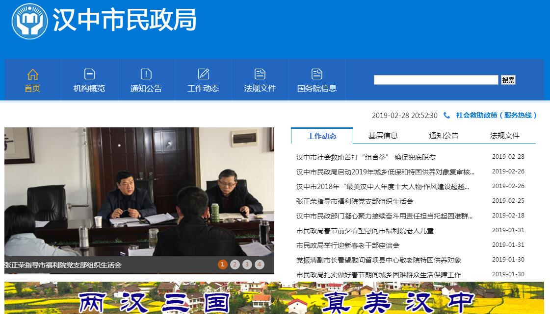 汉中市民政局主要职责:(一)宣传、贯彻中、省、市关于民政工作的方针、政策,拟订全市民政工作有关政策及配套管理规章制度,编制全市民政事业发展规划,并负责组织实施和监督检查。(二)承担对全市社会团体、民办非企业单位的登记管理和执法监察责任。(三)拟订全市救灾减灾工作的实施办法,承担全市受灾群众生活救助工作,组织实施减灾计划,开展减灾合作与交流。(四)负责全市城乡社会救助体系建设。拟订社会救助政策、规划和标准,负责城乡居民最低生活保障、医疗救助、临时救助、生活无着人员救助工作。(五)推进基层民主政治建设,指导全市城乡社区建设,提出加强和改进城乡基层政权建设的建议。(六)负责全市社会福利事业和福利彩票管理工作。(七)指导全市社会慈善、社会捐赠、群众互助等社会扶助活动,促进慈善事业发展。(八)推进社会工作人才队伍建设和相关志愿者队伍建设。(九)负责全市婚姻登记管理、殡葬管理、流浪乞讨人员救助管理和儿童收养工作,推进婚俗和殡葬改革。(十)拟定全市行政区划规划,负责全市行政区划变更的审核报批,组织调处市内行政区域边界争议,负责全市地名管理。(十一)负责全市优抚对象的优待、抚恤和补助工作;负责城镇退役士兵、转业士官、复员干部、残疾士兵、军队离退休干部、退休士官和无军籍退休职工的接收安置和服务管理工作。(十二)组织开展拥军优属、拥政爱民活动,承办市“双拥”工作领导小组办公室日常工作。(十三)负责民政事业经费的分配、监督和管理。(十四)负责市老龄工作委员会办公室工作。(十五)承办市政府交办的其他事项。