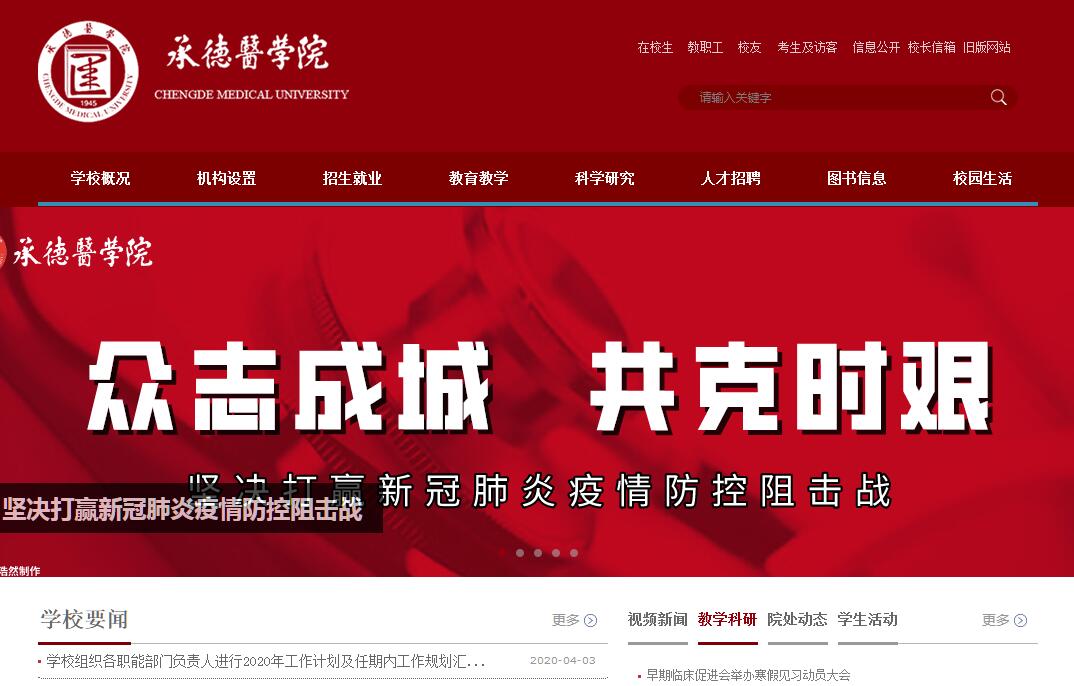 承德医学院是一所隶属河北省政府领导的高等医学本科院校。创建于1945年9月,时称冀东军区卫生学校;1948年成为为中国医科大学第四分校;1949年5月,入驻热河省省会—承德,更名热河医学院;1982年12月升格为本科院校,定名为承德医学院。1996年9月通过国家本科教学合格评估。2001年河北省农林科学院特产蚕桑研究所并入我校。2003年7月被国务院学位委员会批准为硕士学位授权单位。2006年10月,新校区投入使用并迁入新校区。2007年9月在国家教育部高等院校本科教学工作水平评估中获得优,秀。2013年11月顺利通过国家教育部临床医学专业认证。学校2015年荣获“全国文明单位”称号,2017年通过“全国文明单位”复查验收,继续保留“全国文明单位”称号;附属医院2017年荣获“全国文明单位”称号 。目前,学校现有教职工2238人(含直属附属医院),其中专业技术人员1863人,正高职称203人、副高职称429人,博士和硕士1233人。现有专任教师1006人。有享受国务院特殊津贴专家、全国优秀教师、河北省突贡专家、省级教学名师、省级青年学科带头人、百人计划特聘专家、省“三三三人才工程”和中青年骨干教师50人。有硕士研究生导师448人,博士研究生导师7人,还聘请了40余名国内外知名学者为客座教授。2014年院士工作站获得批准成立。现有本、专科在校生及全日制研究生9380人,来自全国28个省(自治区、直辖市)。其中在读硕士研究生604人,留学生266人。2006年开始招收外国留学生,2007年开始选送护理专业(专科)学生赴新加坡留学并获全额奖学金。与丹麦哥本哈根大学、日本札幌市立大学、韩国又石大学、美国印第安纳Dabney大学、马来西亚马来亚大学、意大利卡梅里诺大学等在内的多所国际性大学签署学生交流合作协议。学校设有临床医学、中西医临床医学、中医学、护理学、医学影像学、麻醉学、中药学、应用心理学、针灸推拿学、康复治疗学、生物信息学、生物医学工程等12个本科专业和临床医学、护理、涉外护理、医学影像技术、医学生物技术、计算机应用技术等6个专科专业。直属附属医院1所,非直属附属医院25所,教学实习医院64所,总床位达68000余张。有临床学院、护理学院、继续教育学院、基础医学院、中医学院、研究生学院、国际教育学院等7个学院及中药学系、心理学系、生物医学工程系、社会科学部、公共体育部、外语教学部等6个教学系部。学校现有临床医学、基础医学、中药学三个硕士授权一级学科,涵盖了26个二级学科,其中临床医学、中药学、护理为专业学位授予学科。学校现有国家中医药管理局“十一五”重点专科1个、省级重点学科和重点发展学科8个、省级医学重点发展学科4个、省级临床重点专科建设(培育)单位10个、校级重点学科19个;国家级特色专业建设点2个、河北省本科教育创新高地2个、河北省品牌特色专业2个、省级“专业综合改革试点”项目3个;临床医学为地方高校第一批本科专业综合改革试点;卓越医生教育培养计划项目1个;卓越医生(中医)教育培养计划项目1个;省级精品课程9门;省级精品资源共享课程1门;省级实验教学示范中心4个;河北省优秀教学团队1个;河北省大学生校外实践教育基地1个。校园占地面积74.9万平方米。其中图书馆建筑面积1.5万平方米,藏书77万册,纸质期刊510种,拥有电子图书285万册和电子资源数据库10个(中国知网、万方数据库、超星读秀及百链学术搜索、EBSCO外文库、重庆聚合、新学术外文期刊、中文在线、新东方英语、高校考研互动精品课程、银符在线考试网)。学校2015年荣获“全国文明单位”称号,2017年通过“全国文明单位”复查验收,继续保留“全国文明单位”称号;附属医院2017年荣获“全国文明单位”称号;学校先后10次荣获“省级文明单位”称号;先后被授予河北省校园文化建设“十佳单位”、河北省“文明大院”、全省教育系统创先争优先进集体、河北省学校安全稳定工作先进单位等称号。学校党委被评为“河北省高校党建工作先进集体”;团委被评为“全国五四红旗团委”;基础医学院获“全国教育系统先进集体”;护理学院被评为“全国三八红旗集体”;附属医院被评为“全国卫生系统先进单位”、“全国卫生系统思想政治工作先进单位”、;大学生社会实践6次获得中宣部、教育部和团中央等部委表彰;大学生社团定向越野协会被评为“全国高校优秀学生社团、全国百佳体育公益社团”。2016年,勇救落水母子的学生王瞳瞳荣登中国文明网2016年5月“中国好人榜”,被授予“河北省见义勇为英雄”称号。2017年,列车上抢救患病乘客的研究生高小恒获评“河北好人”荣誉称号。毕业生社会声誉良好。学校本科学生在全国大学生英语四级考试中,连续5年一次通过率在90%以上,在全国高校中处于领先地位。多次在河北省医学院校临床技能考核中,获得全省第一名。近年来,毕业生参加国家执业医师资格考试,通过率高于全国平均通过率5-13个百分点。建校70年来,学校培养3万余毕业生。大多数人已成为基层医疗单位的业务骨干和学科带头人。承德医学院秉承“仁爱至诚 知行合一”的办学理念,以“严谨、求实、勤奋、创新”为校训,形成了“艰苦奋斗,锲而不舍,求真务实,拼搏进取”的承医精神。学校坚持“以学生为本,全心全意为学生成长成才服务”的理念关心学生,全员育人