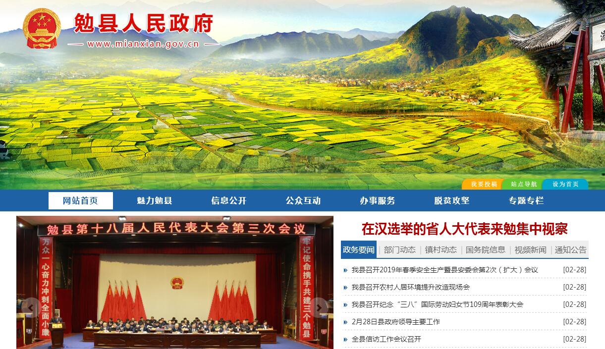 勉县是一个美丽的地方。位于汉中盆地西端,北依秦岭,南垣巴山,居川陕甘要冲。夏无酷暑,冬无严寒,非常适合居住。全县辖1个街道办事处、17个镇,243个村(社区),总面积2406平方公里,总人口42.9万人。勉县是一个区位优势独特的地方。位于中国版图的地理中心,又处在关中、成渝、“十天”经济圈的重要节点,西汉高速、十天高速、阳安铁路、108国道横贯全境,可30分钟到汉中,3个多小时到西安,4个小时到成都,随着宝汉高速、西成高铁的建成,发展空间将更加广阔。勉县是一个两汉三国历史文化积淀非常深厚的地方。西汉初年,高祖刘邦派大将韩信从勉县“暗度陈仓”出定三秦;东汉初年,张鲁在此创办“五斗米教”,“雄踞巴汉三十余载”;尤其是三国时期,一代智星诸葛亮在定军山下设八阵图、制木牛流马,八年屯兵,五次北伐,留下了丰富的历史文化积淀。勉县是一个资源富集的地方。境内生态环境良好,有很多的山川、河谷等自然资源经过开发可以成为独特的旅游产品。境内已探明的金属和非金属矿藏23种,以天麻、猪苓为代表的中药材达1611种,具有良好的开发前景。勉县是一个产业基础较好的地方。全县年产值在2000万元以上的企业40余家,初步形成了以有色冶金、建材、化工、食品饮料为支柱的工业体系,工业总量居全市第一。全县茶园面积、蔬菜面积均创历史新高,生猪饲养量达到112万头,县级以上农业产业化龙头企业30余家,农业产业化科技示范园被命名为“全国农产品加工示范基地”、“省级知名品牌创建示范区”。境内有国家4A级旅游景区2个,定军山、天荡山、云雾山等景区初具规模,温泉、武侯古镇建设加速推进。勉县是一个极具发展潜力与活力的地方。近年来,面对复杂多变的宏观环境和持续增大的经济下行压力,全县上下紧紧围绕建设陕西强县、美丽勉县目标,以稳中求进、改革创新、提质增效为核心,顽强拼搏,开拓进取,扎实苦干,经济社会发展取得了显著成绩。先后获得陕南突破发展先进县、全国政务公开示范县、全国农村劳动力转移就业示范县,全省依法行政先进县、保障性安居工程建设先进县、招商引资先进县、集体林权制度改革先进县、非公经济发展先进县,以及全国卫生县城、省级园林城市等多项殊荣。悠久的历史和丰富的资源,是上苍惠赐给勉县的珍贵财富。勤劳善良、热情好客的勉县人民将在这片充满生机和希望的热土上不断开拓奋进,创造自己的幸福生活。诚挚欢迎各级领导、各界朋友经常来勉县指导工作、旅游观光、投资兴业。