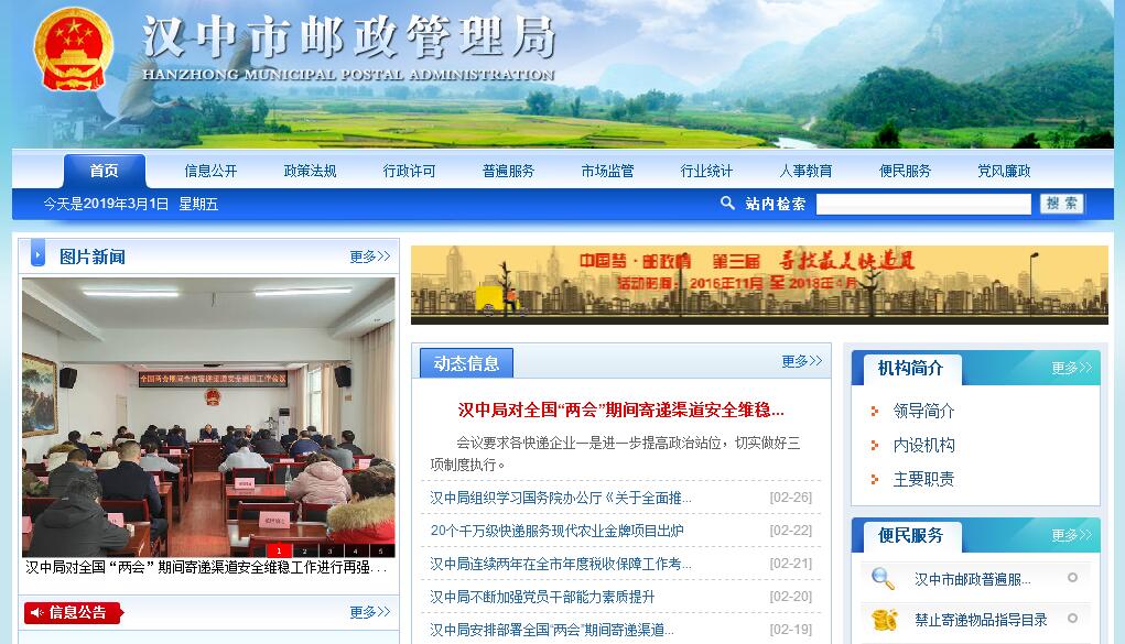 | 网站简介: 汉中市邮政管理局主要职责:1、贯彻执行国家邮政法律法规、方针政策和邮政服务标准;2、研究拟定本地区邮政发展规划;3、监督管理本地区邮政市场以及邮政普遍服务和机要通信等服务的实施;4、负责行业安全生产监管、统计等工作,保障邮政通信与信息安全;5、承办上级邮政管理部门和地方人民政府交办的其他事项。 |