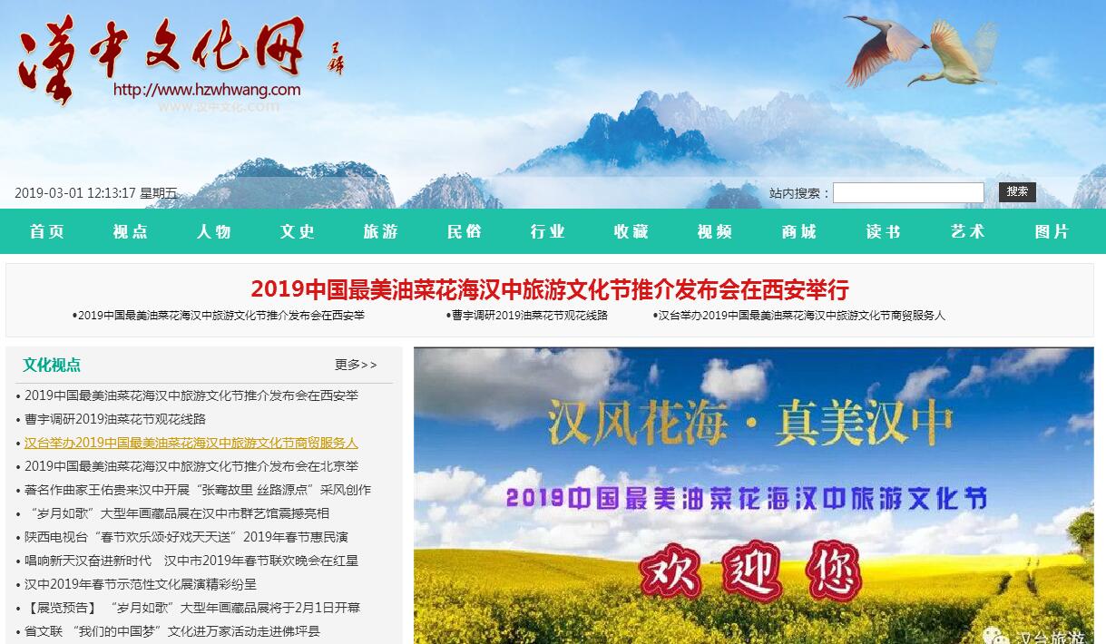 | 网站简介: 汉中文化网(http://www.hzwhwang.com、汉中文化.com)是汉中市委、市政府领导下集中反映汉中文化建设与发展的综合性文化网络平台。网站开设文化视点、人物、文史、旅游、民俗、行业、收藏、视频、商城、文苑、艺术和图片等栏目,网站积极秉持文化为人民服务、为社会主义服务的方向,以电子商务与文化旅游、网络文化创意相结合的发展思路,推出具有思想内涵和艺术审美价值的网络文化产品,弘扬社会主义核心价值观,传播先进文化,积极为汉中文化名市建设服务,为发展繁荣汉中的网络文化事业贡献力量。《汉中文化网》——最具文化品位的汉上网络家园。 |