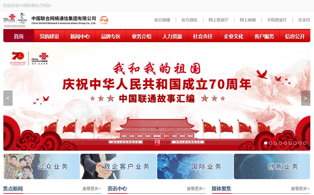 中国联合网络通信集团有限公司(简称“中国联通”)于2009年1月6日在原中国网通和原中国联通的基础上合并组建而成,在国内31个省(自治区、直辖市)和境外多个国家和地区设有分支机构,是中国唯一一家在纽约、香港、上海三地同时上市的电信运营企业,连续十年入选“世界500强企业”,在2018年《财富》世界500强中位列第273位。中国联通主要经营固定通信业务,移动通信业务,国内、国际通信设施服务业务,卫星国际专线业务、数据通信业务、网络接入业务和各类电信增值业务,与通信信息业务相关的系统集成业务等。中国联通于2009年4月28日推出全新的全业务品牌“沃”,承载了联通始终如一坚持创新的服务理念,为个人客户、家庭客户、集团客户提供全面支持。中国联通拥有覆盖全国、通达世界的现代通信网络,积极推进固定网络和移动网络的宽带化,积极推进“宽带中国”战略在企业层面的落地实施,为广大用户提供全方位、高品质信息通信服务。2009年1月,中国联通获得了WCDMA制式的3G牌照。2013年12月4日,中国联通获得了工业和信息化部颁发的LTE/第四代数字蜂窝移动通信业务(TD-LTE)经营许可,2015年2月27日,工业和信息化部向中国联通发放了LTE FDD经营许可。至此,中国联通成为拥有TD-LTE和LTE FDD两种4G牌照的“双4G”运营商,进入4G发展新阶段。2018年是贯彻党的十九大精神的开局之年,是改革开放40周年,是决胜全面建成小康社会、实施“十三五”规划承上启下的关键一年,也是中国联通混改后的新起点、新开局。中国联通将深入落实聚焦创新合作战略、深化混合所有制改革、全力推进互联网化运营,打造新基因、新治理、新运营、新动能、新生态的“五新”联通。