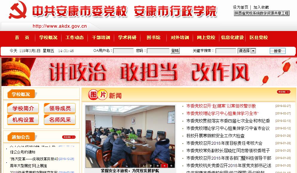 中共安康市委党校是在市委直接领导下培养党员领导干部和理论干部的学校,是党委的重要部门,是培训轮训党政领导干部的主渠道,是党的哲学社会科学研究机构。中共安康市委党校原名为中共安康地委党校,成立于1956年,迄今已走过60年历程,其中文革期间(1969年10月)改名为安康地区“五、七”干校,迁址安康县恒口区;1978年重正其名,并迁回安康城区。1985年7月1日,中共陕西省委正式批准中共安康地委党校为大专体制;1989年3月成立中央党校函授学院安康学区;1991年党校升格为副地级单位;1993年创办地委党校大专走读教育;1997年1月,安康地区行政学院挂牌成立。2000年地改市后改名为中共安康市委党校、安康市行政学院至今。2012年8月正式迁入安康市高新区江北花园大道中段新校(院)区。校(院)内设办公室、培训处(教务处)、总务处、工作处、科研处、经济管理教研室、哲学文史教研室、科社法学教研室、图书馆等9个副处级机构,另设财务室1个科级机构。现有副县级以上干部13人,科级干部7人。党员51人,占80%,硕土研究生7人,研究生17人,本科32人,专科9人,大专以上占98.5%,本科以上占83.9%;专业教师26人,其中:教授2人,副教授11人。2009年12月,我校正式由校党委转变为校务委员会领导体制。2010年1月,设立市委党校机关党委,机关党委下设10个党支部。对十个县区委党校(汉滨区、汉阴县、石泉县、宁陕县、紫阳县、岚皋县、平利县、填坪县、白河县、旬阳县)有业务指导关系。为响应市委、市政府关于加快江北新区建设的号召,改善党校的办学条件,促进党校事业发展,市委党校根据市委、市政府的决策,将党校原校址的校产于2009年5月15日,以8000万元的最终竞价整体拍卖成功,并开始北迁新建筹备工作。根据中、省关于党校工作的有关规定,结合市级党校功能定位及我市建设规划要求,我校按照 “园林式、生态化、现代化、人文化、经典化”的设计理念,坚持充分利用地形地貌,体现安康地理特征,着力创造依山临水建筑群体,突出人文自然特色和浓厚校园气息的指导原则,新校园整体规划设计为教学图书区、办公区、学员公寓服务区、运动休闲区、拓展训练区及生态停车区等六大区域,建设总规模3.14万㎡,其中综合办公楼、教学图书楼、大礼堂合计1.16万㎡己于2012年7月建成并投入使用。新建的校园具有较好的学习环境,将为安康的干部培训提供优良的教学环境和更广阔教育空间。