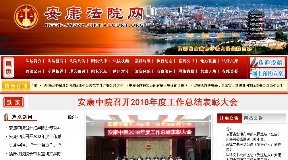 安康古称金州,历史悠久。安康市位于祖国版图中部、陕西省南端,北靠秦岭、南依巴山,汉江由西向东横贯而过,地缘和区位优势独特,处于川、陕、鄂、渝四省市的结合部,位处西安、武汉、重庆三大经济区的几何中心,阳安、襄渝和西康三条电气化铁路在安康交汇。境内山川秀美,气候宜人,资源丰富,秦巴汉水独特的自然生态环境,积淀深厚的文化底蕴,使安康成为陕西绿色生态旅游的品牌,被誉为陕西的“后花园”。安康市辖9县1区,国土面积23391平方公里,2012年末总人口274.5万人。2001年1月1日,原安康地区撤地设市,原安康地区中级人民法院重新组建为安康市中级人民法院后正式对外办公。2012年6月27日,安康市中级人民法院迁至现址办公,办公地点位于本市安康大道三桥头黄沟路口。安康市中级人民法院辖十个基层人民法院,分别是汉滨区人民法院和汉阴、石泉、宁陕、紫阳、岚皋、平利、镇坪、旬阳、白河九县人民法院。全市两级法院现共有在编法官和其他工作人员766人,其中市中级法院有在编法官和其他工作人员118人。安康市中级人民法院的主要职能是: 依照法律规定审理辖区内危害国家安全案件、可能判处无期徒刑以上刑罚或外国人犯罪的刑事案件;辖区内有重大影响的一审民商事案件、知识产权案件、行政案件;审判辖区内第二审刑事、民事和行政案件;依照法律规定提审下级法院管辖的第一审刑事、民事和行政案件;审判省高级人民法院交由审判的刑事、民事和行政案件;审理减刑、假释案件;依照法律监督程序,审判告诉申诉的刑事、民事、行政案件;执行本院已经发生法律效力的判决、裁定以及国家行政机关申请执行而又需市中级人民法院执行的案件和外地法院委托执行的案件;根据《国家赔偿法》规定,受理赔偿案件;监督、指导基层人民法院的审判工作等。近年来,安康中院坚持以邓小平理论、“三个代表”重要思想、科学发展观和党的十八大精神为指导,以“公正与效率”为主题,牢固树立司法为民公正司法理念,全面开展刑事、民事、行政等各项审判工作,扎实推进各项改革措施,切实加强队伍建设,与时俱进,开拓创新,忠实履行宪法和法律赋予的神圣职责,充分运用审判职能为人民群众排忧解难,各项工作和建设发生了日新月异的变化,为安康改革、发展、稳定作出了积极的贡献,赢得了人民群众的信任和满意,树立起了新时期人民法院的良好形象。先后荣获“全国法院执法规范化建设先进单位”、“全国法院维护妇女儿童权益先进单位”、“全国法院后勤服务工作先进单位”、“全省法院案件质量评比第一名”、“全省法院庭审评比第一名”、“全省法院审限管理先进单位”、“全省综合治理先进单位”、“全省妇联维权先进单位”、“全省法院宣传思想工作先进单位”、“全省严打先进集体”等荣誉称号。今后一个时期,安康中级法院将全面落实科学发展观,围绕全市工作大局,坚持“公正司法、一心为民”指导方针,紧扣“公正与效率”工作主题,以促进社会和谐、维护社会稳定为目标,不断增强司法能力,提高司法水平,规范司法行为,推进法院改革,加强法官职业化建设,充分发挥审判职能,求真务实,承前启后,推动法院工作不断向前发展,为全面建设和谐、法治的美好安康创造公正高效的法治环境 。