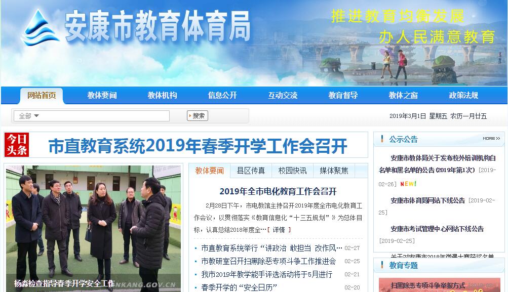 安康市教育体育局主要职责:1.贯彻执行党和国家教育、体育工作方针、政策、法律、法规,研究制定全市教育、体育改革与发展的政策和规划。2.负责各级各类教育的统筹规划和协调管理,指导各级各类学校的教育教学改革和中小学布局结构调整,组织初审地方教材;负责推动多元化体育服务体系,推进体育公共服务和体育体制改革;负责全市教育体育系统基本信息的统计、分析、发布工作。3.负责义务教育的指导与协调,推进全市县域内义务教育均衡发展和促进教育公平;指导普通高中教育、幼儿教育和特殊教育工作;推进基础教育教学改革,全面实施素质教育。4.负责教育体育经费统筹管理,参与拟定筹措教育体育经费、拨款、基建投资的政策和措施,监督全市教育体育经费的筹措和使用情况,指导国(内)外教育体育援助、合作项目的执行。5.主管全市教师工作。会同有关部门做好全市教师、教练招聘和中小学校长的聘用工作;组织实施教师继续教育、岗位聘用、职务评聘、培养培训、调配交流、转岗分流、辞职辞退、专业技术职务资格评审、高中阶段学校教师资格认定等工作;按照干部管理权限和程序,配合有关部门任免考核有关学校校长和干部,加强学校领导班子和干部队伍建设。6.统筹和指导全市教育督导工作,会同市政府教育督导团负责对下级政府及各类学校的督导检查和评估验收,指导教育发展和教育教学质量的监测工作。7.贯彻执行国家语言文字和学位管理工作的方针政策,拟定语言文字工作中长期规划和工作计划,指导普通话推广和普通话师资培训工作,承担语言文字工作委员会的具体工作。8.指导以就业为导向的职业教育发展与改革,指导中等职业教育教材建设工作,组织实施民族地区免费中等职业教育工作。9.统筹规划、综合管理全市民办教育,规范民办教育办学秩序,促进民办教育事业健康发展。10.指导各级各类学校的思想政治、德育、体育卫生与艺术教育、法治教育、国防教育、科技教育、安全和稳定工作,指导直属学校的党建工作,会同有关部门加强直属学校领导班子建设。11.统筹管理全市的学历教育招生考试工作;协助有关部门做好高校、中等专业学校毕业生就业制度改革和就业指导工作。12.规划指导全市教育体育系统的科学研究及科学研究成果转化运用工作;指导教育技术装备和现代化信息技术教育工作。13.指导教育体育系统的国际交流合作。开展与国(内)外的教育体育交流和合作,指导汉语国际推广工作;负责全市教育体育系统出国留学人员、外籍教师、教练、专家的申报管理工作。14.统筹规划全市群众体育发展。负责推行全民健身计划,监督实施国家体育锻炼标准,推动全市国民体质监测和社会体育指导工作队伍制度建设;指导公共体育设施建设和监督管理。15.统筹规划全市竞技体育发展。指导体育训练、体育竞赛和运动员队伍建设,组织统筹参加省级以上综合运动会和承办市级综合性运动会的竞赛工作,协调运动员社会保障工作;负责组织、监督全市体育运动会中的反兴奋剂工作。16.统筹规划全市学校体育发展。指导和管理学校体育工作;制定全市学校体育教育、青少年业余训练的规划和工作方案,并负责组织实施、督促和检查;指导和管理全市中小学生体育测试和体育特长生的审定工作;负责一级以上运动员的申报和二级运动员的认定。17.统筹全市青少年体育发展规划,指导和推进青少年体育工作。18.拟定体育产业政策,管理并发展体育市场;负责监督管理全市体育彩票销售工作。19.承办市委、市政府交办的其他事项。