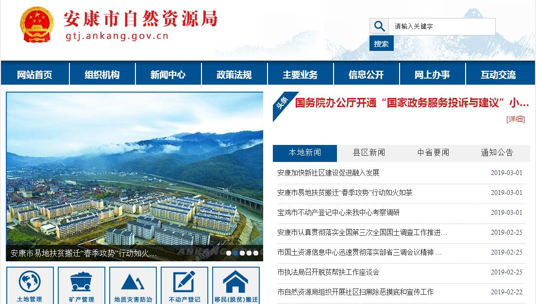 安康市自然资源局主要职责:(一)承担保护与合理利用全市土地资源、矿产资源等自然资源的责任。贯彻执行国土资源发展规划和战略;开展全市国土资源经济形势分析,研究提出全市国土资源供需总量平衡的政策建议;参与全市宏观经济运行、区域协调、城乡统筹的研究;组织拟定执行全市国土资源的调控政策和措施;组织实施全市国土资源领域节约集约利用和循环经济的政策措施。(二)承担规范全市国土资源管理秩序责任。贯彻执行土地管理、矿产资源管理等相关法律法规和政策;研究拟定全市国土资源管理有关规范性文件,组织实施全市土地资源、矿产资源管理的技术标准、规程、规范和办法;负责指导全市国土资源行政执法工作,监督检查县(区)土地、矿产规划的执行情况,调查处理国土资源较大违法案件;负责行政复议、行政应诉和有关行政处罚的听证工作。(三)承担优化配置全市国土资源的责任。组织编制和实施全市土地利用总体规划、矿产资源规划、土地整治规划、地质灾害防治规划、地质灾害移民搬迁相关规划和国土资源其他专项规划、年度计划,指导和审查县(区)土地利用总体规划和矿产资源规划,参与审核需报省审批的城镇总体规划,参与制定陕南移民搬迁土地管理相关政策,组织矿产资源调查评价,开展国土资源科学技术研究和对外合作交流。(四)承担规范全市国土资源权属管理的责任。依法保护全市土地资源、矿产资源等自然资源所有者和使用者的合法权益;拟订全市地籍管理办法并组织实施;组织土地资源调查、地籍调查、土地统计和动态监测;指导监管土地确权、地籍调查、土地分等定级等工作;建立和维护地籍信息系统。(五)承担全市耕地保护的责任。确保规划确定的耕地保有量和基本农田面积不减少;组织实施基本农田保护,监督占用耕地补偿制度执行情况;指导、监管未利用土地开发、土地整理、土地复垦和耕地开发工作;组织实施土地用途管制、农用地转用和土地征收征用;承担报国务院、省政府审批的各类用地的审核、申报工作。(六)承担规范全市国土资源市场秩序的责任。拟定并组织实施土地使用权划拨、出让、租赁、作价出资、转让、交易、储备等管理办法;管理和监督城乡建设用地供应、土地储备、土地开发和节约集约利用;建立基准地价、标定地价等政府公示地价制度;监测土地市场和建设用地利用情况;规范和监管矿业权市场,组织对矿业权人勘查、开采活动进行监督管理;监督管理农村集体土地使用权的流转。(七)负责全市矿产资源开发的管理工作。依法管理采矿权的审批登记发证和转让审批登记,实施国家规划矿区、对国民经济具有重要价值的矿区的管理,承担保护性开采的特定矿种、优势矿产的开采总量控制及相关管理工作,编制并实施矿业权设置方案。(八)负责全市矿产资源储量的管理工作。贯彻执行矿产资源储量管理办法、标准和规程;负责监督管理矿产资源储量登记、统计、核实工作和地勘查项目活动。(九)承担全市地质环境保护的责任。组织实施矿山地质环境保护,监督管理古生物化石、地质遗迹、矿业遗迹等重要保护区、保护地;依法管理环境地质勘查和评价工作;防止地下水过量开采和污染,监测安康城区周边地下水变化情况;承担城市地质、农业地质、旅游地质的勘查、评价工作。(十)负责全市地质灾害预防和治理的管理工作。指导地质灾害应急处置,组织、协调、指导和监督全市地质灾害防治工作,制定并组织实施重大突发地质灾害应急预案。(十一)依法征收国土资源收益,规范、监督资金使用;拟订土地、矿产资源参与经济调控的政策措施;依法组织土地、矿产资源专项收入的征管,配合有关部门拟定收益分配制度,指导、监督全市土地整理复垦开发资金的收取和使用;管理土地、矿产等资源性资产和国家出资形成的矿业权权益,负责有关资金、基金的预算和资产管理与监督。(十二)负责国家、省、市重点建设项目用地和规划区范围内的建设项目用地的统一征地管理工作。(十三)协助省国土资源厅开展处级干部的日常管理,负责全市国土资源系统科级干部的考察、任免、考核、交流工作。(十四)指导监督全市不动产登记工作;会同有关部门拟定不动产统一登记的有关规范性文件,建立不动产统一登记制度;负责中心城市规划区不动产登记工作,调处市本级不动产权属争议;推动不动产登记信息基础平台建设。(十五)承办市政府交办的其他事项。