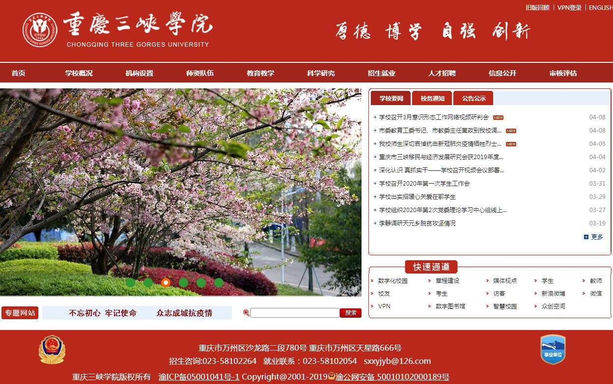 重庆三峡学院始建于1956年,现坐落于千年古城、移民之都——重庆市万州区。学校起源于四川省万县初中师资训练班,是三峡库区腹地唯一的一所多科性本科院校(教育部代码10643)。2013年,被国务院学位委员会批准为硕士学位授予单位。历经60余年发展,学校成为重庆市首所倡导“绿色教育理念”、力推“绿色教育产教融合”的本科高校。现已形成以文、工为主,其他学科专业协调发展的学科结构,以本科教育为主,研究生教育、成人教育协调发展的办学格局。学校是全国智慧校园建设试点单位、中美应用技术教育“双百计划”成员单位、重庆市教育信息化示范单位、重庆市高校美育改革和发展实验校。办学规模方面。学校占地面积达1980余亩,有17个二级学院,全日制学生2万余人,馆藏纸质图书168万册,电子图书165万种,固定资产11亿余元。学科专业建设方面。学校拥有涵盖工学、文学、管理学、理学、艺术学、经济学、法学、教育学、农学等9个学科门类的58个本科专业,3个一级学科硕士学位授权点(中国语言文学、环境科学与工程、电子科学与技术),3个专业学位硕士授权点(教育硕士、农业硕士、工程硕士)。现有中国语言文学、电子科学与技术、环境科学与工程、农林经济管理、计算机科学与技术、数学等6个重庆市高等学校十三五市级重点学科。科学研究方面。学校建有重庆市2011协同创新中心1个,重庆市人文社科重点研究基地2个,重庆市工程技术研究中心(实验室)4个,重庆市发改委工程技术中心(实验室)2个。有重庆市高校创新团队等6个,“电动汽车OBD关键技术创新创业团队”纳入重庆市创新创业团队支持计划。近十年来承担国家级基金项目、部市级科研项目700余项。成功申请专利300余项,发表论文9000余篇,三大检索文章800余篇,CSSCI、CSCD期刊论文1400余篇,出版学术专著190余部。科研成果先后获教育部高校人文社科优秀成果奖、重庆市科技进步奖等部市级以上奖励近30项。办有《重庆三峡学院学报》《何其芳研究》等学术刊物。正式出版《夔州诗全集》等一大批特色研究成果。队伍建设方面。学校是人社部国家级专家服务基地。现有1100余名教职工,其中,巴渝学者3人,在职专任教师800余人,高级职称370余人,获博士、硕士学位730余人,硕士研究生导师245人。建有重庆市级院士专家工作站、博士后科研工作站,引进有中国工程院院士毛二可、中国科学院教授李宽意等高层次人才团队。学校教师多次获得全国优秀教师、重庆市名师、重庆市五一劳动奖章等荣誉称号。人才培养方面。学校是国家首批卓越农林人才教育培养计划改革试点高校,现有国家级、重庆市级特色专业9个,重庆市级人才培养模式创新实验区2个。学校学生组队代表中国参加国际巧固球赛获奖,在“挑战杯”作品竞赛、全国大学生创业大赛等竞赛中屡获佳绩,其中,获得中国大学生计算机设计大赛七连冠、重庆市武术比赛十连冠。毕业生就业率稳定在95%左右。开放办学方面。学校先后与美国、英国等多所国外大学,与德国BSK、印尼国际日报等多家国外公司和研究机构,与东南大学等多所国内大学建立了互派教师、访问学者和学术交流等合作关系。与北京、上海、广州、深圳等部门和地方政府,与中兴通讯、中科曙光、锐捷等企(事)业单位在人才培养、专业建设、实习实践、创新创业等方面建立战略合作关系。当前,学校正处于向应用型大学转型发展的关键时期,学校将坚定不移走绿色教育之路,秉承“质量立校、特色兴校、人才强校、依法治校”的办学理念,坚持“立足三峡、服务重庆、面向全国”的办学思路,弘扬“厚德、博学、自强、创新”的校训精神,明确“学科牵引、应用为本”的发展方向,把握“理念先导、人才支撑、经济基础、制度保障”的发展要素,遵循“转型发展、创新发展、开放发展、特色发展”的发展战略,大力实施“123”发展战略,奋力实现“建成特色鲜明的综合性应用型高水平大学”的目标,强力推进“美丽校园”和“重庆名校”2项建设,全力铸就“三峡”“绿色”“应用”3张品牌。力争早日把学校建成特色鲜明的综合性应用型高水平大学。