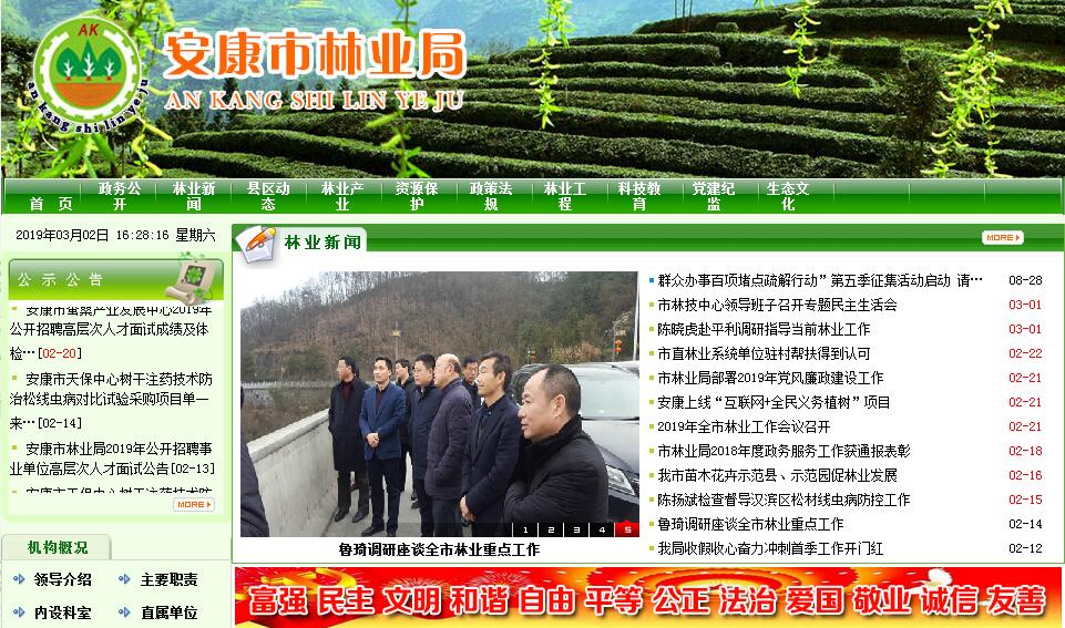 安康市林业局主要职责:(一)负责全市林业及其生态建设的监督管理。贯彻执行中、省、市关于生态建设、森林资源保护和国土绿化方面的法律法规和方针政策;研究并提出全市林业、蚕桑、茶果业发展规划并组织实施。(二)负责全市造林绿化工作。组织协调天然林保护工程、退耕还林工程、防护林体系建设工程的实施,指导公益林和商品林的培养管理;组织指导重点区域绿化工程;组织指导全市后备战略资源培育;组织指导森林培育、植树造林等生物措施防治水土流失的工作;组织全民义务植树,承办市绿化委员会日常工作;承办林业应对气候变化相关工作;依法实施对林木种苗、蚕种、果树种苗的管理,指导全市林木种子苗木基地建设。(三)负责全市森林资源保护、开发和监督管理工作。组织全市森林资源调查、动态监测;组织编制并监督执行森林采伐限额,监督林木凭证采伐与运输;组织、指导林地、林权管理;负责全市林业行政执法管理,开展林业普法宣传教育。(四)负责全市陆生野生动物资源、湿地资源的保护和开发利用;负责森林、湿地和陆生野生动物类型自然保护区的建设和管理;指导和监督濒危物种和国家保护的陆生野生动物、珍稀树种、珍稀野生植物及其产品的经营管理;组织指导全市森林病虫鼠害的防治、检疫。(五)组织、协调、指导全市森林防火工作,承担市森林防火指挥部的日常工作;指导全市森林公安工作和队伍建设,指导、协调全市破坏森林资源案件的侦破、查处工作。(六)负责组织指导全市林业改革和农村林业发展工作,贯彻执行国家、省、市关于集体林权制度、国有林场等重大林业改革政策,并监督实施;指导、监督农村林地林木承包经营、流转及林权管理,监督林权纠纷调处和林地承包合同纠纷仲裁。(七)制定、组织、实施全市林业产业发展规划,对全市木竹加工、林业化工、林业机械、森林旅游、林木花卉、林业多种经营等林业产业发展实施指导、协调和宏观管理,组织开展林产品质量监督,指导建立农村林业合作组织。(八)负责审核、指导全市林业系统的基础建设和技术改造项目负责全市林业资金的筹集、管理和监督、使用。(九)负责全市林业科技和教育宣传工作,指导林业队伍建设;指导全市国有林场、森林公园和基层林业工作机构的建设和管理。(十)承担市政府交办的其他事项。