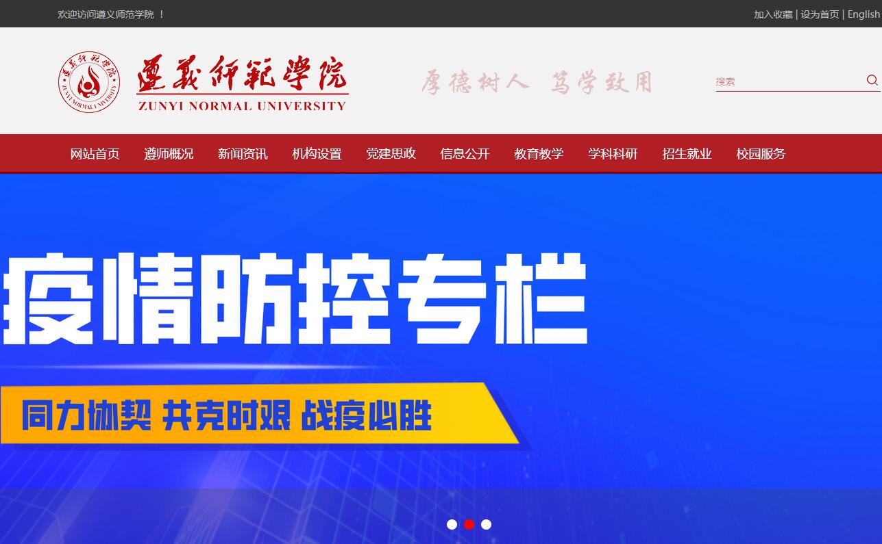 遵义师范学院位于闻名中外、有“红色圣地,醉美遵义”美誉的革命历史文化名城,是一所拥有百年教学历史的学府。1907年,遵义初级师范学堂在“兴学莫先于得师”的理念下应运而生,开启了遵义现代师范教育的先河,1958年正式成立遵义师范专科学校,2001年经教育部批准升格为遵义师范学院。2007年12月以良好成绩顺利通过教育部本科教学工作水平评估,2008年4月获得贵州省普通高等院校优美校园称号,2011年获“全国文明单位”,2014年成为贵州省首批特色文化学校,2016年获“全省高校加快发展目标绩效考核一等奖”。遵义师范学院是一所具有红色革命传统的学校,红军长征经过遵义的时候,毛泽东、朱德等老一辈革命家在原校址召开过万人大会,接受革命影响的师生踊跃参加革命,学校成了黔北新思想新文化的传播中心。经过百年发展,学校形成了“厚德树人,笃学致用”的校训、“遵道循义、敦品励学”的校风、“道业并重,德识双馨”的教风、“力学力思、求知求是”的学风。以“立足地方、服务基层”为己任,培养了大量扎根地方、面向基层的中小学优秀教师及服务地方经济社会的高质量人才。在全面深化改革和高等教育转型发展的新形势下,学校提出了改革发展的新思路:始终坚持以教育教学和人才培养为中心,努力实现创建应用型综合大学和培养适应地方经济社会发展和文明进步需要的高素质应用型人才目标,着重突出应用性、地方性和多科性,推动学校由单一师范院校向应用型综合大学转变、由服务基础教育为主向全面服务地方经济社会发展和文明进步为主转变、由注重基础理论培养向注重应用能力培养转变、由注重基础理论研究向注重应用研究转变。即:坚持一个中心、实现两个目标、着重三个突出、推动四个转变。学校位于新蒲新区大学城中心,规划用地2100亩,其中已完成北区建设1000亩,总建筑面积90万平方米。有教职工1107人,专任教师832人,其中具有博士学位教师120人,硕士学位教师455人,教授129人,副教授356人,双师型教师95人,兼职硕士生导师46人。有18个学院(教学部),普通本科专业47个,涵盖文、理、工、管、农等9大学科门类。学校面向25个省、市、自治区招生,并向俄罗斯、老挝、坦桑尼亚等八国招收留学生,现有普通本专科在校生14409人,留学生161人。有特色重点学科1个,省级重点学科5个,省级重点支持学科6个,省级特色专业2个,省级示范专业3个,省级综合改革试点专业8个,省级实验教学示范中心2个,省级精品课程4门,科技厅科技创新人才团队3个,教育厅创新团队4个,省级教学团队2个,省2011协同创新中心2个,省级特色重点实验室3个,省级工程中心和产学研基地9个,省级院士工作站1个,省级高校人文社科研究基地2个。2011年成为教育部红色经典艺术教育示范基地学校,2013年学校中国共产党革命精神与文化资源研究中心获批为教育部人文社科重点研究基地。在近年来就业竞争日益激烈的情况下,学校的就业率始终保持在93.96%以上。当前,学校正内聚人心,外树形象,深化改革,锐意创新,以习近平新时代中国特色社会主义思想统领发展全局,走内涵发展之路,着力坚持以教师教育为主体,做强做优师范类学科专业,注重学科专业建设与地方经济社会发展和文明进步需求高度契合,大力拓展工、农、经、管、商等地方急需的学科专业,着力培养“留得住、下得去、用得上”的具有奉献精神、创新意识和实践能力的高素质应用型人才,致力于把学校建设成为文化特色鲜明、对地方经济社会发展和文明进步具有人才、智力和技术支撑的开放、协同、创新、卓越的区域性高水平应用型综合大学。