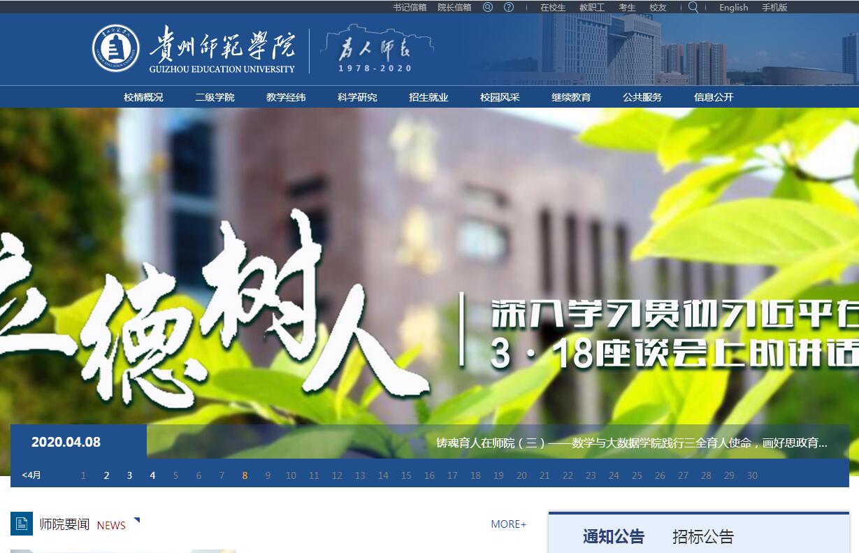 贵州师范学院位于贵州省贵阳市乌当区,是经国家教育部批准的省属全日制普通本科高等院校。学校前身是创建于1978年的贵州教育学院。2009年3月,经国家教育部批准,改制为全日制普通本科院校,并更名为贵州师范学院;同年9月,开始招收全日制普通本科学生。2012年12月,获学士学位授予单位资格。2015年11月,顺利通过教育部本科教学工作合格评估。2016年,学校增列为贵州省“十三五”硕士学位授予立项建设单位。学校占地面积779622.76平方米(1169亩),校舍建筑面积421628.90平方米;教学科研仪器设备资产总值12719.75万元。馆藏纸质图书101.05万册,电子图书133.08万册,纸质期刊1210种,18个中外文数据库。现有13个教学院(部),44个本科专业。学校现有全日制在校生12627人,本科生12493人,少数民族预科生117人,留学生17人。另有一所附属中学——贵州省实验中学。学校现有在职教职工1093人。教师总数841人,教授97人,副教授339人,博士176人,硕士550人。专任教师709人,专任教师中正高级职称65人,副高级职称305人;专任教师中教授65人,副教授298人,博士159人,硕士463人。贵州省管专家1人,贵州省教学名师5人,省级学术带头人4人,省甲秀文化人才1人。另聘有“千人计划”、“长江学者”等候鸟型人才2人。硕士生导师、博士生导师23人。学校现有国家级专业综合改革试点项目2个,省级专业综合改革试点项目5个。省级卓越人才教育培养计划项目7个,省级实验教学示范中心1个,省部级教学团队2个,省部级高层次研究团队3个,省级一流大学平台培育项目1个,省级一流大学课程重点建设(含培育)项目6个,省级一流大学专业培育建设项目1个。贵州省区域内一流建设培育学科1个,省级特色重点学科4个,省级重点学科2个,省级重点支持学科6个。现有国家级大学科技园1个,省级“2011协同创新中心”1个,省级高校人文社科基地2个,省级重点实验室1个,省级院士工作站1个,省级众创空间1个,省级计算平台1个,省级应用服务平台1个,省级科普基地1个,省级人才基地1个,省级大学生创业示范中心2个。近五年,学校共承担了85项国家级项目,其中国家自然科学基金项目42项,国家社会科学基金项目43项;省部级科研项目186项;横向项目124项;科研经费突破1亿元;获省部级以上科研成果奖30项;在国内外学术刊物及学术会议上发表论文3500余篇,其中核心及以上期刊发表1100余篇,其中SCI论文150余篇,CSSCI论文170余篇,EI论文20余篇,CSCD论文220余篇;出版专著与教材110余部;获国家专利授权100余项,软件著作权登记50余件。学校坚持开放办学,先后与美国、加拿大、泰国、台湾等国(境)外高校和教育机构建立了友好合作关系,并加入了“国际教育联盟”;与华中师范大学等高校建立了对口帮扶关系;与浪潮集团、腾讯云、贵州省各市(州)教育局、贵阳市乌当区人民政府等企业、教育机构与地方政府等机构签署合作协议,开展合作教育。改制以来,学校以“办好人民满意大学”为宗旨,秉承“为人师表”的校训,坚持“人一之,我十之;咬定青山不放松,不达目的不罢休”的贵州师院精神,艰苦奋斗,积极进取,主动服务贵州经济社会发展,培养德智体美全面发展的应用型高级专门人才。学校先后荣获贵州省高校第一所(批)“绿色大学”、“节能示范校园”、“安全文明校园”、“特色文化学校”和“全国高等教育学籍学历管理先进集体”、“贵州省学生事务服务中心示范点”、“贵州省优秀校园文化育人基地”、“贵州省阳光体育先进学校”等荣誉称号。获批“教育部西部地区中小学校长国家级培训基地”、“贵州省教育行政干部培训中心”、“贵州省中学教师继续教育培训基地”、“贵州省实验教师和实验技术人员培训中心”、“贵州省环境教育基地”和贵州省唯一的国家“华文教育基地”等平台。学校到2020年努力实现规模、结构、质量、效益协调发展,着力培育办学特色,全力推进办学层次提升,努力提升人才培养、科学研究、服务地方和文化传承创新等方面能力和水平,成为服务区域发展人才培养的中坚力量,科学研究、文化传承创新与服务地方发展的重要阵地,努力把学校建成在省内外有一定影响、特色明显的应用型、地方性、师范性、国际化高水平本科院校。