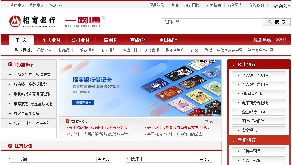 招商银行(China Merchants Bank)1987年成立于深圳蛇口,为招商局集团下属公司,是中国境内第一家完全由企业法人持股的股份制商业银行, [3-4] 也是中国内地市值第五大的银行。自2012年首次入围《财富》世界500强以来,已连续7年入围,2018年《财富》世界500强居213位。招商银行总行设在深圳市福田区,2002年4月9日,招商银行A股在上海证券交易所挂牌上市。2006年9月8日,招商银行开始在香港公开招股,发行约22亿股H股,集资200亿港元,并在9月22日于港交所上市。资本净额超过2900亿、资产总额超过4.4万亿。截至2017年上半年,招商银行境内外分支机构逾1800家,在中国大陆的130余个城市设立了服务网点,拥有5家境外分行和3家境外代表处,员工7万余人。此外,招商银行还在境内全资拥有招银金融租赁有限公司,控股招商基金管理有限公司,持有招商信诺人寿保险有限公司50%股权、招联消费金融公司50%股权;在香港全资控股永隆银行有限公司和招银国际金融控股有限公司。招商银行发展目标是成为中国领先的零售银行。1995年7月推出银行卡一卡通,1999年9月启动中国首家网上银行一网通,成为众多企业和电子商务网站广泛使用网上支付工具,在一定程度上促进了中国电子商务的发展。2016年8月,招商银行在"2016中国企业500强"中排名第39位。