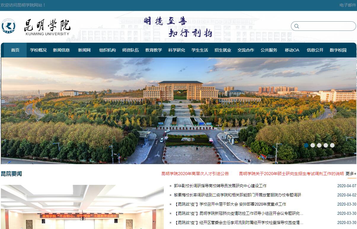 昆明学院是国家教育部2004年5月批准建立的全日制普通高等学校,在原昆明师范高等专科学校和原昆明大学合并的基础上整合昆明市优质教育资源组建而成,是目前云南省学科门类最齐全的本科院校。2012年通过教育部本科教学工作合格评估。2017年被命名为云南省应用型示范院校。2018年学校获批硕士授予单位。2015年荣获第四届全国文明单位。学校位于四季如春、风光秀丽的历史文化名城——昆明市。校园总占地面积2366亩,其中,洋浦新校园1817亩,规划建筑面积60余万平方米,建成面积48.2万平方米;另有校外实习基地549亩。校园环境优美,功能齐全,设备现代。学校固定资产总值20多亿元。学校现有60个本科专业,18个特色专科专业,覆盖了经济学、法学、教育学、文学、历史学、理学、工学、农学、医学、管理学、艺术学11个学科门类。现有21个院(系):经济学院、社会管理学院、学前教育与特殊教育学院、体育学院、人文学院、外国语学院、音乐学院、美术与艺术设计学院、信息技术学院、自动控制与机械工程学院、城乡建设与工程管理学院、农学院、医学院、旅游学院、教师教育学院、数学系、物理科学与技术系、化学科学与技术系、生命科学与技术系、马克思主义学院和继续教育学院。面向全国25个省(直辖市、自治区)招生,现有全日制本专科学生18700多人。学校坚持育人为本,突出教学中心地位。以“教学质量工程”建设为抓手,深化改革,全面实施素质教育,努力提高教学质量和育人水平。按照信念执著、品德优良、知识丰富、本领过硬的要求,以“思想品德优,理论基础实,专业能力强,综合素质高”为基本规格,着力为国家和地方经济社会发展培养“上手快、后劲足、能创新”的高素质应用型人才。目前获得批准立项的国家级、省级“教学质量工程”建设项目达到203项,总数名列省内同类院校前列。毕业生就业率高居省内同类院校前列,被教育部评为全国高校毕业生预征工作先进集体,被省教育厅评为毕业生就业工作“先进集体”、大学生创业先进集体。学校坚持人才强校,大力培养引进高层次人才,全面提高教师队伍的整体素质。采取有力措施,加强“内培”、“外引”,着力加强队伍建设。现有在职教职工1615人,其中,专任教师1091人;博士及在读博士228人;教授及其它正高职称人员126人,其中,二级教授4人,副高485人。有省级教学团队5支,省级名师工作室8个,省级教学名师12人,以及一批国家级、省市级有突出贡献专家和学术技术带头人。学校坚持科研兴校,以高级别项目和应用研究为重点,基础研究和应用研究协同推进,着力提高科学研究的质量和水平。目前获得批准立项资助的国家基金项目达到76项,国家级和省部级科研项目总数在较短时间内跃居省内同类院校前列。500多篇论文被SCI、EI、ISTP收录,1200多篇论文在全国中文核心期刊发表。滇池(湖泊)流域生态文化研究基地成为省哲学社会科学研究基地。《昆明学院学报》和《旅游研究》的办刊水平不断提高,学报先后荣获云南省优秀期刊奖、全国高校科技期刊优秀编辑质量奖和全国高校优秀社科期刊奖。学校坚持以服务地方经济社会为己任,立足昆明、研究昆明、服务昆明,主动融入地方经济社会发展,以服务和贡献开辟自身发展的新空间。积极调整人才培养方案,增设一批经济社会发展急需的新专业,与相关企业合作开展“订单式”培养人才。先后成立了“昆明科学发展研究院”、“昆明滇池(湖泊)污染防治合作研究中心”、“滇池泛亚合作战略研究院”、“昆明市物联网及泛在工程技术中心”4个高层次研究平台和一批院(系)所结合的研究机构,并在相关领域开展了卓有成效的工作。先后获得中央财政支持地方高校发展经费5200万元,其中,滇池(湖泊)流域生态修复与生态文化研究平台获中央财政及滇池治理基金会1600万元的专项支持。紧扣“两强一堡”战略和滇池污染治理,积极承办“昆明科学发展高层论坛”、“滇池泛亚合作战略研究”和“国际水历史学会2012年国际区域会议”等国际会议和重要论坛,举办“昆明讲坛”、“学思讲坛”等4个学术讲坛。积极推进校地合作、校企合作、校际合作。学校的知名度和影响力不断提升。学校坚持开放办学,积极开展校际交流合作,探索推进国际化进程。先后与美国、英国、澳大利亚、新西兰、日本、泰国、芬兰、新加坡、马来西亚等20个国家和地区72所高校和教育机构签订127余份合作协议和备忘录,10余个专业招收留学生,先后成立荷兰BTEC教育培训中心、昆明学院曼德勒华文教育中心、东盟商学院、爱尔兰中心、瑜伽中心、中加学前教育中心、昆明学院曼谷实习基地、昆明学院•巴黎第五大学合作研究中心、昆明学院缅甸职业技术教育中心、中泰餐饮文化研究中心等10个国际交流合作平台。与此同时,与南京大学、兰州大学等国内高校开展交流,在若干领域签订了合作协议,并互派交流师生。学校精神文明建设成效显著,先后荣获全国“六五”普法中期先进单位、第四届全国文明单位等国家级荣誉称号,多次被云南省委、省政府命名为“云南省文明单位”,被省委高校工委、省教育厅命名为“省级文明学校”,被省教育厅、省社会治安综合治理委员会、省公安厅评为“云南省平安校园”,被昆明市委、市政府命名为“昆明市平安建设先进