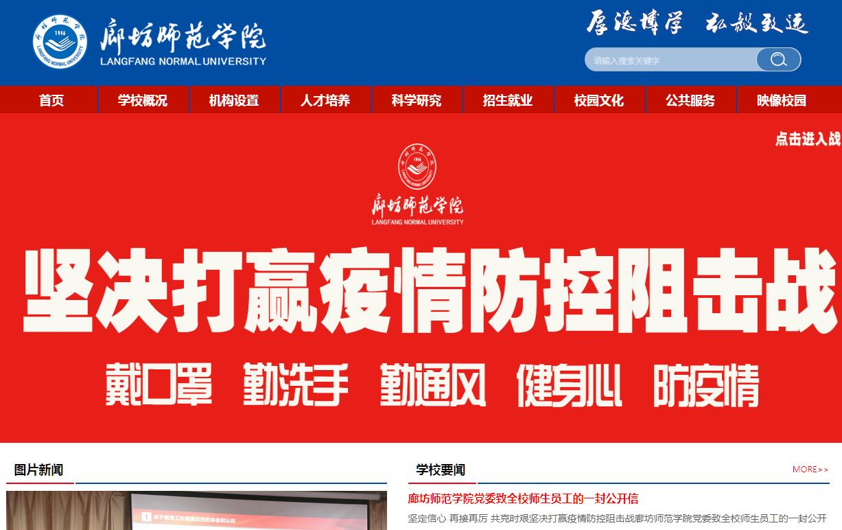 廊坊师范学院是一所省属全日制普通本科院校,坐落于京津走廊上的明珠城市--河北省廊坊市。其前身为1946年建立的安次县立简易师范学校,1956年改为河北廊坊师范学校,1964年升为河北廊坊师范专科学校。2000年经教育部批准,廊坊师范专科学校、廊坊市教育学院、廊坊师范学校合并,成立廊坊师范学院。2004年12月,经河北省政府批准与河北职业技术学院合并,组建新的廊坊师范学院。学校分廊坊、固安两个校区办学,占地2000亩,建筑面积45万余平方米,固定资产总值5.24亿元,教学科研仪器设备总值1.59亿元,馆藏文献140万册,电子图书113万册。学校设有15个二级学院、思想政治理论课教学部,14个党政部门和4个教辅单位,形成了普通本(专)科教育、高职教育、继续教育等多种教育形式的人才培养体系;学科专业涵盖文学、历史学、教育学、法学、理学、工学、经济学、管理学、艺术学等9个门类。2016年,被确立为硕士学位授予立项建设单位。学校现有全日制本专科生18400名,教职员工1399名,其中专任教师937人,具有副高级以上职称的教师390名,具有博士、硕士学位及研究生以上学历的教师784名。享受国务院特殊津贴专家1人,省政府特殊津贴专家和突出贡献专家2人,“三三三人才” 20人,国家级优秀教师1名,省级优秀教师5名,省级教学名师 1人,省级优秀教学团队1个。学校办学实力逐步增强,打造了教师教育为主体的办学特色。现开设本、专科专业90个。拥有1个国家级“专业综合改革试点”、 1个国家级特色专业、2个省级教育创新高地、3个省级“专业综合改革试点”、 4个省级特色专业、4个省级重点发展学科、1个省级虚拟仿真实验教学中心、1个省级校外实践教学基地、5个省级实验教学示范中心。学校作为“河北省中小学教师培训基地”,连续多年承担“中小学教师国家级培训计划”和省、市级培训项目。学校秉承“为人、为学、为师”的师范文化传统,弘扬“厚德博学、弘毅致远”的校训精神,精心培育大学文化。近年来,先后被中宣部、教育部、团中央、全国学联评为“全国大中专学生暑期‘三下乡’社会实践先进单位”,被中央精神文明办、文化部授予“全国文化先进社区”,被国家体育总局授予“群众体育先进单位”等称号。学校高度重视科研工作。现建有25个科研机构,主办5种学术期刊。《廊坊师范学院学报》(社会科学版)为全国优秀社科学报,《语文教学之友》为河北省十佳期刊。2010年以来,承担各级各类科研项目1200余项(含平台类项目),其中国家自然科学基金、国家社科基金等国家级项目16项,省部级项目199项。获得省部级以上奖励19项,各类专利授权77项。学术论文被SCI、EI、SSCI、CSSCI收录600余篇,专著、译著和教材近130部。学校坚持开放办学,国际交流合作水平不断加强。与英国、美国、加拿大、俄罗斯、韩国、日本、瑞典、台湾等多个国家和地区的高等院校及科研机构建立了合作关系;与美国利兹马克瑞大学、英国格拉斯哥大学、桑德兰大学、加拿大滑铁卢大学、马来西亚马来亚大学等10多所海外院校在教学、学生交流、学分互认、教师培养、合作科研等领域开展了广泛合作。学校积极组织本专科学生赴国外学习或文化交流,现有50名留学生;近三年推荐汉语教师志愿者、公派汉语教师赴国外孔子学院和孔子课堂任教79人次,接收国外教师任教28人。新的历史时期,学校以习近平新时代中国特色社会主义思想为指导,积极贯彻党的教育方针,以立德树人为根本任务,以服务区域经济、教育、科技、文化发展需求为办学使命,适应高科技网络信息化时代和“大众创新、万众创业”的发展趋势,以教师教育为主体,以非师范教育为两翼,强化人才培养的中心地位,深化人才培养模式改革,促进学校教育与京津冀协调发展对接、融合,推进大学文化辐射地方文明建设,努力把学校建设成多学科、多层次、开放式、有特色的高水平应用型师范大学。