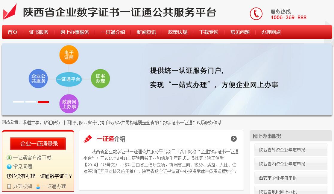 根据《国务院关于促进市场公平竞争维护市场正常秩序的若干意见》(国发【2014】20号)“建立健全政务中心和网上办事大厅,集中办理行政审批,实行多个部门一个窗口对外,一级地方政府一站式服务,减少环节,提高效率(县级以上地方各级人民政府负责)”和《国务院关于促进信息消费扩大内需的若干意见》(国发【2013】32号)“优化确需保留的行政审批程序,推行联合审批、一站式服务,限时办结和承诺式服务”的精神,陕西省企业数字证书一证通公共服务平台项目(以下简称“陕西省企业一证通平台”)于2014年8月11日获陕西省工业和信息化厅正式立项批复(陕工信发【2014】275号文)。该项目由省工信厅立项,协调省工商、税务、质监、人社、住建等部门开展对接及应用推广,陕西省数字证书认证中心承建并运维。通过“陕西省企业一证通平台”,企业使用“一证通数字证书”登录“企业数字证书一证通”门户(yzt.itcenter.gov.cn),足不出户,即可完成工商网上年报、税务网上报税、质检年检、社保缴纳、公积金申报等业务办理。同时该平台还提供在线签订合同、在线代账、客户管理等企业常用服务及“一证通数字证书”网上办理服务。该平台建立实现了各部门业务系统证书互认,为各类企业在不同政府部门、不同业务系统在线办事提供统一数字认证服务,是进一步提高政府服务水平和质量、加快转变政府职能的重要手段,对健全全省诚信体系有重要意义。
