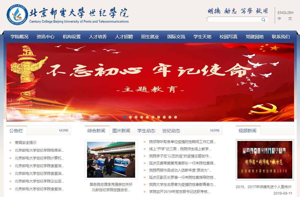 北京邮电大学世纪学院2005年经教育部批准成立,由北京邮电大学与北京学涵教育科技有限公司按照新的机制和新的办学模式合作举办的全日制本科普通高校,是教育部直属高校在京举办的第一所独立学院。学院位于延庆区康庄镇,现有校园占地500亩,建有充足的教学及辅助用房,独立的图书馆大楼及实验楼。图书馆藏书65万余册,电子图书23万余册,可访问数据库71个,能够充分满足学生学习需要。学院授课教师由北京邮电大学选派的教师、学院专职教师、外聘教师(含刚从高校退休的教师、业内相关的工程技术人员)组成。学院现有专兼职教师420人,其中具有高级职称的教师达33%以上。学院立足于电子信息领域,以通信工程、电子信息工程等电子信息类专业为重点,以数字媒体类专业为特色,建成了涵盖工、管、文、艺4个学科的专业理论教学体系、实践教学体系和素质教育体系。学院现设有通信与信息工程系、电子与自动化系、计算机科学与技术系、经济管理系、艺术与传媒学院、外语系、基础教学部7个教学单位,共有通信工程、电子信息工程、物联网工程、物流工程、机械电子工程、自动化、计算机科学与技术、软件工程、电子商务、财务管理、数字媒体艺术、数字媒体技术、传播学、英语等14个在招专业,在校生近5000人。学院建有院级实验教学中心7个,各中心下设实验室,全院共有90个实验室,开出900余个实验项目。经过10余年时间的建设和发展,数字媒体实验教学中心、工程教育训练中心、互联网商务管理实验中心先被评为“北京高等学校实验教学示范中心”,我院成为国内独立学院中少有的获得3个省市级实验教学示范中心称号的高校。学院依托3个市级示范中心,建立了通信工程综合实训基地、网络工程综合实训基地、机器人综合实训基地、经济管理综合实训基地、数字媒体综合实训基地等5个校内综合实习实训基地,1个北京市重点实验室,1个国家级大学生校外实践教育基地,1个北京市级校外人才培养基地和1个北京市高等学校示范性校内创新实践基地,满足了学生专业应用能力培养的需要。学院先后与中兴通讯、中国移动、水晶石、中国邮储等151家企业签订了实习实训基地协议书,派出学生进入企业实习实训,在企业导师的指导下完成毕业设计;派出教师参加企业的暑期实践,保障了人才培养与专业行业的发展紧密结合。同时,学院积极引进企业资源进入校园,与中兴通讯公司共同创办了北邮世纪—中兴网络通信学院,培养符合通信领域新技术人才需求的专业人才;与亿阳信通公司共同开办“亿阳班”,有针对性地培养应用型现代通信人才。学院立足本科教育,拓展国际合作,积极探索“本科学历教育+英语+专业证书+境外学习”的人才培养新模式,成为国内第一所获批加入雅思全球搜索引擎系统的中国高校,也是第一家获得接受留学生资质的北京地区的独立学院。学院先后与英国、法国、日本、美国、韩国、芬兰、德国和台湾地区等高校签署了校际友好院校并实施了合作项目,创办了中法工程师部,引进了日本先进的的计算机科学与技术专业课程,中美物联网学分互认交流学习项目,开展了学历教育和短期课程培训合作,对学生进行职业化和社会化训练。目前,学院已有300余人赴英、法、美、日、韩、芬兰、德国等国家进行学习交流,已经接受14批次留学生来我院就读。学院师生学科竞赛成绩显著,到目前为止,学生参与美国国际大学生数学建模竞赛,全国软件专业人才设计与开发大赛,全国大学生网络商务创新应用大赛,国际水下机器人大赛,华北五省、北京市大学生机器人大赛,全国大学生电子设计竞赛、北京市大学生计算机应用技术大赛、大学生计算机设计大赛、首都高校物流设计大赛等各类竞赛,共105人次获得国际奖项、296人次获国家级奖项、2022人次获省部级奖项,获奖人次居同类院校前列。多位教师在北京民办教育园丁奖、全国大学英语教学大赛、北京高校思想政治理论课教学基本功等比赛中获奖。我院科研课题组主导制定的手机(移动终端)动漫标准正式成为国际技术标准,被评价为“是文化领域中国科技、中国标准走向世界的重要标准。”学院十届毕业生平均就业率达到98%以上,3300余人就业于国有企事业单位,近740人考取硕士研究生。学院成立了创新创业教育中心,开展系统的创新创业教育并创建大学生科技创新基地,下设7类工作坊,2间工作室,每年投入专项经费近50万元。同时,在学院的大力支持下,学生创业热情高涨,成功案例不断涌现,学院被评为“全国青年创业教育年度先进集体”“全国民办高校创新创业教育示范学校文化建设奖”。随着学院的建设和发展,学院得到了社会的广泛认可,影响力逐步提高,先后荣获“全国先进独立学院”“北京市5A 级社会组织”“中国动漫游戏人才培养先进单位”“全国软件专业人才设计与开发大赛优胜学校”“全国最具品牌影响力独立学院”“北京市大学生创新实践活动优秀组织院校”“北京市无偿献血优秀组织单位”“军(警)民共建先进单位”等称号,并成功打造国家新媒体产业基地动漫创作及人才培训中心、国家安全生产宣传教育数字产品研发基地、全国工业和信息化人才培养综合服务平台认定测评中心、中国民办教育学会高等教育专业委员会培训基地,多次获得北京市安全系统集