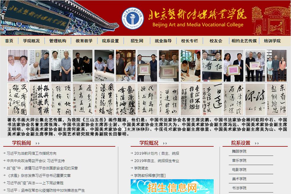 北京艺术传媒职业学院及其前身成立于1994年,是经北京市人民政府批准,教育部备案,具有独立颁发学历文凭资格,以艺术与传媒并列命名的综合性艺术传媒类普通高等学校。2013年12月2日,经北京市教委批文同意(京教函【2013】589号《北京市教育委员会关于同意北京新圆明职业学院变更校名的批复》),学院更名为北京艺术传媒职业学院。学院的校训是:以老庄为友,以孔孟为友,更以智慧为友。学院的大学精神为:忠诚无私、坚韧不拔、创新创造。文化部原副部长王文章担任学院名誉院长。学院董事长杨波兼任院长。当前由50余名著名艺术家、院士、专家学者担任学院顾问和学科带头人。当前学院设立有5大学科、24个专业。美术学科:美术(国画方向)、艺术教育(书法方向)、文物修复与保护(书画鉴定方向)3个专业;表演学科:舞蹈表演、音乐表演、戏剧影视表演3个专业;设计学科:艺术设计、广告设计与制作、动漫制作技术、服装与服饰设计、数字媒体艺术设计、会展策划与管理、展示艺术设计7个专业;传媒学科:新闻采编与制作、影视编导、网络新闻与传播、播音与主持4个专业;财经学科:工商企业管理、国际经济与贸易、城市轨道交通运营管理、计算机应用技术、文秘、商务英语、旅游英语7个保留专业。学院位于北京市海淀区中关村科技园区,占地200余亩,建筑面积约5万平方米,紧邻国家AAAA景区北京凤凰岭自然风景区,花木环绕、空气清新,是求学读书的理想场所。学院的办学理念是“以德治教、育人为本”。学院以培养基础理论扎实,知识面较宽,艺术创作与展示能力强,素质高,具有创新和敬业精神的高等艺术应用型专门人才为根本目标,努力建设成为在北京地区民办高校中具有“窗口”和示范作用的人民满意的优秀大学。由于办学业绩较为突出,学院被北京市政府有关部门评为“先进民间组织”、“北京市自律诚信先进民办非企业单位”;学院党组织三次被中共北京市海淀区委教育工委评为“先进基层党组织”;学院团委获得了共青团北京市委授予的“以德治教、育人为本”荣誉称号,还被海淀区团委评为“海淀区教育系统先进团委”、“校园文明礼仪教育示范团委”等。在开展学习实践科学发展观活动中,学院党总支被评为“海淀区教育系统学习实践科学发展观活动先进集体”。在建国60周年大庆中,我院师生因参与由北京市国庆60周年庆祝活动筹备委员会群众游行指挥部组织的群众游行活动并表现出色,获得了“首都国庆60周年庆祝活动服务保障工作优秀组织奖”。2017年4月19日,市教委专家组在进校听课意见反馈会上肯定了学院“公益、规范、诚信、特色”办学名副其实。2017年5月4日,海淀区委教育工委党建巡视组莅临巡视期间,对学院党建工作和办学精神予以充分肯定。2018年4月18日,我院资助宣传工作在市资助培训大会上获得市学生资助事务管理中心点名表扬。学院自成立前后至今坚持公益办学30年,曾多次组织北京市优秀师资赴革命老区义务讲学,培养教师,资助失学儿童少年,组织所资助的老区中学与北京市重点中学结成友好学校。三十年来,学院先后资助了陕西延安、福建龙岩、湖北黄冈等二十个革命老区、贫困地区以及西藏、新疆等边疆地区品学兼优的贫困学生数千人,减免本院学生学费上万人次。学院精准扶贫、资助贫困子弟的范围横跨十七个省市,七百多个县,一千三百多个村,为社会培养毕业生一万余人,为国家节约教育经费达十几亿元。学院以实际行动响应并践行了习总书记“精准扶贫”、“脱贫攻坚”、“教育扶贫”的号召,为贫困家庭及其子弟谋了幸福。这也是按照中央精神为“在发展中保障和改善民生”尽了绵薄之力。特别是自党的十八大以来,学院在自身经济状况困难的情况下,连续五年,共拿出助学资金五百余万元,资助了革命老区和边疆地区贫困子弟五百余人。学院“扶贫助教 济困助学”的义举和“平民化”的办学思想,得到了党和政府各级领导、艺术界、科教界知名人士以及社会其他各界的大力支持。由于学院扶贫济困、公益办学突出,我院以杨波董事长兼院长为代表的品格风范,受到社会媒体的关注与多次报道。2015年1月11日,央视新闻联播【行进中国 精彩故事】将杨波院长的思想事迹作为典型报道。杨波院长同时被新闻频道《真诚沟通》栏目作为友善代言人播出70余次。《人民日报》、《光明日报》、《中国教育报》、《中国青年报》、《北京晨报》、《北京晚报》、《京华时报》、《法制晚报》系列报道充分佐证了我院公益办学的赤诚之心,良好的社会效应,以及较高的社会认可度。古人云:“德不孤,必有邻”。学院“忠诚无私、坚韧不拔、创新创造”的大学精神,二十多年来感召了一百多位两院院士、三百余位名家大师,齐聚北艺传媒,助力人才培养。同时学院深厚的文化底蕴,为创办艺术教育基地奠定了坚实的基础。由于学院办学公益性十分突出,许多著名书画艺术家包括启功、关山月、白雪石、罗工柳、田世光、张仃、黄永玉、陈昔未、钱绍武、欧阳中石、沈鹏、刘炳森、范曾、张海、刘大为、苗再新等多年来以实际行动倾情支持学院办学。一大批艺术大师向学院捐赠艺术品力作,许多已成为绝唱。中国广播艺术团等一批艺术团体以及著名表演艺术家姜昆、冯巩、李金斗、黄宏、郭冬