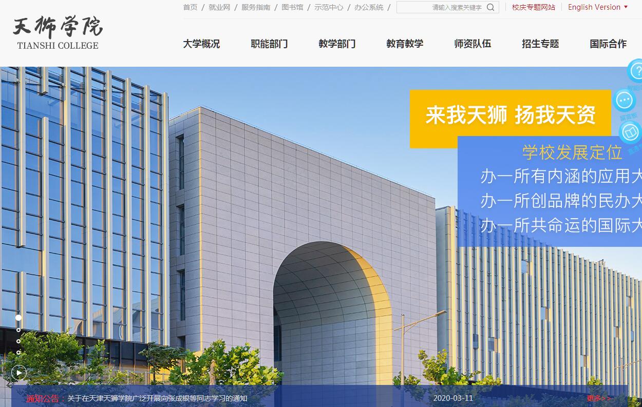 创建于1999年的天津天狮学院(Tianshi College)是一所创新型大学,是市属全日制综合类普通高等学校,由天狮集团有限公司投资兴办。学校致力于探索具有新时代特色的教育模式,培养应用型创新人才。天狮集团董事长李金元先生任学校董事长。学校坐落在“京津走廊”的天津市武清区,位于龙凤河南岸,占地3.2平方公里,整体建筑规划210万平方米,可容纳3万余名学生在校学习、生活。学校以工学、管理学科为主,兼具文学、经济学、医学和艺术等学科,教学科研仪器设备总值4700余万元,藏书61万册,实现了文献信息管理及服务的计算机网络化。2015年12月,学校通过教育部“本科教学工作合格评估”。学校将以现有学科为基础,筹建天元大学(Tianyuan University),借鉴国际知名大学的办学理念,秉承“有特色、高水平、国际化”的办学定位,围绕立德树人的根本任务,以学科建设为龙头,以人才强校为支撑,以提升质量为核心,以国际化为特色,以综合改革为动力,不断提升人才培养、科学研究、社会服务、文化传承的创新水平和办学质量,培养天津市和中国未来发展需要的创新型、复合型应用人才。学校以国家和天津市“千人计划”专家或其他高层次人才领衔组建相关院系,以本科教育为核心,大力发展留学生教育,努力拓宽中外合作办学渠道。学校设有电子信息工程、生物工程、金融学、市场营销、汉语国际教育、护理学、产品设计等31个本科专业,涵盖工、管、文、经、医、艺六大学科门类。并设有工商企业管理、市场营销、通信技术、计算机应用技术、数字媒体艺术设计等5个高职专业。设有信息科学与工程学院、食品工程学院、经济金融学院、商学院、外国语学院、医学院、艺术与设计学院等7个二级学院;设有思政部、数理部、体育部等3个教学部。学校现有全日制在校生7000余人。学校现有专任教师330人,其中高级职称教师114人,具有博士、硕士学位的教师266人,具有行业任职资格、工程背景的“双师型”教师65人。近三年,获天津市师德先进集体1个,获天津市优秀教师、天津市民办教育先进个人、天津市师德先进个人、新长征突击手等荣誉称号12名。另外,学校聘请了多位国内外知名的专家学者为兼职教授。学校正积极面向全球广揽贤才,招聘各类高层次专业教师,以加强师资团队的建设。为实现“建设有特色、高水平、国际化的应用研究型大学”的奋斗目标,学校确立实施“四大战略”,即学科立校战略、特色兴校战略、人才强校战略和国际优校战略,及突出“六大重点”,即学科布局合理化、人才培养精细化、科学研究精品化、管理工作服务化、信息平台集成化、校园观景生态化。学校正在筹建旨在培养未来拔尖应用人才的特区—“天元学堂”,将根据相关学科和专业设立“菁英班”、“拔尖人才实验班”、“国际实验班”等“人才培养模式创新试验区”。学校还将全面实施“本科生导师制”,建立本科生全程化、全覆盖、个性化的学业指导机制,以充分发挥“辅导员+班主任+导师”三方协同育人作用,充分发挥导师在学生的思想、专业、学业、职业规划等方面特有的指导和引领作用,从而实现学生综合素质的全面提升。同时,为充分满足同学们凭兴趣和特长进行专业选择、专业学习的意愿,学校实施更为灵活的转专业政策方案。学校始终坚持以学生为本的办学理念,深入贯彻落实大学生教育管理分类指导机制,不断提升对在校生的帮扶、服务意识,构建了“经济上资助、思想上引导、学业上辅导、心理上疏导、就业上指导、生活上关爱”的六位一体“大助学”体系。学校设立完善的校内奖助学金制度,严格执行、全面落实国家奖助学金政策,奖助学金覆盖面达36%以上。学校推进国际化战略,以培养具有国际视野的高级应用人才为目标,将国际化理念贯穿于学校工作的各个方面。学校积极借鉴和引进发达国家先进的教学模式、课程体系、教学方法和管理经验,助推学校教育教学改革。学校重点加强与世界知名高校、海外高校强势学科的学校交流与合作,已经或正在与美国天普大学、迈阿密大学、佛罗里达大学、特拉华大学、波特兰州立大学,英国爱丁堡龙比亚大学等国外知名院校开展“2+2”、“3+1”、“2+2+1”联合培养项目,并为同学提供众多出国读研、读博的机会。学校计划选拔优秀学生参加上述国际交流的项目,并提供奖助学金。另外,学校积极吸引留学生来校学习,近年来已培养了400余名来自哈萨克斯坦、俄罗斯、韩国、加拿大等国家的留学生。我们真诚邀请有理想、有志向、有抱负的青年才俊来天元,尝试和体验新天元,追逐青春梦想,做好职业规划,提升自身价值,成就精彩人生!
