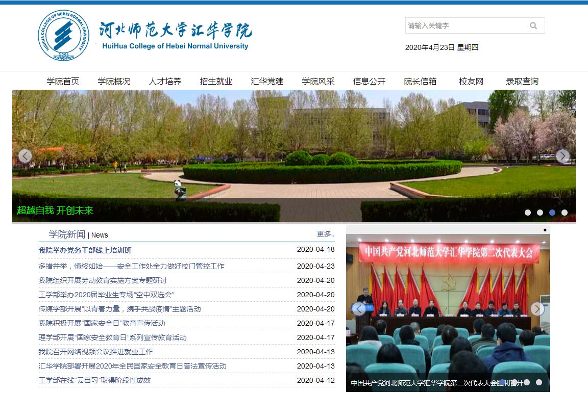 河北师范大学汇华学院成立于2001年6月,是河北省政府批准、教育部确认的全日制本科层次的独立学院。汇华学院坐落于石家庄市西南高教区,学院师资力量雄厚,教学设备齐全,校园环境优雅,是一所园林式书院。学院现设有9个学部,52个本科专业,覆盖经济学、法学、教育学、文学、历史学、理学、工学、管理学、艺术学等9大学科门类,在校生11000余人。汇华学院秉承河北师范大学优良传统,充分发挥校本部雄厚的教育资源优势,选聘优秀教师担任全部主干课程的教学。学院现聘任专任教师705人,其中教授111人、副教授306人,具有博士学位的225人、硕士学位的372人。建院以来,汇华学院认真贯彻教育部26号令,不断探索新的办学机制和办学模式,注重提高教学质量,精心培育人才,逐步形成了一套科学、高效、规范、具有我院特色的管理体系和运行机制。2010年我院被评为"全国先进独立学院"。2014、2015、2016年在武汉大学中国科学评价研究中心(RCCSE)和中国科教评价网(www.nseac.com)公布的全国独立学院排行榜中均位列全国前十。在中国校友会网2017全国师范类独立学院排名中列第7位。汇华学院以建设国内一流独立学院为目标,坚持"以学生为本,以教学为中心,一切为了学生成才"的办学理念,遵循"改革兴校、质量立校、发展强校"的办学思想,坚持新的办学机制和办学模式,各项工作取得了长足进展。广大学生努力进取,学习成绩、综合能力普遍提高。多名学生在"外研社杯"全国英语演讲大赛、全国高校化学专业师范生教学素质大赛、全国大学生数学建模竞赛、中国舞蹈"荷花奖"校园舞蹈大赛、全国大学生广告艺术节等重要赛事上屡获殊荣,多次取得优异成绩。学院考研录取率始终保持着较高水平,连续多年考研录取率达到20%以上,在全国独立学院中处于领先地位。建院18年来,汇华学院已为国家培养3.5万余名各类专业人才。学院始终把毕业生就业工作列入重要工作日程,发挥"一网、一报、一平台"的就业信息服务功能,积极开展校园招聘活动。学院通过开展校企合作,积极开拓校内外实践基地,与清华大学国家服务外包人力资源研究院、大唐移动通信设备有限公司、无锡文思海辉软件技术培训公司、Encompass technologies (中国研发中心)等10多家企业签订校企合作协议,为学生的实习、实训及就业提供服务与保障。学院多次荣获"河北省大中专毕业生就业工作先进集体"称号,毕业生就业率连续11年保持在90%以上。我院师范类专业结合学生特点,组织和选拔优秀学生积极参与"顶岗实习支教工程",2010年9月10日,我院在兴隆县六道河中学顶岗实习的张静等3名同学,非常荣幸地与时任国务院总理温家宝共度教师节。2013年6月8日,中共中央政治局常委、国务院总理李克强到河北师范大学视察,了解大学生就业情况,我院历史学专业学生耿佳嘉、美术学专业学生安静慧有幸与总理交谈,聆听总理的教导与嘱托。汇华学院的发展得到了教育部、省委省政府、教育厅的高度关注和支持,河北省两任主管教育副省长刘健生、龙庄伟先后到学院视察,教育部有关领导和专家多次到学院考察,对学院的发展建设、管理工作及软硬件环境给予了肯定。蓬勃发展的汇华学院正展开强壮的双臂,迎接更加绚烂的明天,全体汇华人怀着满腔的热忱,弘扬优良传统,坚持改革创新,向着建设特色鲜明的高水平应用技术型大学而不断努力奋斗!
