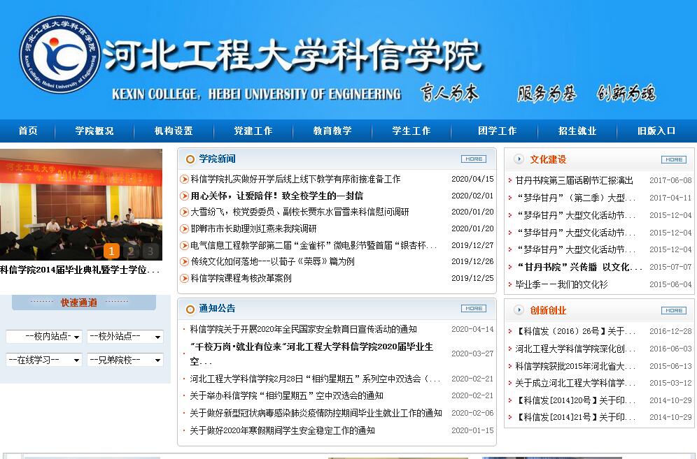 河北工程大学科信学院,是依托省属骨干大学——河北工程大学举办,2001年7月经河北省人民政府批准成立的一所全日制本科层次的独立学院。2003年12月教育部予以确认。2005年,学院以优异的成绩通过了教育部“独立学院办学条件和教学状态专项检查”,2012年取得学士学位授予权。学院座落在国家历史文化名城、中国成语典故之都 —— 河北省邯郸市,校园与河北工程大学主校区毗邻,占地600余亩,设施先进,环境优美,办学条件优良。学院依托河北工程大学的品牌专业资源,根据国家和区域经济社会发展需求,科学合理的设置有建筑学、土木工程、水利水电工程、电气工程及其自动化、机械设计制造及其自动化等27个本科专业。学院面向全国招生和就业,现有在校全日制本科生10000余人。学院拥有一支学术造诣深厚、教学经验丰富、职称学历结构合理的师资队伍。学院现有专任教师616人,其中高级职称教师312人,博士70人,硕士546人。学院秉承河北工程大学“立德立志、善学善行”的优良校训,推行“以人为本”的教育理念,以培养高文化艺术素养的技术型应用人才为目标,依托河北工程大学的人才优势,全面推进“3+1”、“2+2”、理科实验班、英语实验班、公务员考试试点班等人才培养模式改革,积极开展校企合作和行业资格认证,建有80个实习实训基地,实施“多层次、多样化”的分类人才培养,逐步探索出一条适合学生特点的具有可持续发展能力的办学之路;校风学风优良,学习氛围浓厚。学院通过不同层次的学生科技创新和辅教助学活动,提高了学生的创新能力和综合素质;积极开展丰富多彩的校园文化活动,建立“鲜声合唱团”等25个学生特色社团,努力营造良好的校园文化氛围。近年来,学院共有900余名学生考取了研究生、国家公务员,800多名学生在国家、省、市举办的科技创新、文体活动等大赛中获奖,其中国家级奖励70余项,省级奖励300余项。