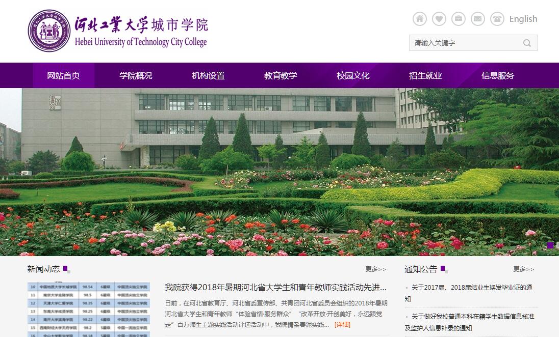 河北工业大学城市学院于2001年经河北省人民政府批准成立,并于2004年经教育部重新审核予以确认,在天津市红桥区和河北省廊坊市分别设有校区。河北工业大学城市学院办学所依托的母体学校——河北工业大学的前身是创办于1903年的北洋工艺学堂,是我国最早的培养工业人才的高等学校,创办了全国最早的高校校办工厂。1929年改称河北省立工业学院,1995年更名为河北工业大学。114年来,学校始终秉承“勤慎公忠”的校训精神,坚持“工学并举”的办学特色,形成了“勤奋、严谨、求实、进取”的优良校风,现已发展成为一所以工为主、多学科协调发展的国家“211工程”重点建设高校,是河北省人民政府、天津市人民政府和教育部共建高校,2016年入选河北省“国家一流大学建设”一层次学校,2017年入选国家“世界一流学科”建设高校,学校将重点建设“先进装备工程与技术”学科群。近年来,材料科学、化学、工程学三个学科领域分别进入ESI全球排名前1%。母体学校设有18个教学机构,建有71个本科专业,涵盖工、理、经、管、文、法、艺七大学科门类。拥有2个国家重点学科、4个河北省强势特色学科、20个河北省级重点学科;3个学科入选河北省世界一流学科建设项目,4个学科入选河北省国家一流学科建设项目;纳入了天津市学科建设体系,3个一级学科、5个特色学科(群)入选天津市“双一流”建设名单,新增7个天津市重点学科;学校在国家第四轮学科评估中14个学科榜上有名,7个学科进入B级。拥有9个博士后科研流动站、10个一级博士学位授权学科、26个一级硕士学位授权学科、7个专业学位类别(含MBA和EMBA)、17个工程硕士授权领域,是全国地方工科院校中最早开展MBA教育的高校,同时也是河北省内唯一开展EMBA教育的高校。母体学校大力实施人才强校工程,高水平人才引进和培养机制不断完善,引才、聚才的氛围越来越浓郁,人才工作不断实现新突破。近年来,学校已全职引进和培养国家“千人计划”入选者、“长江学者”、“国家杰出青年基金”获得者、国家“万人计划”科技创新领军人才7人,并成功引进数百名高水平博士,290余人具有国家级教学名师、“新世纪百千万人才工程”国家级人选、国务院特殊津贴获得者等省部级以上专家称号。河北工业大学城市学院认真落实人才培养工作的中心地位,以创新创业教育改革统领教育教学改革,积极探索提高独立学院教育教学质量的途径和手段,不断创新人才培养模式。学院加大教学改革的力度,优化课程体系结构,不断强化质量意识,努力适应城市学院“应用技术型大学”的办学定位,主动适应经济发展新常态,坚持以服务区域经济社会发展为重点的教学体系改革。与北大纵横管理咨询集团、天津企业创新人才促进会、天津华明高新区管理委员会推进产教融合,进行深度合作。近两年来,学院学生参加全国及河北省、天津市各项各类竞赛,有160余人次获得包括国际以及国家特等、一等奖项在内的各类奖项。河北工业大学城市学院始终把立德树人作为教育的根本任务, 实现全员育人、全程育人、全方位育人,实施“百名非物质文化遗产传习人”工程,并结出累累硕果,屡出先进典型。冰窟救人“河北最美大学生”周桂川同学,见义勇为勇抓小偷的齐贺同学,辽宁舰退役士兵“蓝色勇士”王雅道同学、古彩戏法传习人王艺达同学以及“感动中国”2014年度人物杨乃斌同学等均为学院素质教育的杰出代表,他们的事迹被全国多家媒体报道700多篇(次),向全国、向世界释放了河北工业大学城市学院的正能量,弘扬了学院的优秀文化。河北工业大学城市学院就业指导中心被评为“河北省高等院校毕业生就业工作示范中心”。河北工业大学城市学院被评为2014年全国教育系统先进集体、2015中国十佳独立学院、2016-2017全国教育改革创新示范院校、2017京津冀影响力品牌等荣誉称号。学院发展迈进了“新时代”、踏上了新征程。 学院正在抢抓机遇、乘势而上,以应用技术型人才为培养目标,充分发挥精诚团结、奋斗拼搏、开拓创新、争创一流的优良传统,以时不我待、只争朝夕的精神,不断深化学院综合改革,着力提升服务区域经济社会发展的能力和水平,同心同德,同向同行,凝心聚力,奋发有为,力争将学院建设成质量高、效益好、影响大,科学发展、特色鲜明的中国一流独立学院!
