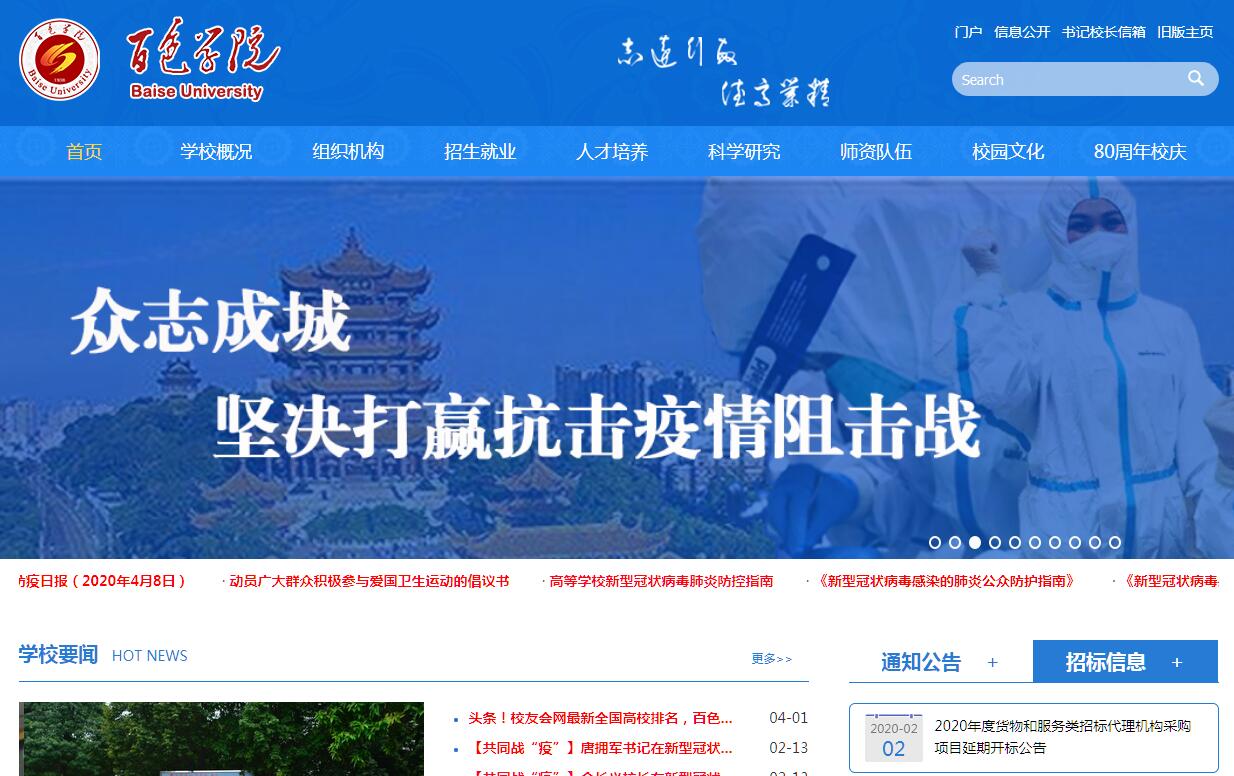 百色学院是2006年教育部批准成立的普通本科高校,实行“区市共建,以市为主”的管理体制。办学历史可追溯到1938年成立的广西省立田西师范学校,历经百色师范学校、百色师专、百色地区师范学校、右江民族师专等阶段。79年来,学校坚持在“老、少、边、山、穷、库”地区办学,凝练了“团结合作、艰苦奋斗、克难攻坚、磨砺成才”的“石磨精神”,走出一条艰苦创业的发展之路;秉承“志远行敏、德高业精”校训,为社会输送了10万名“下得去、留得住、用得上、干得好”的专门人才,有力促进了区域经济社会及教育事业的发展,为边疆民族地区的经济发展、社会进步和国防巩固作出巨大贡献。学校升本以来,坚持以“弘扬传统、团结务实、奉献拼搏、争先创新”的百色精神办学育人,科学谋划,艰苦创业,经过“明晰思路、寻求合作、创新模式”等探索改革阶段,实现了从专科教育为主向本科教育为主、从师范教育为主向产业服务型教育为主的“两个转型”,办学水平显著提升,2014年,成为广西首批4个整体转型发展试点高校之一。学校占地面积1873.59亩,分东合、澄碧两个校区,占地1606亩的百东校区即将兴建。现有建筑面积38.06万平方米,教学科研仪器设备总值1.48亿元;校内实验(实训)室210个,校外实践教学基地123个,馆藏图书100多万册(电子图书234多万册)。学校在职教职工985人,其中专任教师781人,具有高级职称教师217人,硕士生导师22人,“双师型”教师224人。有20个二级学院,46个本科专业、30个专科(高职)专业,涵盖经济学、法学、教育学、文学、理学、工学、农学、管理学、艺术学等9大学科门类,形成以人文社会类学科专业集群为基础,产业服务类学科专业集群为主导,多学科专业协同发展的学科专业结构。学校面向全国20多个省(自治区、直辖市)招生,各类学生21100人,其中普通高等教育学生17469人(本科生13520人、专科生2825人、预科生1124人),继续教育学生3631人;招收来自泰国、老挝、柬埔寨、巴基斯坦、索马里、赞比亚等国家的留学生92人。现有自治区级优势特色专业群3个,自治区级优势特色专业7个,自治区级创新创业教育改革示范专业1个,自治区级精品课程9门,自治区级大学生校外实践教育基地建设项目1个,自治区级协同育人平台1个,自治区级教学团队6个,广西高校区级实验教学示范中心2个,广西自治区级众创空间1个,广西创新人才培养基地3个,是广西教师教育重点培育基地。2008年以来,共获得自治区级教学成果奖16项。2009年以来,共有3124人次学生获得1576项自治区级及以上学科竞赛奖,其中487人次学生获得198项国家级奖;3名学生获得“中国大学生自强之星”称号、3人次学生获得此项提名奖,320多名学生被评为自治区优秀毕业生、三好学生和优秀学生干部,23个班级被授予自治区先进班集体。近年来,毕业生就业率均在93%以上,学校连续四年荣获“广西普通高校毕业生就业工作先进集体”称号,学校大学创业园入选“广西普通高校首批大学生创业示范基地”名单。升本以来,学校秉承学科专业一体、教学科研互动理念,学科建设和科学研究有力地支撑和促进了教学改革和人才培养。现有自治区级重点学科5个,广西高校重点实验室、人文社会科学重点研究基地、广西教育科学重点研究基地、校地校企共建科技创新平台8个,被确定为广西马克思主义理论研究和建设工程研究基地。2013年,学校被自治区教育厅确定为硕士专业学位立项建设单位。2007年以来,共获得国家社科基金项目、自然科学基金项目39项,省部级科研项目80项;科研资助经费1700多万元、配套经费1979.9万元,总经费3700多万元。全校教师共发表学术论文近4000篇,其中被SCI、EI收录140多篇,全国中文核心期刊发表800多篇;出版专著、编著和教材80多部;共获得厅级以上科研成果奖160多项,其中省部级20项(一等奖1项,二等奖4项,三等奖15项,优秀奖1项),译著《布洛陀史诗》(壮汉英对照)获中国文联评选的第十一届中国民间文艺“山花奖”。学校坚持走开放办学道路,注重校际合作、校企合作、国际合作。近年来,先后与华南师范大学、广州大学、广西民族大学、桂林理工大学、中山大学签订了对口帮扶协议;与百色市各个县(区)政府和104多个区内外企事业及其他单位签订人才培养合作协议,其中与广州市劳动力市场服务中心签订了应用型人才培养输送与合作协议;与美国2所大学、越南2所大学、泰国10所大学及4个府、马来西亚3所大学、俄罗斯1所大学、德国1所大学等签订合作办学协议,其中马来西亚英迪国际大学、马来西亚北方大学、泰国程逸皇家大学、泰国清迈皇家大学、泰国沙功那空皇家大学承认我校对应专业的学分;选派173名学生到上述国家签约高校学习,选派379名学生到泰国甲米府、春蓬府等地中小学进行由当地政府给付薪酬的汉语教学实习;泰国如诺大学等多所高校先后派出师生到我校开展教学和学习活动;成立了中国百色学院—泰国甲米府“汉语言文化中心”“百色学院—马来西亚高校合作共建人才培养基地”;先后组团参加6届东盟广西国际教育展,到美国、越南、泰国、马来西亚、法国、德国等国家高校进行教育考察交流。近年来,学校先后获得“全国教育改革创新优秀奖”“全国红色经典艺术教育示范基地”“国家级语言文字规范化示范学校”“全国中华经典诵读试点单位”“全