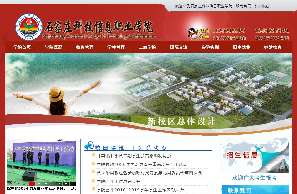 石家庄科技信息职业学院始建于1987年10月,位于河北省政治、文化教育和经济中心石家庄市,地处交通便利、文化底蕴浓厚的西南高教区,是经河北省人民政府批准、国家教育部备案的大学专科层次的省属普通高校,按国家计划面向全国统一招生。至今已有31年的办学历史。学院遵从“育人为本、服务学生、服务社会”的办学理念和“厚德、博学、自强、求实”的校训,全面转入“内强素质、外树形象”的内涵发展期,努力建设“省内双一流、全国知名”的高职院校,为河北经济腾飞培养更多的人力资源,做出应有的贡献。学院经过30多年的发展,已形成了以机电、医药、交通、信息、经管类专业为主,工、经、医、艺术等学科协调发展”的学科专业体系,开设学科专业47个,现在校生8000余人。学院实行院、系两级管理。设有电子信息、艺术设计、交通运输、经济管理、医学与制药工程、机电工程学院,基础部、实验实训中心、现代信息中心、继续教育学院等七学院一部两中心。新校区项目规划占地1243.65亩,办学规模为2万余人,总投资约计20亿元。新校区项目分三期建成,校园基础设施建筑53万平方米。将建成环境优美、文化氛围浓郁、配套设施齐全、具备现代化科技氛围的崭新校区。学院积极响应《河北省教育厅关于编制高等学校设置“十三五”规划有关问题的通知》(冀教发〔2017〕6号)的文件要求,已提交“申请设立河北科技信息学院(拟)纳入河北省本科高等学校设置十三五规划”的申报材料。申请以现有“石家庄科技信息职业学院”为依托,设立“河北科技信息学院”(拟)应用型本科高校,重点培养以工学学科为主的应用型技术人才,助力河北省、京津冀区域经济改革发展。学院分别于2007年5月和2012年5月,顺利通过教育部人才培养工作评估,专家组均给予了高度评价。学院曾荣获“2015年度全国十佳优秀思科网络技术学院”、“河北省依法诚信办学学校”、“河北省管理示范院校”、“河北省明星院校”、“河北省招生工作先进集体”、“电子行业职业技能鉴定先进单位”等荣誉称号。学院现有占地面积690余亩,总建筑面积17万平方米。建有校内实验实训室75个,教学仪器设备总值5700余万元;学院拥有覆盖各系多个专业的校外实训基地170余个,图书馆各类纸质藏书56.1万册,满足了普通教育和成人教育学生的教学、实训需要。学院共有专任教师408人,副教授以上职称129人“双师型”教师132人。师资队伍结构相对稳定,满足了教育教学需要。学院经河北省人力资源和社会保障厅审批,建立国家级职业技能鉴定所,开展会计从业资格证、营销师、物流师、化学检验工、食品检验工、公共营养师、车工、钳工、CID制图员、维修电工、汽车维修工、计算机装调员、广告设计师、企业人力资源管理师等20余种职业技能鉴定培训服务,学院与多家企业建立了合作关系,开发课程,培养人才为提升学生职业技能提供条件。毕业即就业。学院与深信服网络科技有限公司、北京中航铁服教育投资股份有限公司、北京中标华安信息技术有限公司、北京华育网科技发展有限公司、天津力神电池股份有限公司、浙江天煌科技实业有限公司等10余家企业设立订单班,学生毕业即就业。出国留学深造。学院与德国安哈尔特应用技术大学合作办学项目开设食品营养与检测、机电一体化技术两个专科学历教育专业,完成项目教学计划所规定的课程,德语成绩符合要求后可以去德国继续学习获取德国的本科毕业证书和学士学位证书。其余专业与马来西亚世纪大学、马来西亚英迪国际大学合作。