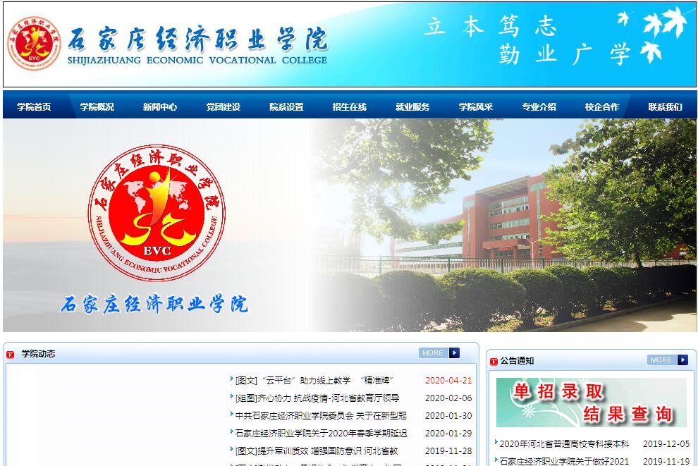 石家庄经济职业学院始建于上世纪90年代,是经河北省人民政府、教育部批准的普通高等院校,旨在为现代社会培养经济管理领域高素质高技能型专门人才,独立颁发国家普通高等学历文凭。经过数十年发展,学校已发展成占地面积2000多亩,在校生数万人,拥有三个校区的综合性高校。学校现有三简路校区、正定校区和西柏坡校区三个校区。三简路校区位于石家庄市桥西区三简路16号,可容纳学生人数5000人,主要以中职、职业成人教育为主;正定校区位于石家庄市正定区,可容纳学生人数10000人,主要以高职大专教育为主;西柏坡校区位于国家著名的5A级景区西柏坡,占地面积2000亩,建筑面积40万平方米,校区设备完全按照国家教育部本科标准要求进行建设,十三五期间全部建设完毕。学校学科齐全、结构合理,设有护理学院、国际交流学院、影视航空学院、中职学院、成人教育学院五所二级学院,拥有经济管理系、护理系、信息工程系、会计系、汽车机电系、交通管理系、艺术系七个系,设有46个专业。其中教学改革试点专业15个,特色专业9个,校级精品课程32门,校级教学团队15个;自2011年以来成功申报两个河北省高等学校人文社会科学研究项目;自2011年以来在河北省护理教学质量考核中多次获得省卫生厅、省教育厅联合授予的“临床护理技能考核优秀学校”称号。学院2011年被共青团石家庄市委评为“石家庄市红旗团委”称号;2016年被石家庄市团市委评为“石家庄市先进团委”称号;2017年荣获“第七届河北省教育系统志愿服务工作先进单位”称号。学校现有全日制普通专科在校生7248人,中职在校生3000多人。现有教职工1000多人,其中专任教师489人,其中正高21人、副高127人。学校办学实力雄厚,建有专业实验室158个,配备教学用计算机1020台,语音听力设备960座,多媒体教室28个,2240多座位。图书馆目前有图书69.93万册,其中当年新增12.43万册,电子图书50万册,报刊杂志200多种。在新的教育形势下,我院采用“技能培训+学历教育+职业资格认证+劳务输出”的人才培养模式,使我院学生在毕业时具有更强的就业能力。我院学生在毕业当年可参加专接本考试,升入重点院校本科深造,也可进入与我院有合作关系的国外大学直接攻读硕士学位。学校注重学生实习实训基地建设,实施“一个专业、一个公司、多个基地”办学理念,先后与北京、郑州、太原等多家用人单位签订实训实习协议,与教育集团、餐饮旅游集团等省内外百余家企业建立了校企合作关系。以工作岗位为导向、以实践应用能力为本位的改革工程、以顶岗实习为基础的毕业综合实践模式已走在全省高职院校前列。学校坚持开放式办学理念,积极开展全方位、多层次的国际交流与合作,目前已与韩国多所高校建立合作交流关系,设有中韩国际交流学院。每年有国外专家学者来我校任教、合作科研和开展学术交流活动。学校将以“专家治学,诚信河北,专业教育,科普中国”为己任,为河北乃至全国培养更多的复合型涉外人才。石家庄经济职业学院秉持“立本笃志 勤业广学”的校训,本着让家长放心、让学生学会生存,为社会培养和谐人才的办学理念,殚精竭虑,继往开来,大胆创新,不断探索,以科学发展观为指导,全面提升办学水平,努力开创更加辉煌灿烂的明天。