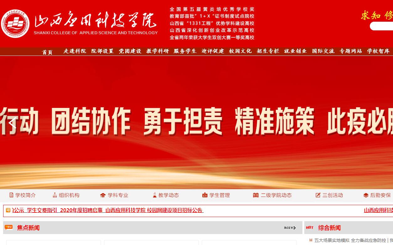| 网站简介: 山西应用科技学院创建于1991年,2014年经国家教育部批准成为涵盖管理学、经济学、工学、艺术学、文学、教育学等多学科应用型、国际化、综合性全日制普通本科高校。学校是山西省应用型本科高校联盟理事长单位,引领地方本科高校负重前行。学校先后荣获全国第五届黄炎培优秀高校、山西省“1331工程”优势学科建设高校、山西省应用型本科试点高校、山西省深化创新创业教育改革示范高校称号,综合实力居地方本科高校前列。学校地处山西转型综改示范园区,南接太原潇河现代产业园,北邻太原教育园区,周围高校林立,高新企业环抱,交通发达,是未来地铁、磁悬浮交通枢纽的腹地,从市区来校十分便利,未来发展前景美好。学校开设22个本科专业,21个专科专业,在这里你会与13000余名同学、600余名老师一起共度人生美好时光。学校奉行“以质量求生存,以特色求发展”的办学理念,以“追求应用型与学术性融合,致力于专业与产业链对接”为核心理念,已先后为社会输送了六万余名各类合格的应用型人才。 |