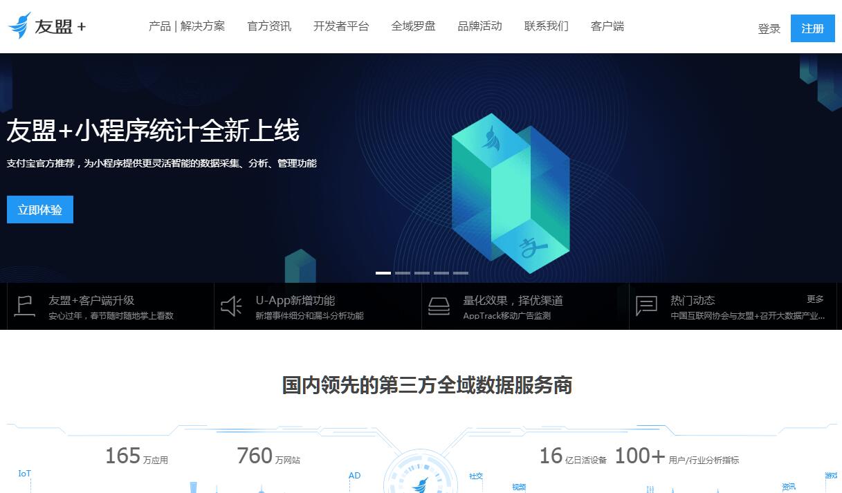 | 网站简介: 友盟+网站是由北京锐讯灵通科技有限公司拥有并运营,友盟+是公司自有品牌。友盟+,国内领先的第三方全域数据服务商。以“数据智能,驱动业务增长”为使命,基于卓越的技术与算法能力,结合16亿日活设备的全域数据资源,挖掘出41个标签大类,15,000+客群标签、100+用户/行业分析指标,通过AI赋能的一站式互联网数据产品与服务体系,帮助企业实现深度用户洞察、实时业务决策和持续业务增长。友盟+已累计为165万款App、760万网站提供9年的专业数据服务。 |
