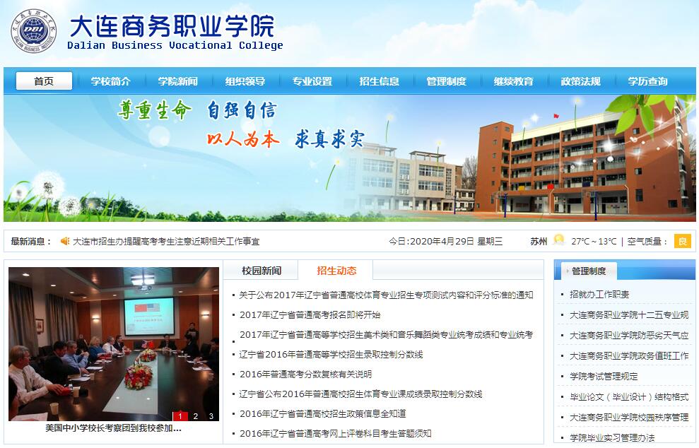 大连商务职业学院创建于1997年,是经辽宁省人民政府批准、国家教育部备案的一所以培养专业型实用型商务人才为主的全日制普通高等院校。学院坐落于国家级港口城市、东北亚国际航运中心、国际物流中心、风景秀丽、充满生机活力、最适宜人居的浪漫之都——大连。学院办学条件优良,校园占地面积40万平方米,建筑面积15万平方米。校园是集山水为一体的生态型、园林式、现代化的校园。学院师资力量雄厚,拥有一支结构合理、理论实践水平高、教学经验丰富的师资队伍,拥有各类教职工400余人,其中教授、副教授占教师比例的18%,双师型教师占85%,研究生以上学历占50%以上,具有远洋航海资历的教师占70%以上,学院还聘请了大连大学、大连交通大学等知名高校的教授任教。学院按照[ISO9001]质量标准设立教育质量管理体系,优质的师资和科学的教学管理体制为学院办学质量提供了保障。学院根据社会需求开设50余个市场紧缺型专业,各类专业特色鲜明,学院紧紧围绕就业需求,不断优化专业结构,建有一批特色专业、省级示范专业,欢迎广大考生报考。学院教学设备齐全,建有多功能的教学大楼,综合实训楼,高标准学生公寓楼9栋,可同时容纳万人同时就餐的学生餐厅,学院建有现代化图书馆、多功能报告厅和标准体育场;建有数控实训室、模具实训室等各类专业实验实训室47个,同时还拥有大量先进的多媒体教室、微机室、语音室、阶梯教室等;教学设施和设备的先进程度在同类院校中位居前列。学院实行半军事化管理,在校期间统一着装。目前学院共有全日制在校生6000余人;学院学生管理工作始终坚持严格管理和耐心细致的思想教育相结合,严之有理、严之有情、严之有度,校园文化的特色和品位日益突出。学院始终坚持以就业为导向,以实现毕业生零距离就业为宗旨,大力开展校企合作,实现订单式培养,为企业、为社会培养优秀高素质、技能型人才,赢得了用人单位和社会的好评。江海气度,日月风华。在新的历史阶段,学院坚持以商务类专业学科教育为龙头,抢抓中国高职教育发展的战略机遇,全面贯彻落实科学发展观,力争规模、结构、质量协调发展,为实现优秀一流大学的宏伟目标而努力奋斗!