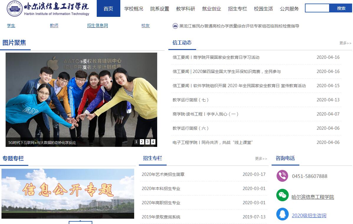 哈尔滨信息工程学院始建于1995年,是经国家教育部批准的普通本科高等院校。20年励精图治,现拥有两个校区,分别坐落在江北学院路和哈东(宾西)国家经济技术开发区。校园占地面积1044亩,校舍建筑面积25.6万平方米,教学仪器设备总值5261.18万元,图书76.8万册;专任教师473人,副高级以上的任课教师达41%。校园占地面积、校舍建筑面积以及一流的硬件条件建设,在全省同类院校名列前茅!国家教育部批准的黑龙江省仅有的2所"国家示范软件学院",其中一所是久负盛名的哈尔滨工业大学,另一所就是异军突起的哈尔滨信息工程学院!"办国内一流高校"是我校奋力追求的办学目标!学校秉承"积极、踏实、学习、开放"的校风和"规范严谨、精益求精"的校训,"培养卓越工程师”是我们的教育理念。学校的教学改革,实现了"与世界知名企业深度合作";学生管理改革,率先引进了香港大学"书院制"管理模式,提高了学生的综合素养;实验室与一流企业共建,锻炼了学生的实际操控能力与工程能力……方方面面改革,让学校风生水起,博得广泛的社会声誉!我校现有本科专业7个,高职专业7个,其中国家重点建设专业2个,中央财政支持重点建设专业2个,省重点专业7个,全国电子信息产业紧缺人才培养基地1个。软件、计算机专业与苹果合作培养IOS开发工程师,与谷歌合作培养ANDROID开发工程师;电子信息工程专业与华为合作培养芯片设计工程师、通信工程师;电子商务专业与阿里巴巴合作培养数据分析工程师、电商运营工程师;视觉传达设计专业与中影动画合作培养动画设计师……长期的校企合作,受益于与企业共享具有丰富实践经验的工程师,共建现代化实验室,让学生学到生产一线先进的工程技术,从而能够成为符合世界一流企业规格与标准的技术人才。我校作为教育部“教育信息化试点单位",校园网络实现全覆盖。具有现代特色的"微课程"、"移动学习"、"网络教研"等新型网络学习体系的建设,以及互联网、大数据、云计算等高科技知识的应用,拓展了学生的视野,提高了学生创新能力,深受用人单位的欢迎。毕业生大多就业于北京、上海、深圳、大连、哈尔滨等一线城市,部分学生进入苹果、华为、阿里巴巴、联想等高端企业就职。我校学生毕业出口通畅,薪酬待遇高于省内同类院校,几年前就被教育部授予了“全国普通高校毕业生就业工作先进集体”。我校哈东新校区的启用,将会成为再次实现跨越式发展的新起点!新校园独具匠心的规划设计和高标准建设,使新校园充满生机与活力,因而成为哈东一处最靓丽、最引人注目和驻足的新景观:依山傍水的地理位置、雄伟壮观的教学大楼、卓尔不俗的大学生艺体活动中心、高雅别致的国际交流中心、绿草如茵的凝萃园、碧波荡漾的荷花湖、奔流不息的猞猁河、苍翠欲滴的太平山……小桥流水的温馨,亭台楼阁的浪漫,让校园洋溢着盎然生机!新校园花园式的怡人景观,正是通过借鉴欧美一流名校绿色、低碳的先进理念,特意选址建成了这座适宜学习和生活的现代化校园,让年轻的生命可以规避闹市的雾霾和噪音污染,从而享受新校园清新的空气与蔚蓝的天!而且新校园毗邻一所新建的民生医院,为全校师生的健康保障提供了非常方便的医疗条件。建设国内一流哈尔滨信息工程学院任重道远!我校师生将责无旁贷地肩负起教育兴国,人才兴邦的历史重任,为圆中华民族繁荣昌盛之“梦”,做出应有的贡献!