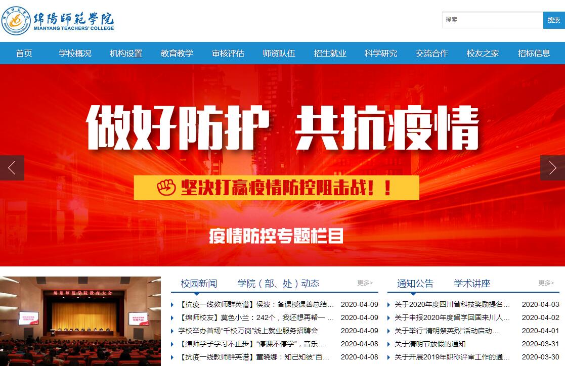 绵阳师范学院是四川省属全日制普通本科院校。学校坐落在被誉为“蜀道明珠”的中国科技城、李白出生地——全国文明城市绵阳。春秋更迭,爝火薪传。2002年经国家教育部批准,绵阳师范学院由原绵阳师范高等专科学校和绵阳教育学院合并组建成立。2006年成为学士学位授予权单位,2007年以良好成绩通过国家教育部本科教学工作水平评估,2011年获准成为“服务国家特殊需求项目”试点单位,开始招收环境工程专业学位硕士研究生。建校以来,学校积淀形成了“自强不息、艰苦奋斗、务实创新、追求卓越”的精神,“育人为本,服务地方”的办学理念,“厚德、博学、笃行、弘毅”的校训,“弘文励教,止于至善”的教风,“学思并重,知行合一”的学风。累计为国家培养了12万余优秀学子。黄钟轻叩,九皋鸿渐。学校现有高新校区、游仙校区和丰谷校区,校园占地面积近两千亩,建筑面积46万余平方米,建有现代化的图书馆、教学楼、实验楼、体育场馆等服务设施。现有16个二级学院,54个全日制本科专业,覆盖9大学科门类。现有高级职称教师440人,博士128人,博、硕士生导师46人,享受国务院特殊津贴专家、四川省学术和技术带头人及后备人选、四川省有突出贡献的优秀专家、四川省教学名师11人次,市级人才称号专家5人。现已形成研究生教育、全日制本专科高等教育、成人本专科高等教育及留学生教育的人才培养体系,在校研究生、全日制本专科学生、留学生17000余人。弘文励教,止于至善。学校围绕立德树人根本任务,立足“教学型、地方型、应用型、师范型”的办学定位,坚持“师范做强、艺体做精、应用转型”,按照“教师适应课程、课程适应专业、专业适应学生,学生适应社会”的改革思路,培养服务基础教育的优秀师资和区域经济社会发展需要的高素质应用型人才。学校立项建设省级特色专业7个,省级教学团队3个,省级专业综合改革项目2项,省级“卓越计划”项目7项,四川省高校实验教学示范中心3个,四川省教师继续教育培训中心1个,省级精品课程18门。近三年,学校完成各级质量工程、卓越工程、教学改革等项目906项,学生在四川省和国家级师范生教学能力大赛中获奖39项。创新创业,蔚然成风。学校构建了创新教育优秀师资培养模式,把创新创业教育融入人才培养全过程,取得了丰硕的成果。学校建有中国科协创新工作室、中国创造学会实验基地、四川省青少年科技创新教育基地。学生承担各级科研、创新创业项目1599项,成功申报国家专利790项,学生在科技文化活动中获得国家、省和市级奖励2000余人次,获得“创青春”创新创业大赛全国金奖,自主创业项目100余项。教研相长,服务地方。学校坚持科研为地方经济建设和社会发展服务,着力打造“教育服务”“科技服务”“文化服务”三大品牌,积极推进“政产学研用一体化”建设。学校建有四川省重点实验室1个,省、市哲学社会科学重点研究基地、社科普及基地12个,省级高水平研究团队2个。近三年学校承担国家自然科学基金、国家社会科学基金和省部级科研课题68项,在核心期刊上发表论文822篇,其中SCI129篇,出版学术著作71部;开展校地合作与服务等项目100余项;积极参与国家乡村振兴战略,对接平武县、苍溪县开展教育扶贫、智力扶贫、文化扶贫,组织团队协助当地进行新村规划、产业扶贫等,为当地经济社会和文化教育事业发展作出积极贡献;充分发挥教师教育特色,助推中小学教师专业化成长,近三年培训中小学教师达4万余人次。以文化人,以文育人。学校着力培育校园文化,实施主题教育月、节庆日活动和“一院一品”建设。收集整理国家、省非遗项目名录近3000项,场馆教育模式获得全国优秀奖,“梦之声”合唱团多次赴省内外演出,大学生科技文化艺术节、社团风采节等系列品牌活动已成为一道靓丽的风景线,形成了“博、雅、趣、活”的校园文化氛围。开放办学,接轨国际。近年来,学校与德国、美国等国家、地区的多所高等院校和科研机构合作,开展师资培养、科研合作、学术交流、学生交流等活动。弦歌颂雅,风华赓续。站在新的历史发展起点上,学校紧紧抓住国家“一带一路”倡议、四川省“三大发展战略”、中国(绵阳)科技城建设和新建本科院校转型发展历史机遇,以习近平新时代中国特色社会主义思想为指引,聚焦综合改革,推进转型发展,提升教育质量,奋力将学校建设成为特色鲜明、优势突出,在西部地区有一定影响的应用型大学。