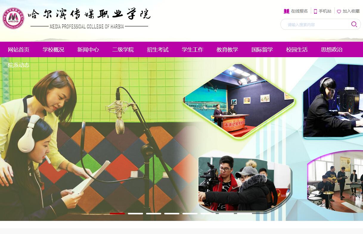 在美丽的北国冰城哈尔滨,镶嵌着一颗绚丽夺目,魅力四射的传媒艺术明珠——哈尔滨传媒职业学院。学校创办于1989年,系黑龙江省人民政府批准,国家教育部备案的全日制普通高等学校,国标代码13302;黑龙江省报考代码4064。2018年10月13日我校被黑龙江省教育厅批准为单考单招试点院校。学校坐落于哈尔滨市南岗区学府路延伸线102国道1289公里处。办学30年来,已经为社会培养应用型人才4万余人,其中50%以上毕业生已经拥有了自己的企业。近年来学校充分发挥自我办学优势,以培养应用型人才为主,锐意改革创新,正在以超强之势迅猛崛起。学校设有传播与艺术学院、商学与工程学院、国防预备生基地、航空服务培训中心、远程网络教育中心、艺考培训中心等六个二级教学单位。拥有教职工270余人,其中普通高等教育硕士以上学历教师160余人,高级职称教师53人,占全院专任教师的33%;研究生学位教师占专任教师的80%;双师型教师占专任教师的70%;同时中青年教师占专任教师的75%以上;校级名师47人。开设普通高等教育专业26个,其中重点专业5个:播音与主持、室内艺术设计、新闻采编与制作、影视编导、计算机网络技术;特色专业5个:戏剧影视表演、音乐表演、视觉传播设计与制作、摄影摄像技术、酒店管理;直招士官专业3个:计算机网络技术、汽车检测与维修技术、软件技术(直招士官专业是依据总参谋部、教育部、财政部等8部委联合启动的高校士官生直招工作有关精神,为更好的适应部队选拔技术士官的需要而设置的,我院系黑龙江省人民政府征兵工作站,中国人民解放军黑龙江省军区南岗武装部国防后备生共建基地)。学科建设上充分发挥传媒领域学科特色和综合优势,已经形成了以新闻传播和广播影视学科为龙头,工学、管理学、经济学等多学科协调发展,相互交叉渗透的学科体系。学校坚持社会主义办学方向,践行“全人”教育理念,突出人才的个性化教学模式。拥有新闻直播间、广播直播间、1000平米大演播室、400平米演播厅、播音主持实训基地,MIDI音频编辑工作教室、非线性编辑实训教室4个(工作站50台)、动漫设计工作站48台,100平米大录音棚、20平米小录音棚3个,100平米舞蹈室、400平米大舞蹈室,摄影摄像实训教室、200平米画室、20平米琴房12个、管乐器48件、打击乐器45件、语音教室4个、设计实训教室10个、新闻发布厅、汽车实训室1000平米、物流实训室、会计实训室、计算机中心、餐饮实训室、客房实训室、房地产销售实训室、400平米航空舱实训教室;专业体育训练馆;同时与多家电视台、影视公司、传媒公司等校外企事业建立了校企合作关系,为学生的实习实训搭建了良好的平台。学校坚持高职教育国际化办学理念,加强国际交流与合作,大力拓展国际合作渠道,加强与海外大学特别是高水平大学的联系与合作。先后与美国纽约电影学院、维也纳理查德瓦格纳音乐学院、泰国帕纳空国立皇家大学、泰国博仁大学等国际知名艺术类高校拥有合作办学关系,初步建立与我校发展水平相适应的布局合理、学科对应、关系紧密的海外合作院校网络。