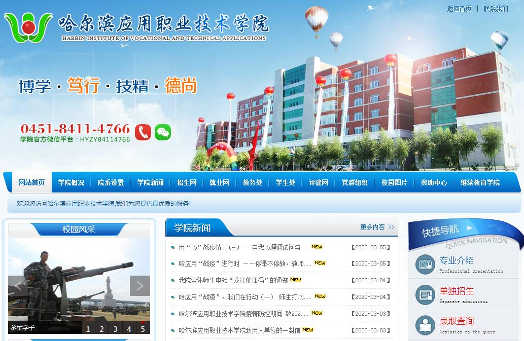 哈尔滨应用职业技术学院——在美丽的松花江畔、北国名城——哈尔滨,是在道里区机场路上一座充满朝气、蓬勃发展的高等院校,正在迅速崛起。我院是黑龙江省人民政府批准,哈尔滨市人民政府主管,国家教育部备案、独立设置、国家计划内统一招生,具有独立颁发国家承认学历文凭资格的全日制、综合性普通高等院校。现已成为一所以工科类学科为特色,以工、文、理、经、管多学科协调发展,着眼于培养经济社会发展急需的一专多能高级技能型人才的新型综合性国家普通高等院校。学院总占地面积24.8万平方米,总建筑面积13万平方米。校园内绿地、甬道、花坛、雕塑与错落有致的十几栋大楼交相辉映,在机场路旁形成一道独特的风景线,这里交通便捷顺畅,环境幽雅别致,空气清新宜人,是莘莘学子学习和生活的理想场所。学院各级领导和学科带头人由具有丰富高校管理经验、学术造诣的专家、教授担任;学院师资力量雄厚,有一支与专业设置相适应、素质优良的高水平专职教师和省内高校知名学者及教授组成的教师队伍。目前学院90%以上的课程由专职教师承担,在专职教师中副高级职称以上教师占专职教师总数的40%以上;既懂专业理论知识又懂专业技能的“双师型”教师占专业教师总数的80%。学院还从省内高校及企业中聘请了几十名经验丰富的教师、客座教授和企业家为学院的兼职教师,目前学院已经构建了一支梯队结构合理、特色突出、适应性强的专兼职教师队伍,切实实施“以师立校”的人才战略。学院每个班级都配有多媒体教学设备,班班实行多媒体教学,并拥有完善的校园网、图书馆、阶梯教室、400米国际标准化的塑胶草坪运动场、各类球场(馆)、学生餐厅、洗浴中心、超市和提供近万人的学生公寓等现代化生活服务设施;校内拥有标准化实验、实训场所二十几处,即:多媒体实验室、语音实验室、物理实验室、化学实验室、生物实验室、电子实验室、汽车维修实训中心、数控实训中心、焊接技术实训中心、建筑工程实训中心、印刷技术实训中心、电子技术实训中心、机电工程实训中心、模具实训中心、生物制药技术实训中心、计算机实训中心和会计模拟实训中心等;还拥有校外合作实习基地上百处,使各专业学生在校期间都有到对口企业参观学习和锻炼的机会;校企一体,产教结合、工学结合模式的办学特色。工学结合、校企合作,是高职院校遵从职业教育规律、凝练发展特色、提升办学水平、增强育人能力和服务社会能力的必由之路,创办的人才培养模式新、有特色或特色鲜明,培养出来的学生质量就高、能力就强、社会信誉就好,“出口就畅,进口就旺”。我院在办学之初就积极探索产教结合的路子,先后投资创办了现有八个系,四十几个专业,绝大部分专业实习实训基地建设工作任务,如建筑工程系,建筑工程技术、建筑装饰工程技术、室内设计技术、建筑电气工程技术、建筑工程管理、工程测量技术、房地产经营与估价、道路桥梁工程技术,工程造价,工程测量与监理、工程监理、安全技术管理等十几个专业实习实训建设。我们在省内外创办了海南春天房地产开发有限公司,哈尔滨建工集团海南分公司,海南圣达建筑工程有限公司,哈尔滨天宇工程监理有限公司海南分公司,海南金泰工程监理有限公司,哈尔滨春天实业发展有限公司,涵盖了所有建筑专业学科;印刷工程系的印刷技术和印刷图文信息处理专业,创建了哈尔滨春天印务有限公司,现有厂房一千多平方米,一台单色胶印机,一台北人四色胶印机,以及相配套的切纸机、打孔机、装订机、晒版机等,投入800多万元;汽车工程系的汽车检测与维修技术、汽车电子技术、汽车技术服务与营销、汽车运用与维修、汽车制造与装配技术、汽车整形技术、工程机械运用与维护等专业创建了哈尔滨盛世联华一站式汽车维修有限公司,现有厂房1500多平方米(不包括校内实训面积)投入1000多万元从汽车装饰维修保养检测一条龙服务;自动化系和机械工程系的数控技术、数控设备应用与维护、焊接技术及自动化、模具设计与制造、机械制造与自动化技术、电气自动化技术、机电一体化技术等专业创建了哈尔滨春天机械制造有限公司,哈尔滨华硕机械加工有限公司等实习实训工厂,现有厂房1500多平方米(不包括校内实训面积),现已购进一条生产住宅铁门的生产线,从车、钳、铆、焊的不同工位,从普通机床到数控机床,学生都可直接亲自动手完成,同时,我们正在与中国长春一汽、三大动力、哈飞工业等联合购进进口机床为上述几家企业来料加工。来锻炼我们学生的实际动手操作能力,同时我们正在与吉林大学机械工程学院数控装备研究所和浙江宁波、广东佛山等地企业商谈生产数控机床,十二五末投入生产;校企一体,产教结合、工学结合模式的办学特色使各专业实践教学环节占总学时的比重最低为55%,个别的专业高者达70%。培养学生实际工作能力,采取真刀真枪的办法进行实训,逐步做到了学校与企业的统一、教师与师傅的统一、学生与学徒的统一,使我院毕业生就像“工厂的产品一样,不合格不准出厂”,使他们毕业后成为抢手型的毕业生。学院建立了与各专业相配套的校外实习实训基地,为学生的实践提供了平台,使“教、学、练”有机结合起来。学院依企业促发展,企业靠学院教学、实