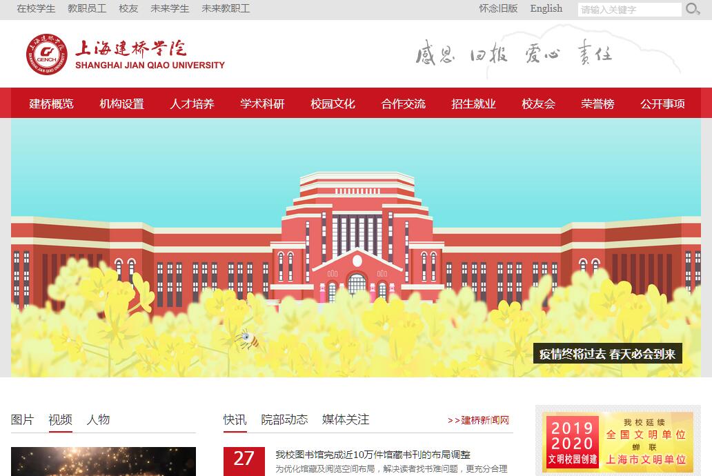 上海建桥学院(Shanghai Jian Qiao University),简称“建桥“,位于上海市浦东新区,坐落于东海之滨,美丽的滴水湖畔,是经上海市人民政府批准成立、国家教育部备案的一所以本科教育为主,培养生产、建设、管理、服务第一线应用型人才的公益性全日制民办普通高等学校,是教育部全国应用技术大学联盟和教育部非营利性民办高校联盟成员单位。同时是上海第一家获得国家自然科学基金项目依托单位、教育部人文社会科学项目、上海市哲学社会科学规划课题的民办高校。学校由周星增先生等一批热心教育和公益事业的温州籍企业家出资创办,2000年4月正式建校,2001年4月获批为上海建桥职业技术学院。2005年9月,成为以本科教育为主的全日制普通高等学校,并更名为“上海建桥学院”,2006年9月,首批本科生报到入学;2010年7月,学校被增列为学士学位授予单位。2015年2月,学校获得“全国文明单位。2015年秋,学校由浦东康桥整体搬迁至浦东临港。2017年5月,学校入选“上海市新增硕士学位授予单位立项建设单位“。截至2018年10月,学校教职工共有985人,全日制在校学生17808人,其中本科生15396人,专科生2412人,外国留学生100余人;学校总投资已愈28亿元人民币,校园占地面积800亩,总规划建筑面积48万平方米,已建成建筑面积近38万平方米,教学科研仪器设备总值达16679.02万元人民币,馆藏纸质图书146余万册;教学科研仪器设备17000台(件)。设有10个二级学院,本科专业30个,专科专业12个。