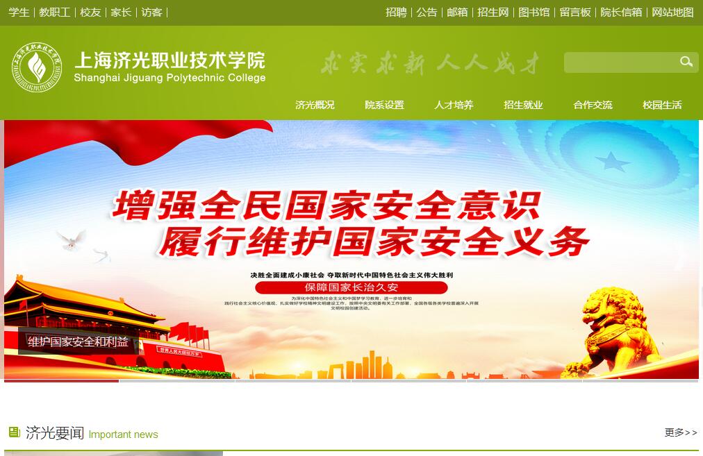 上海济光职业技术学院是1993年由同济大学退休教师举办,经上海市人民政府批准成立,2001年纳入全国普通高等教育统一招生计划的全日制普通高等院校。学院实行董事会领导下的校长负责制。首任董事长为两院院士、同济大学原校长李国豪,第二任董事长为原上海市副市长夏克强,现任董事长为原同济大学党委书记周家伦。学院坚决贯彻执行党和国家的教育方针政策、民办高等教育的相关法律规定,一贯坚持依法办学和公益性、非营利性办学原则,不断强化办学规范管理,杜绝各类违反法规行为。学院资产均系社会公益性资产,并始终归属学院名下。学院源于同济、院长来自同济、师资主引同济、办学依托同济,教学管理秉承同济大学严谨求实的优良传统,逐步形成与同济大学建筑建工等相关专业本科人才错位发展的高技能人才培养模式。学院坚持以就业为导向的宗旨,注重校企合作、工学结合,在教育教学中坚持 求实求新、人人成才的办学理念,坚持高职教育办学定位,为社会主义现代化建设培养高素质技能型专门人才。2010年我院被评为中国民办高等教育优秀院校。2012年、2014年、2016年连续三届被评为上海市文明单位。2016年7月顺利通过上海市特色高等职业院校建设项目验收并获得“优秀”等第。学院立足上海,辐射全国,专业建设以土木建筑类专业为龙头,汽车类专业为特色,培养服务于土木建筑、财经、汽车、计算机、艺术设计、交通运输、护理等7大类专业领域的高素质技能型专门人才。学院实行院系两级管理,持续加强师资建设,深化专业建设、改革,推进专业结构优化。建筑仿真、汽车技术、建筑设计、建筑工程实训基地建设等6个项目先后列为上海民办高校教学高地建设政府资助项目;景观设计、外贸单证实务、建筑设计基础—建筑初步等9门课程为上海高校市级精品课程。学院从建筑类2个专业、百余名学生开办;2001年纳入统一招生计划时设12个专业,计划招生1360名;现设建筑、建工、经管、机电等4系,护理1个二级学院,基础、思政等2部。2017年招生专业24个,已在计划内面向全国28个省(市)、自治区招生,现有全日制在校生5700余人,毕业生累计20000余人。学院在近几年高考统一招生中,计划报到率和录取报到率均在上海同类民办高校中名列前茅。学院加强实践教学,建立一批校外实习基地,并与上汽集团、建工集团、泛亚景观设计(上海)有限公司、锐捷网络有限公司、光大银行上海分行等知名企业签订了合作办学协议。学院大力实施双证书制度,取得明显成效,2017届护理专业毕业生获护士资格证的比例达95%。学院2017届毕业生就业率截至2017年8月31日已达99.74%,其中17个专业的毕业生就业率为100%。众多知名企业等成为我院毕业生就业单位,如:同济建筑设计研究院、泛亚景观设计(上海)有限公司、上海市园林工程有限公司、上海宝钢工程设计院、中国第二十冶金建设公司、上海唐神广告有限公司、上海海运集团、上海佑通国际货运代理公司、上海东亚会计事务所有限公司、汇丰银行、建设银行、交通银行、工商银行、光大银行、招商银行、民生银行、中国移动有限公司、瑞金医院、新华医院、华山医院等。学院本部(宝山校区)座落在上海市宝山区水产路,占地220亩,教学大楼、实训大楼、图书馆、信息中心、语音室、学生活动中心、室内体育馆、风雨操场、标准田径场、现代学生公寓、7000平米学生食堂、公共浴室等教学和学生生活设施一应俱全,校区公共交通抵达便捷,地铁一号线宝安公路站离学院仅10分钟步程。学院分部(杨浦校区)座落在上海市杨浦区武东路,占地30亩,建有教学大楼、学生宿舍、食堂、浴室和非标运动场等,校区位于复旦大学、上海财经大学和同济大学附属肺科医院之间,有浓郁的文化学习氛围,公共交通抵达便捷。