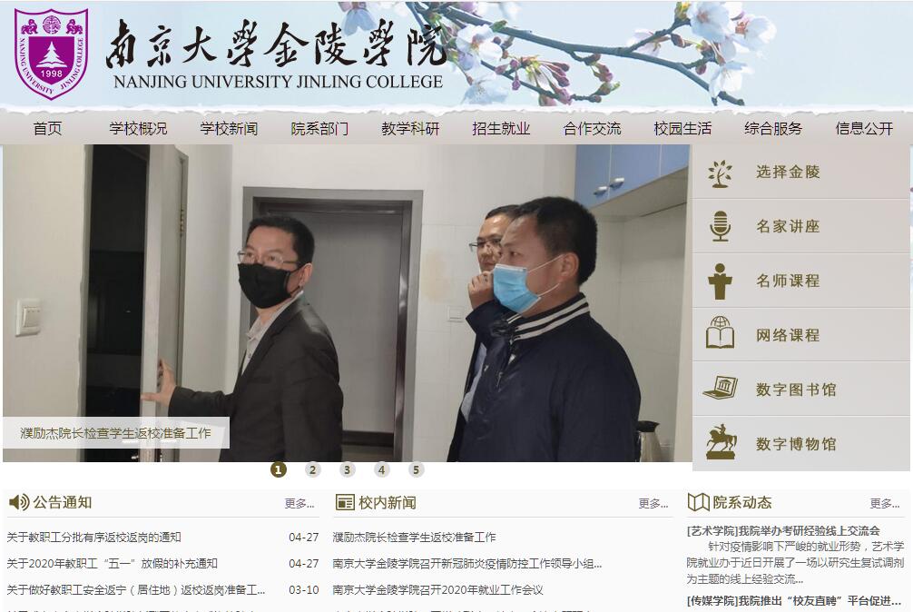 长江之滨,龙王山下,在国家级南京江北新区内,南京大学金陵学院正在崛起。这里铭刻“诚朴雄伟、励学敦行”的大学校训,这里坚守“嚼得菜根,做得大事”的精神家园。在这里,花香与书馨是不变的风景,特色与创新是永恒的追求。学校创办于1998年,坐落在南京大学浦口校区,占地1011亩,校舍31万平米,师生员工12000人。学校的举办方——百年名校南京大学,是直属教育部的重点综合性大学、国家首批“211工程”“985工程”“2011计划”和“双一流”建设高校,过去一个多世纪在人才培养、科学研究、社会服务和文化传承创新等方面成果卓著,享誉海内外。南京大学党政领导的高度重视,各院系、部门的关心支持,雄厚的办学支撑,为学校事业发展提供了强有力的保障。依托南京大学的优质教育教学资源,学校采用全新的办学机制和模式,立足江苏,面向全国,牢固树立“特色发展、争创一流”的办学思想,探索创新高水平应用技术型大学的办学路径,积极推进产学研深度融合人才培养模式改革,致力培养具有创新精神的高素质应用型人才。学校自创办以来,综合办学水平稳步提升,社会美誉度与日俱增。近年在同类院校中招生录取线高居全省榜首,综合评价稳居江苏第一,已经迈入全国一流行列。学校大胆改革,积极探索科学发展道路,实行理事会领导下的院长负责制和院系二级管理体制,先后被列为“江苏实施国家教育体制改革试点高校”“国家事业单位法人治理结构建设试点单位”“江苏省服务外包人才培养试点高校”“南京市服务外包人才培养基地”,被评为“江苏省教学工作先进高校”“江苏省平安校园建设示范高校”“江苏省五四红旗团委”“江苏省高校后勤工作先进集体”“全国高校伙食工作先进集体”等。学校始终坚持以学科专业建设为龙头,以“强化应用、注重创新、交叉融合、彰显特色”为专业建设指导方针,紧密对接产业链、创新链,不断探求新的应用学科增长点。现有传媒学院、商学院、外国语学院、信息科学与工程学院、化学与生命科学学院、城市与土木工程学院、艺术学院等七个二级学院,下设27个系、43个专业,文理工医经管艺等多学科并举,并培育了一批品牌特色专业,历次参加全省同类院校专业建设抽检均获第一,在2018年全省独立学院专业综合评估中,5个参评专业全部获评星级专业。学校还策划了一系列重要学术活动,增强在各个学科领域的国内外影响:成功举办华语大学生微电影节、中国水中机器人大赛暨首届国际水中机器人公开赛、西班牙拉丁美洲文化周等重要活动,中央电视台、人民网等主流媒体竞相报道,引发社会热烈关注。连续5年主办江苏省中小企业景气指数发布会,成为应用技术型大学有效融合人才培养、科学研究、社会服务三大功能的生动范例。在接收南京大学一批国家级实验教学示范中心的基础上,学校投资数千万兴建了媒体融合、量化金融、同声传译、现代通信技术、虚拟城市、装配式建筑BIM实验室、护理教学技能、数字媒体等一批理念先进的现代化实验室,建立了200余个产学研平台和校内外实习实践基地,与中国联通、香港有利、方正电子等知名企业深度开展校企合作。学校始终坚持以队伍建设为核心,精心打造了一支师德高尚、业务精湛、结构合理、充满活力的高水平教师队伍,众多教学名师与知名学者耕耘在教学第一线,由中科院院士郭子建任主任委员、南京大学资深教授组成的教学督导委员会全面指导教学工作,与广大教师共同维护着教学质量生命线。在引进高水平学科带头人的同时,学校采取多元化培养举措,成立教师发展中心,重点推进青年骨干教师培养,结合健全干部选拔任用机制、实施“优秀辅导员成长计划”,形成教职工多渠道发展的“三提升”计划。一批优秀青年教师迅速成长,多人入选江苏高校“青蓝工程”和“国内访问学者计划”。随着南京大学优秀教师、双师型师资和外籍教师的加盟,学校师资队伍不断优化。秉承南京大学的优良传统和人文精神,学校开设“金陵大讲堂”,每年举行高水平讲座近百场,两院院士、知名学者和业界名家、社会名流以学术风范和人格魅力感染着莘莘学子。一批南京大学中青年管理骨干构成了学校管理层的中坚力量,他们开拓创新,锐意进取,学校事业得以青蓝相继、薪火相传。学校始终坚持以人才培养为根本,不断推出提高培养质量的新举措。2011年承担江苏实施国家教育体制改革试点的“全面学分制改革”项目,充分借鉴南京大学“三三制”本科教学改革的成功经验,在优质课程资源等方面共建共享,实现学生的个性化发展。近年来实施“专业+”行动计划,构筑“新闻无人机”等跨学科交叉融合人才培养实验区,同时加强创新创业教育,以“装配式建筑”等为切入点探索校企合作协同育人机制,创新打造一体两翼的产学研深度融合人才培养模式。学校每年投入专项经费组织开展教学改革,承担多项国家课题立项项目和教育部教育改革创新项目,获评江苏省教学成果奖和省级重点教材,出版了《工程数学》等20余部契合应用型人才培养目标的精品教材。学校于2015年成立应用技术研究院,与南京大学合作开启专硕培养新模式。与此同时,科学研究工作深入推进,取得了国家自然科学基金项目、教育部人文社科项目等一系列突破进展。由艺术学院主创
