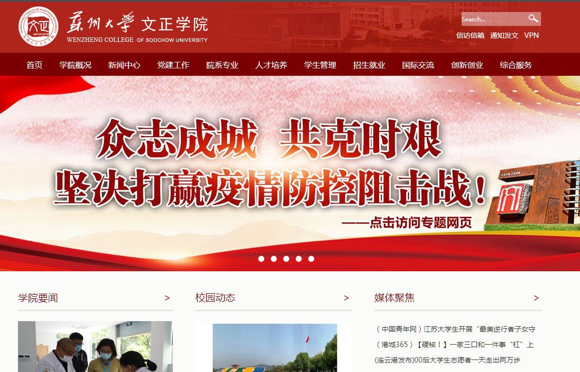 苏州大学文正学院,中国第一所综合性独立学院,同时也为纪念谥号为“文正”的历史名人范仲淹。被誉为江苏省最美的十所独立学院之一。学院位于苏州国际教育园,西傍吴山,北靠“夜半潮生看串月”的国家级风景区石湖景区和国家级风景区上方山国家森林公园,景色优美,环境怡人,学习氛围浓厚;文正学院已经是江苏省规模最好的独立学院,各种运动设施篮球场、田径场、网球场、健身房、活动中心等一应齐全;优良的基础设施为学生提供了良好的生活条件。苏州大学文正学院是在我国高等教育大变革、大发展背景下应运而生的。她是苏州大学积极推进教育创新、大胆探索和实践高等教育多元化发展新路径的产物。学院在1998年12月经江苏省教育委员会批准成立,时为公有民办二级学院,并于2005年获准改办为独立学院。2012年8月,经省政府批准,学院在省内独立学院中率先由民办非企业单位法人登记为事业单位法人。 学院位于古城苏州,坐拥上方山国家森林公园和“夜半潮生看串月”的石湖景区,历史人文资源丰富,尊师重教风气浓郁。学院图书馆是“建筑界诺贝尔奖”——普利兹克奖获得者王澍的代表作,其巧妙融合“山”“水”概念并深涵造园思想,蜚声海内外。学院注重对学生进行“文者文章、正者道德”的精神引领,使得“先天下之忧而忧、后天下之乐而乐”的责任担当成为全院上下的一致追求。学院将改革创新作为事业前进的指导思想,将尊重学生的个性发展作为教育教学的基本前提,将多元化人才培养作为坚定不移的中心工作,充分依托苏州大学的优质资源以及长三角地区的区位优势,为经济社会发展输送优秀的应用型本科人才。学院在校生万余人,现设有43个本科专业(含方向),涵盖法学、文学、经济学、管理学、理学、工学、艺术学等多个学科;教育教学设施完备,功能齐全,建设标准高,使用效果好;顺应数字化潮流,借力信息化建设,智能化校园建设取得阶段成果,校园管理创新成效显著。学院努力改进大学生思想政治教育的方式和方法,学生党建的科学化、专业化水平高;为学生的成长成才全面创造条件,人才培养方案个性化,教育教学精品化;注重学生自我管理能力、自我服务能力、学术科研能力以及社会活动能力的培养,通过行为量化考核促进学生的养成教育;大力推进学生职业生涯规划,努力拓宽创新创业视野,创业就业工作同步提升。经过十几年的发展壮大,学院在教育主管部门视野里具有着示范意义,在兄弟院校办学过程中具有着借鉴价值,在学生家长面临选择时具有着优先地位。立足“十二五”,面向“十三五”,学院上下齐心协力求创新,一心一意谋发展,正朝着国内一流独立学院的目标而奋发努力。