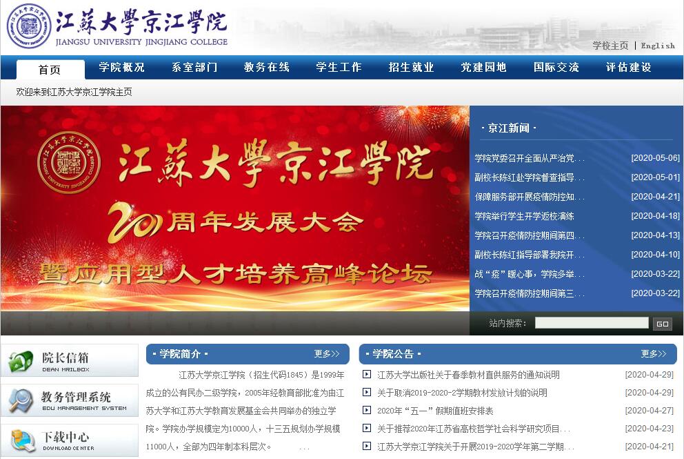 江苏大学京江学院(招生代码1845)是1999年成立的公有民办二级学院,2005年经教育部批准为由江苏大学和江苏大学教育发展基金会共同举办的独立学院。学院办学规模定为10000人,十三五规划办学规模11000人,全部为四年制本科层次。学院依托具有百年办学底蕴的母体江苏大学,共享母体6万多平方米、藏书260万册的国内一流图书馆,享有各类一流的实验室和工程训练中心。学院现有39个专业及方向,涵盖理、工、文、经、管、医、艺等7大学科门类,各类建筑面积30余万平方米,教学计算机千台,多媒体教室10500座,语音实验室700座。2018年建成投入使用的新校区位于镇江市丹徒新区长香路十里长山高校园区,占地面积近千亩,建筑面积27万平方米,建有3.5万平方米的图文信息中心。新校区坚持高起点规划,高水平建设,以人性化、现代化、生态化为指导思想,以传承文脉、尊重自然为基本原则,力求打造一所环境、设施一流,数字化、智能化、生态化的现代绿色低碳校园。搬迁至新校区后,我院将同时共享母体江苏大学和镇江市高校园区的双重一流教育资源、公共设施和浓郁的人文氛围。学院牢固确立“依托母体、立足江苏、面向全国、服务经济、高起点、创特色、争一流”的办学思想,追求卓越的办学理念,探索新的人才培养模式,充分发挥、优化组合“公有”优势和“民办”活力,按照“基础扎实、知识面宽、素质高、能力强”的要求培养造就了大批基础理论扎实、专业知识结构优化、实践能力突出,德、智、体、美全面发展,具备良好职业道德、社会责任心和创新精神的高素质应用型人才。办学以来,学院不断改革创新,人才培养硕果累累。荣获江苏省教育教学成果一等奖。在国家级和省级各类学科、专业竞赛中,每年均有100多人分获一、二、三等奖。我院学子首次参加美国大学生数学建模大赛并获得二等奖,在“学创杯”2017全国大学生创业综合模拟大赛获得一等奖,在第八届江苏省大学生机器人大赛(探索者无人车越野)本科组分获一、二等奖。2017年学院学生以第一作者发表论文101篇。近几年,学院毕业生CET-4通过率稳定在85%以上。毕业生考研达线430多人,录取国内外高校近300人,报考人数、上线人数及录取人数逐年上升、屡创新高,部分优秀学生进入华盛顿大学、南加利福尼亚大学、悉尼大学、伯明翰大学、中山大学、南京航空航天大学等境内外名校深造。学院与美国、德国、英国、奥地利、日本、韩国等十多个国家的数十所高校建有长期合作关系,互相选派国际交流生。学院历届毕业生就业率都在90%以上。面对高等教育大众化、国际化的新形势,江苏大学京江学院将紧紧依托江苏大学雄厚的办学资源,坚持育人为本、质量立院、特色兴院,继续推进导师制,实行主辅修制,并开设第二专业,实行自主选择专业,完善学分制,构建科学严格的质量监控体系和充满生机活力的运行机制,进一步提高教学质量,切实增强学生立足社会、走向未来的竞争能力和适应能力。学院积极探索和实践中国特色的高等教育多元化发展模式,努力建设成为以工科为主,文、管、经、医多学科协调发展,国内一流的应用技术型本科院校,培养高层次、高素质、创新性、国际化应用技术型职业人才,为地方经济社会发展服务。