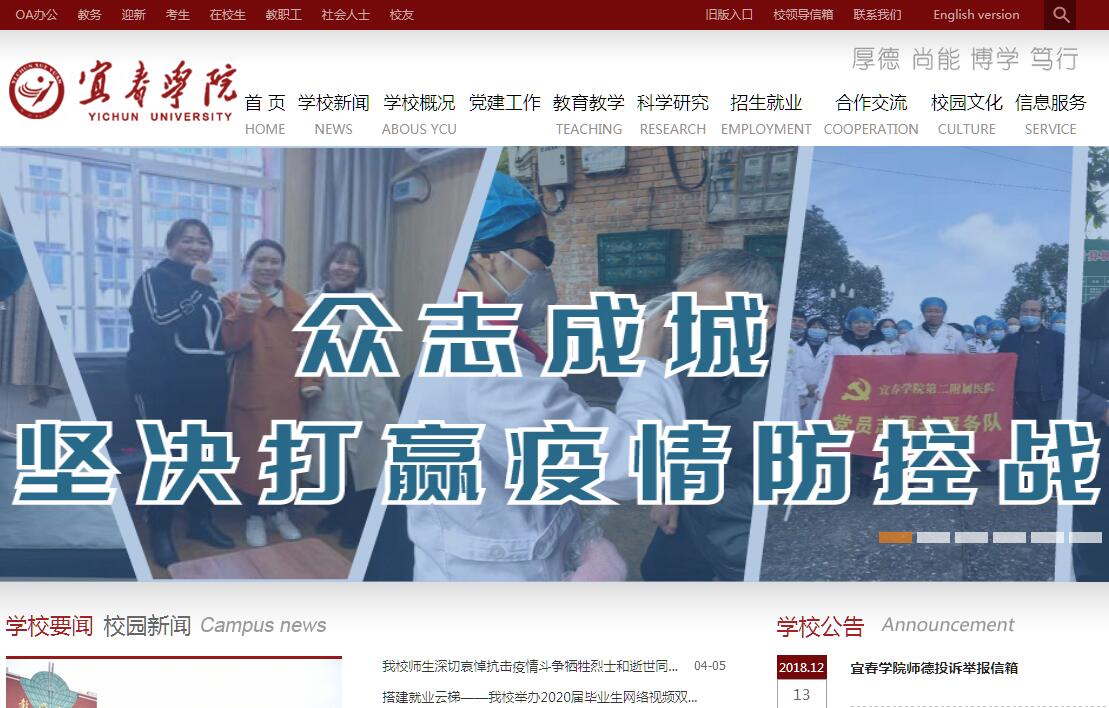 宜春学院地处赣西中心城市——江西省宜春市。宜春自古就有“江南佳丽之地,文物昌盛之邦”的美誉,是国家第一批生态试点城市、国家园林城市、全国绿化模范城市、中国优秀旅游城市和全国卫生城市。宜春风光旖旎,交通便利,沪瑞高速、杭长高铁、浙赣铁路穿城而过,明月山民用机场四通八达。宜春学院的前身是1958年创办的宜春大学。2000年1月,经国家教育部批准,由原宜春师范专科学校、宜春医学专科学校、宜春农业专科学校、宜春市职工业余大学合并升格为全日制公办本科院校。学校现有本校区和北校区两个校区,占地2047亩。全日制在校生近1.9万人。现有教职工1409人,其中,专任教师1026人,具有高级专业技术职称的教师占专任教师比例达42%以上,博士、硕士占专任教师比例72%以上;学校外聘中国工程院院士、国家杂交水稻研究中心主任袁隆平等100多名高级专家为客座教授。近年来,学校的办学声誉得到提升。2011年10月,经国务院学位委员会批准,我校被批准为“服务国家特殊需求项目——学士学位授予单位开展培养硕士专业学位研究生试点工作单位”。2015年初,获批江西省首批转型发展的十所试点高校之一。2017,我校顺利通过了教育部组织的临床医学专业认证。我校连续4年获得省综治先进单位,连续多年获得节能、计划生育、信访等方面工作先进单位。学校现有18个教学院,有教育学、医学、农学、文学、理学、工学、经济学、法学、管理学、艺术学10大学科门类,有省级“十二五”重点学科4个。有省重点实验室(研究中心)3个、省高校重点实验室(工程中心、重点基地)4个、省文化艺术科学重点研究基地1个、省2011协同创新中心1个。学校自合并建校以来,努力提高办学层次。从以往的以专科专业为主,发展到现在以本科专业为主,计划在2018年取消专科专业招生。现有74个本科专业,其中,国家特色专业2个,省特色专业8个;国家 “卓越人才教育培养计划”专业2个,省 “卓越人才教育培养计划”试点专业5个;国家综合改革试点专业1个,省综合改革试点专业4个。有博士后科研工作站1个,院士工作站点2个。作为赣西地区办学历史最悠久的综合性本科院校,宜春学院始终坚持立德树人,秉承“厚德、尚能、博学、笃行”的校训,围绕建设有特色、高水平的地方应用型大学要求,践行“地方性、应用性、开放性”办学理念,致力于培养“五有”人才。建有国家级大学生校外实践基地1个,省级人才培养模式创新实验区2个,省级高校实验教学示范中心3个。注重第一课堂和第二课堂的有机结合,建有100余个学生社团;建有尚能众创空间、大学生创业孵化中心、天工创客空间等一批创新创业平台;先后建设了19个校外创新创业实践基地和示范园,111个校外实习实训基地,36个国家级大学生创新创业训练计划项目。我校大学生创新创业孵化基地成为公布的10个江西省大学生创新创业示范基地之一。学校主动对接“一带一路”战略,坚持走国际化办学道路。先后与美国、英国、法国、德国、加拿大、澳大利亚、俄罗斯、韩国、日本、印度、马来西亚等10余个国家和地区的高校、科研教育机构开展合作交流办学,推进了交换生、教师研修等项目的实施,为师生共享国(境)外优质教育资源搭建了广阔平台。目前,学校在校留学生人数有484人,达到招收留学生以来最大规模。留学生在我校接受临床医学专业教育。临床医学是我校办学历史最长、办学资源较优、文化底蕴颇为深厚的传统优势专业之一,其办学历史可追溯到1958年成立的南昌专区医学专科学校,之后又经历了江西医学院宜春分院、江西省宜春医学高等专科学校两个办学时期。2000年宜春学院成立之后,临床医学本科专业成为宜春学院首批经教育部批准的本科专业之一。在近60年的发展历程中,我校临床医学专业建设与地方医疗卫生事业同发展,共进步,众多毕业生成为赣、浙、粤等地区尤其宜春市下辖县市区各级医疗卫生单位的业务骨干,其中不少担任了医疗卫生单位的管理职务,为地方医疗卫生事业发展作出了积极贡献。近年来,特别是党的十九大以来,宜春学院认真学习贯彻落实党的十九大精神,以习近平新时代中国特色社会主义思想为指导,坚持以深化学校体制机制改革为主线,着力深化学校内涵式高质量发展,为实现更名“宜春大学”的目标夯实基础,主动融入宜春市“三个中心一个基地”建设,奋力谱写宜春学院发展新篇章。