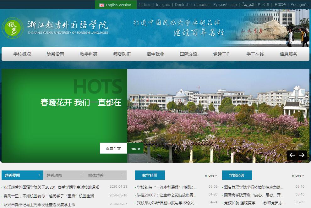 浙江越秀外国语学院是经国家教育部批准设立的全日制普通本科高校。学校坐落于中国首批历史文化名城、著名的江南水乡、鲁迅故里——浙江绍兴,始创于1981年,2008年经国家教育部批准升格为本科高校。学校现有稽山、镜湖两个校区,占地面积近1300亩,校园建筑面积42万余平方米;图书馆馆藏纸质图书182万余册,电子图书114余万册。学校坚持“人才强校”战略。现有教职工1000余人,其中专任教师中硕士、博士学位教师占了80%以上,高级职称教师占比约34%。学校正在实施“高层次人才引进计划”、“博士引进和培养‘双百工程”、“中青年骨干教师培养计划”、教师国境外研修计划、设立“张巨昌教育奖”等,为教师发展搭建多维度、多层次的平台,努力为学生的成长成才和学校的建设发展提供强有力的人才保障。目前拥有来自美国、英国、加拿大、韩国、日本等国家的外籍教师百余名,其中博士外教25名。学校设有英语学院、东方语言学院、西方语言学院、国际商学院、网络传播学院、中国语言文化学院、酒店管理学院、印第安纳波利斯大学国际学院、留学生教育学院、继续教育学院、马克思主义学院等11个二级学院,开设有34个本科专业,涵盖文学、工学、经济学、管理学、艺术学等5个学科门类,含英语、法语、德语、俄语、西班牙语、意大利语、葡萄牙语、日语、韩语、阿拉伯语、印度尼西亚语、泰语、捷克语等13个外语语种,是目前浙江省开设外语语种最多,也是省内唯一开设印度尼西亚语和泰语专业的本科高校,在小语种外语人才培养上具有丰富的办学资源和品牌优势。学校已形成了以文学为主干,经济学和管理学为两翼、多学科融合协调发展的学科专业布局。外国语言文学是浙江省一流学科,外国语言学及应用语言学、法语语言文学为绍兴市重点学科;朝鲜语专业为浙江省重点专业和省“十二五”优势专业,英语、法语、传播学、国际经济与贸易4个专业为浙江省新兴特色专业,英语和日语2个专业为绍兴市特色(重点)专业。学校是“联合国学术影响”组织成员,科研、教研水平不断提升。2017年学校立项主持国家社科基金9项(其中重点项目1项)、省部级科研项目12项。“东北亚研究中心”是教育部“国别和区域研究中心”基地(备案)。网络“舆情研究中心”、“大禹与中国传统文化研究中心”是绍兴市哲学社会科学重点研究基地,“大禹与传统文化研究创新团队”是绍兴市重点创新团队。学校教学设备先进完备,建有1个省级外语实验教学中心,4个市级实验教学示范中心,配备有同声翻译实验室、语言实验室、国际经济与贸易专业实验室、工商管理专业实验室、网络编辑专业实验室、视频图片编辑专业实验室等教学实验设施设备;建有小语种外语学习沙龙、外语文化体验室、日本茶道馆、实验酒店以及SPT外语文化街等体验异国文化的校园文化设施;建有创业学院,大力拓展校外教学实习实训基地,为实践教学创造了完备的条件。学校以“打造中国民办大学卓越品牌,建设百年名校”为愿景,坚持“应用型、国际化、高水平”的办学定位和“志存高远、脚踏实地,立足平凡、追求卓越”的信念,坚持“创新、协调、绿色、开放、共享”的发展理念,以“规范治校、质量立校、人才兴校、科研强校、特色建校”为办学指导方针,重点推进创新驱动战略、“外语+”战略、学科差异化发展战略、人才强校战略、国际化特色战略等“五大战略”,努力培养具有“国际视野、中国情怀、社会责任感”的应用型复合人才。近年来,学校致力于探索与实践SPT应用型人才培养体系,全面实施“外语+”的人才培养战略,让外语专业的学生具备扎实外语专业知识的同时,比较系统地掌握商务、经济、管理、新闻传播等方面的知识;非外语类专业的学生在学好本专业的同时,比较全面地掌握外语应用能力,以满足经济 社会发展对多样化复合型人才的需求。由于人才培养定位准确,我校毕业生就业率连续十年保持浙江省高校前列,毕业生质量受到社会和用人单位的充分肯定。学校大力推进国际化特色战略,国际合作办学成果显著。在浙江省教育厅对外发布的浙江高校国际化总体水平排名中,学校连续三年在“浙江省其他本科院校国际化总体水平”排名前茅。目前学校的国际合作项目已经覆盖13个外语语种,与美国、英国、加拿大、澳大利亚、新西兰、俄罗斯、法国、德国、西班牙、意大利、韩国、日本、新加坡、波兰、台湾地区等27个国家和地区的120所大学或机构建立了实质性友好合作关系,每年派出700余名学生出国(境)进行长短期语言文化交流,开展本科双学位、本硕连读等留学项目;每年招收外国留学生400名左右。在“和成·育秀”校训和“自信、和谐、竞成、人文”的校园文化引领下,学校开展具有国际特色、丰富多彩的学生活动,组建了浙江省高校第一支大学生教官队,目前有学生教官200余人。大学生教官队承担了学校每年的新生军训任务,积极参与班级管理,同时也成为践行社会主义核心价值观的标杆和校园文化建设的一道亮丽风景线。2014年9月,浙江省军区教导大队授予学校为全省唯一的大学生教官培训中心——“浙江省国防教育基地大学生教官培训中心”。2017年,学校被教育部评为“国防教育特色学校”。学校倡导“奉献、友爱、互助、进步”的